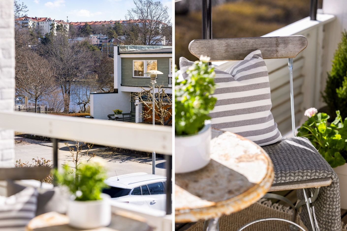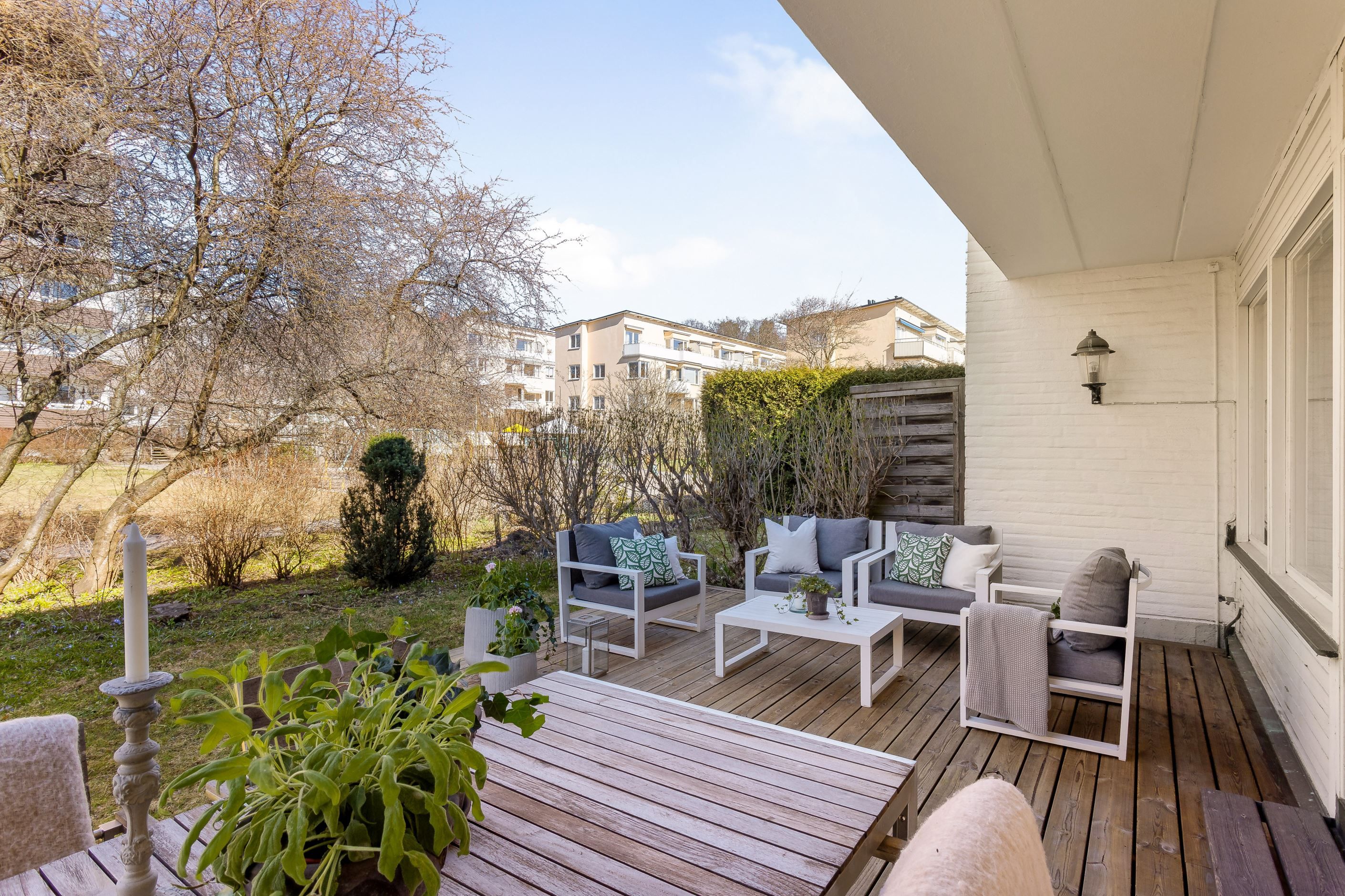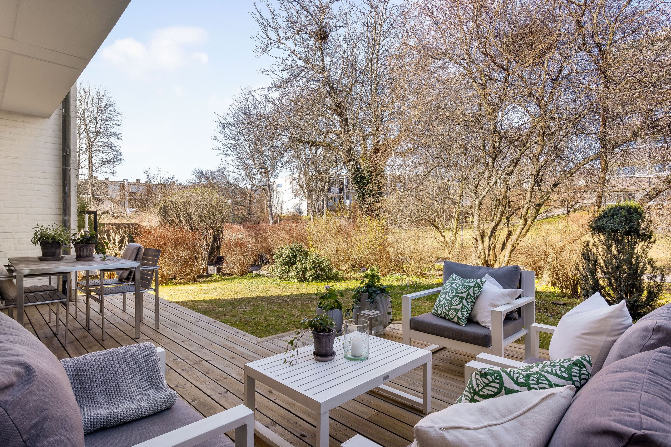 Sammanfattningsvis ett lugnt och ogenerat beläget boende i ett välvårdat och grönt område. Inbjudande entré, stilfull i skifferbelagd, där verandan erbjuder plats för sittgrupp. Stensatt gång leder runt huset till skyddad uteplats, ett extrarum den varma årstiden. Här slår eftermiddags- och kvällssolen ner. Gräns mot allmänning, en härlig park med lekplats och ytor för brännboll. Täta häckar ger en skyddad och barnvänlig miljö. Plan gräsmatta och stor trallbelagd uteplats möter rabatter med perenner. Mälaren med bad, vackra promenadvägar och båtliv alldeles invid huset. P-plats på fastighetsföreningen tomtmark direkt utanför huset. Matbutik, förskolor och välrenommerade skolor på nära håll. Vid Ålstens torg, en station med spårvagnen eller ett trevligt mål på långpromenaden, finns flera småbutiker. Alviks Torg håller med ett stort utbud av närservice samt T-bana/Tvärbana. Gångavstånd till 12:ans spårvagn och ca 20 minuters pendelavstånd till stan.