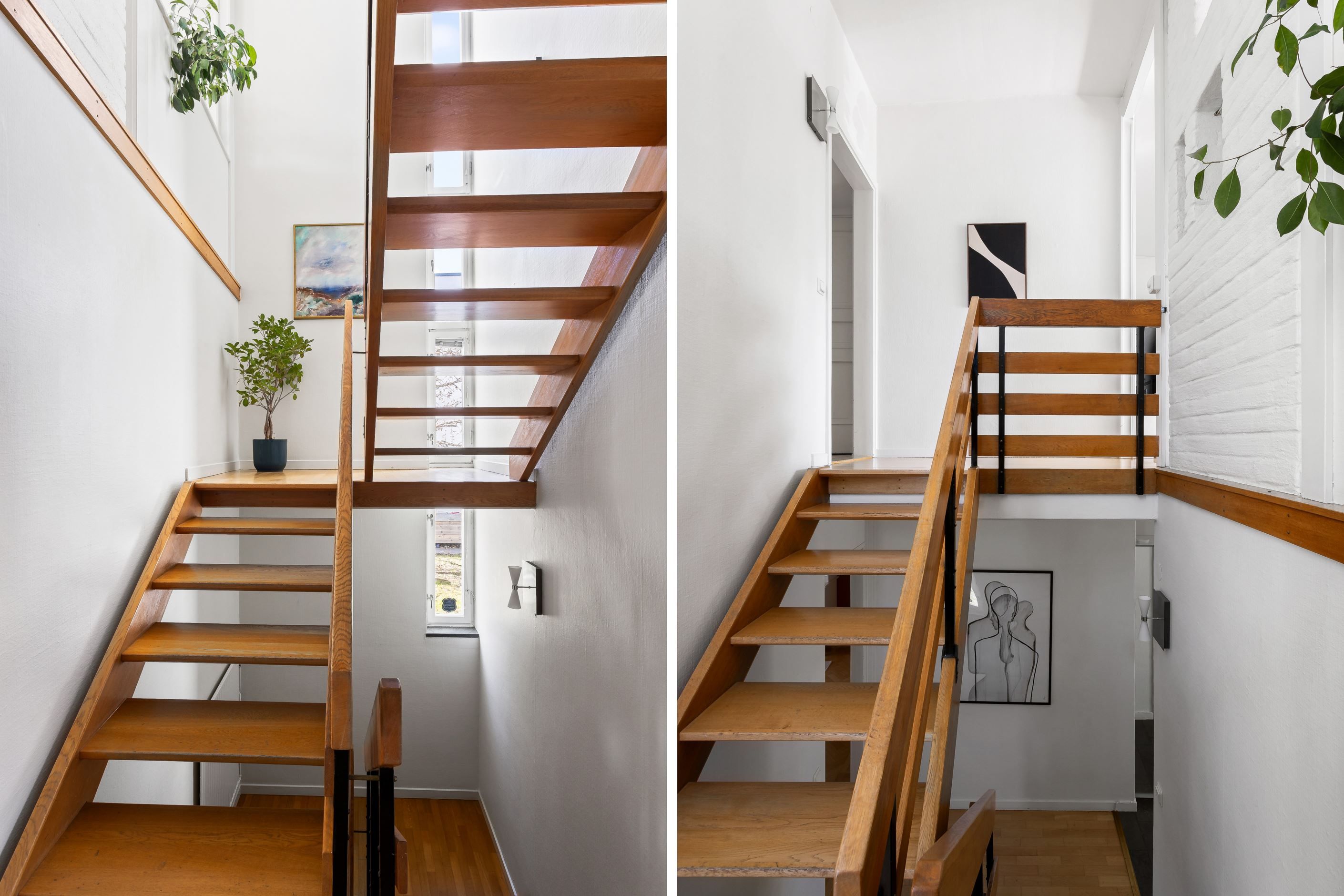 Öppet trapphus med ektrappa förbinder våningsplanen. Trapphuset har generösa avsatser, bra räcken och fönster från källatrappen och upp vilket ger mycket ljus till ytan.