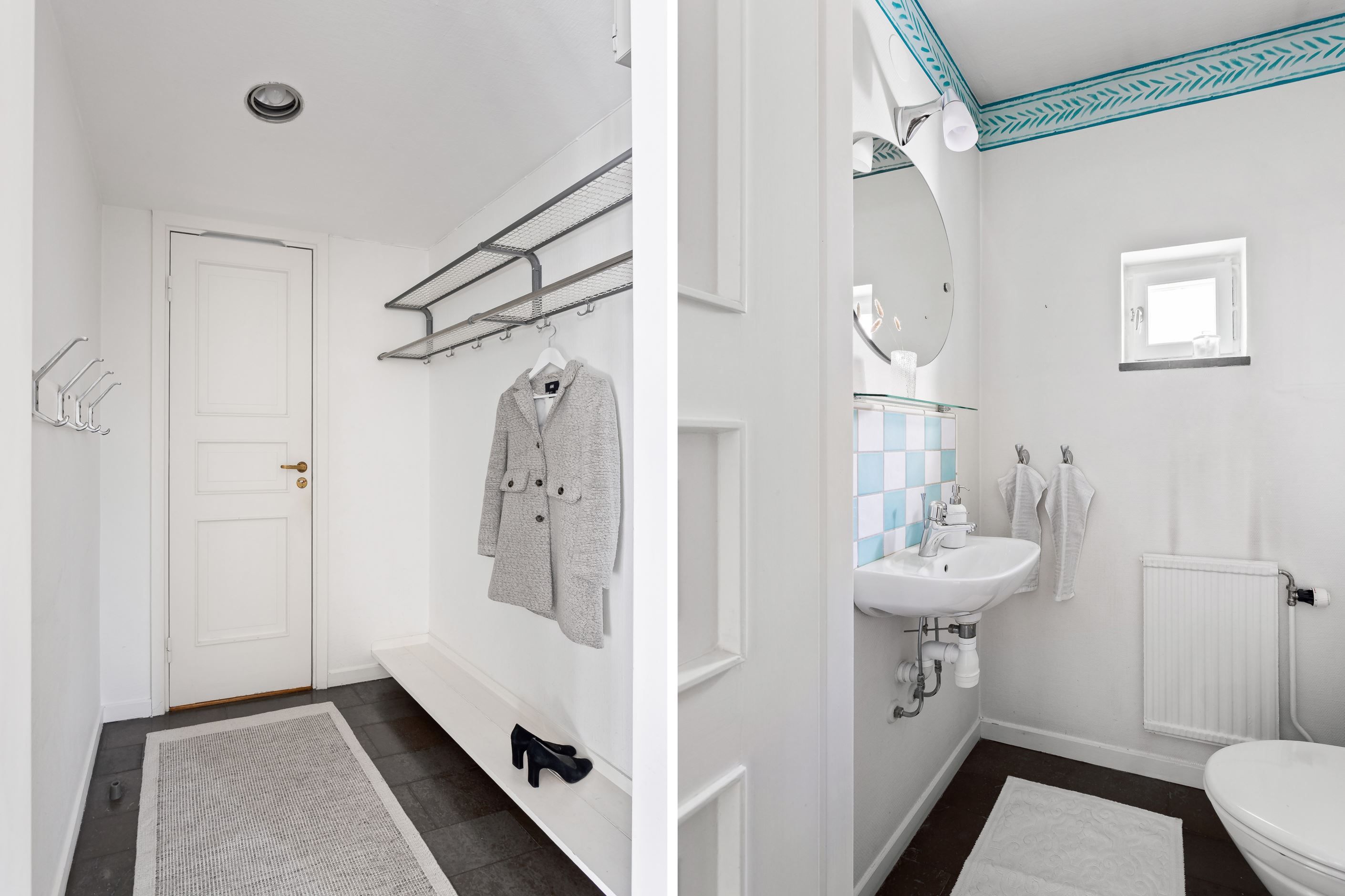 ENTRÈPLAN rymmer en möblerbar hall med kalkstensgolv i original, 2 sovrum, matrum med ekparkett samt utgång till ogenerad tomt och altan med kvällssol. Funktionellt kök med sjöglimt och matplats för vardagsmåltiden. Gäst-WC i anslutning till praktisk nisch för ytterkläder.