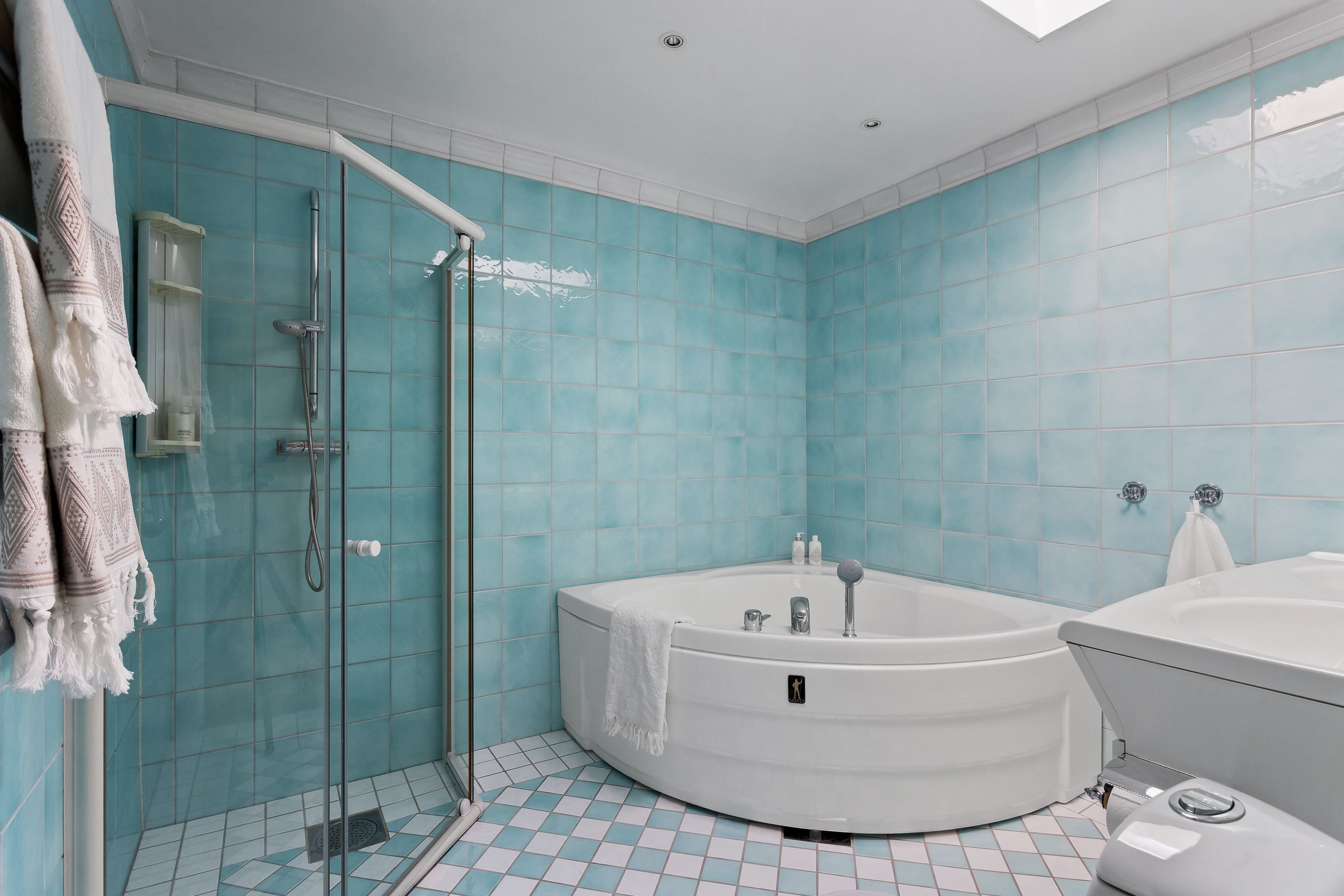 BADRUM - Badrum i anslutning till sovrummen. Rymligt och ljust tack vare takfönster. Helkaklat och mönstersatt i vitt och blått. Hörnbadkar, separat duschhörna samt dubbelhandfat och WC.