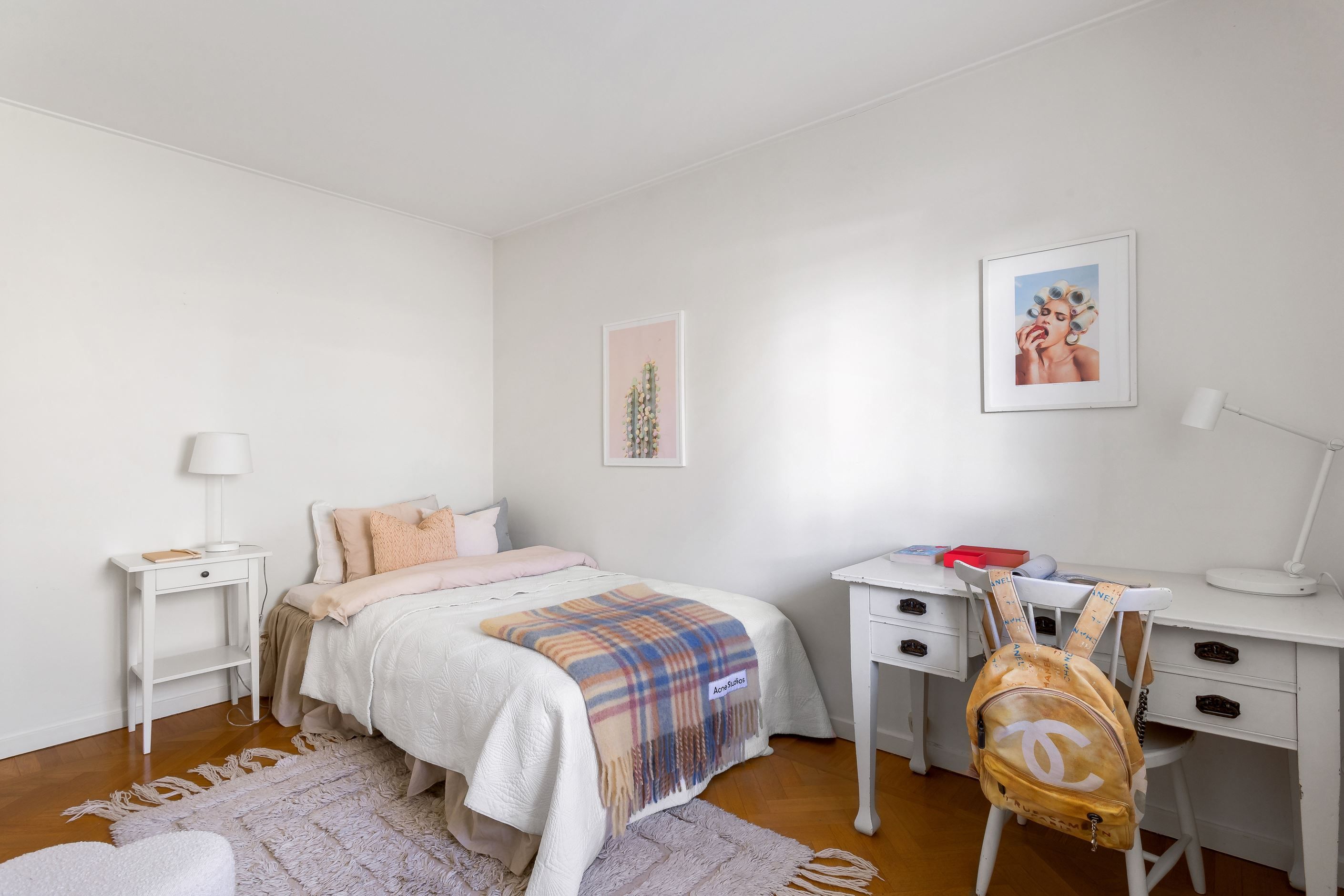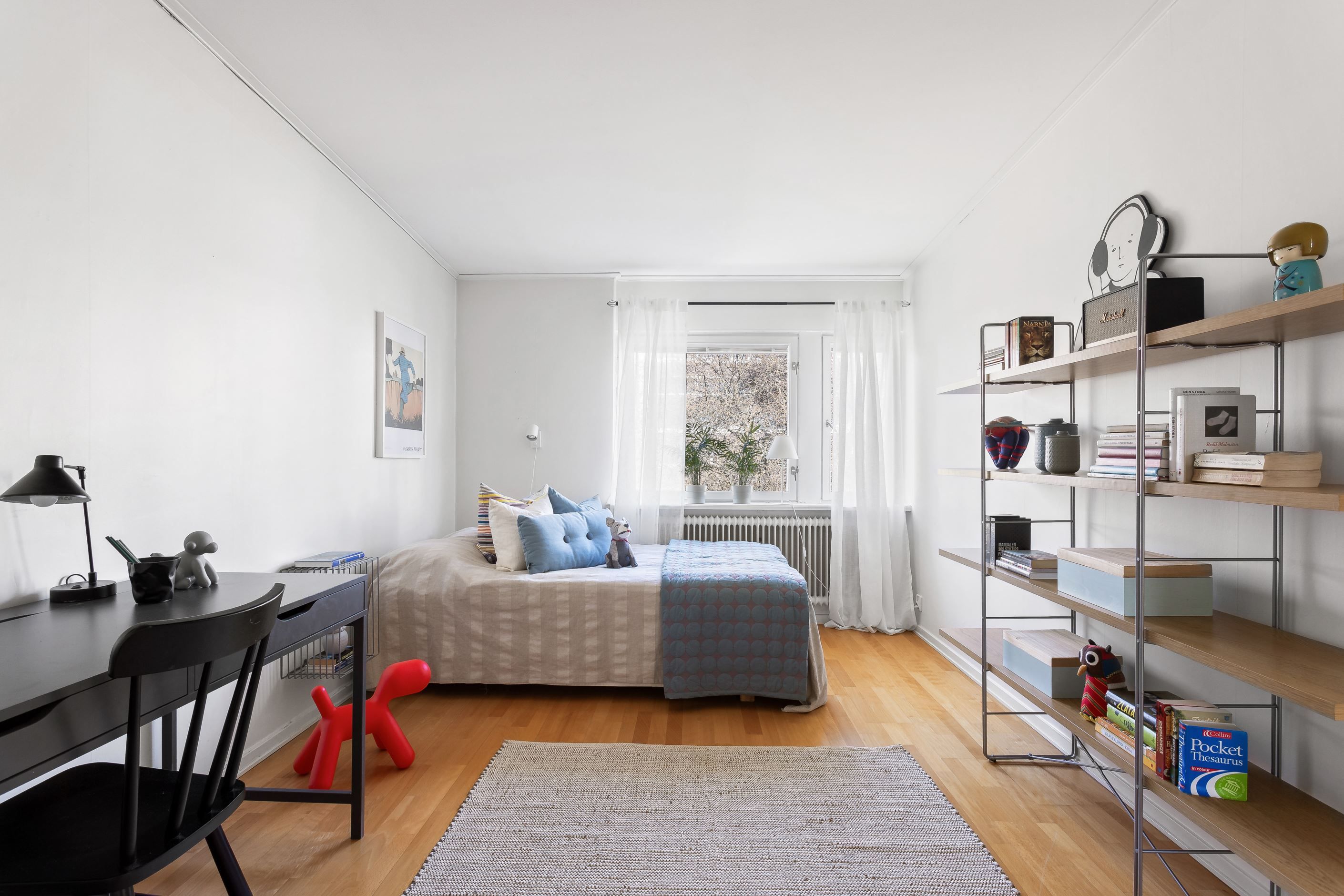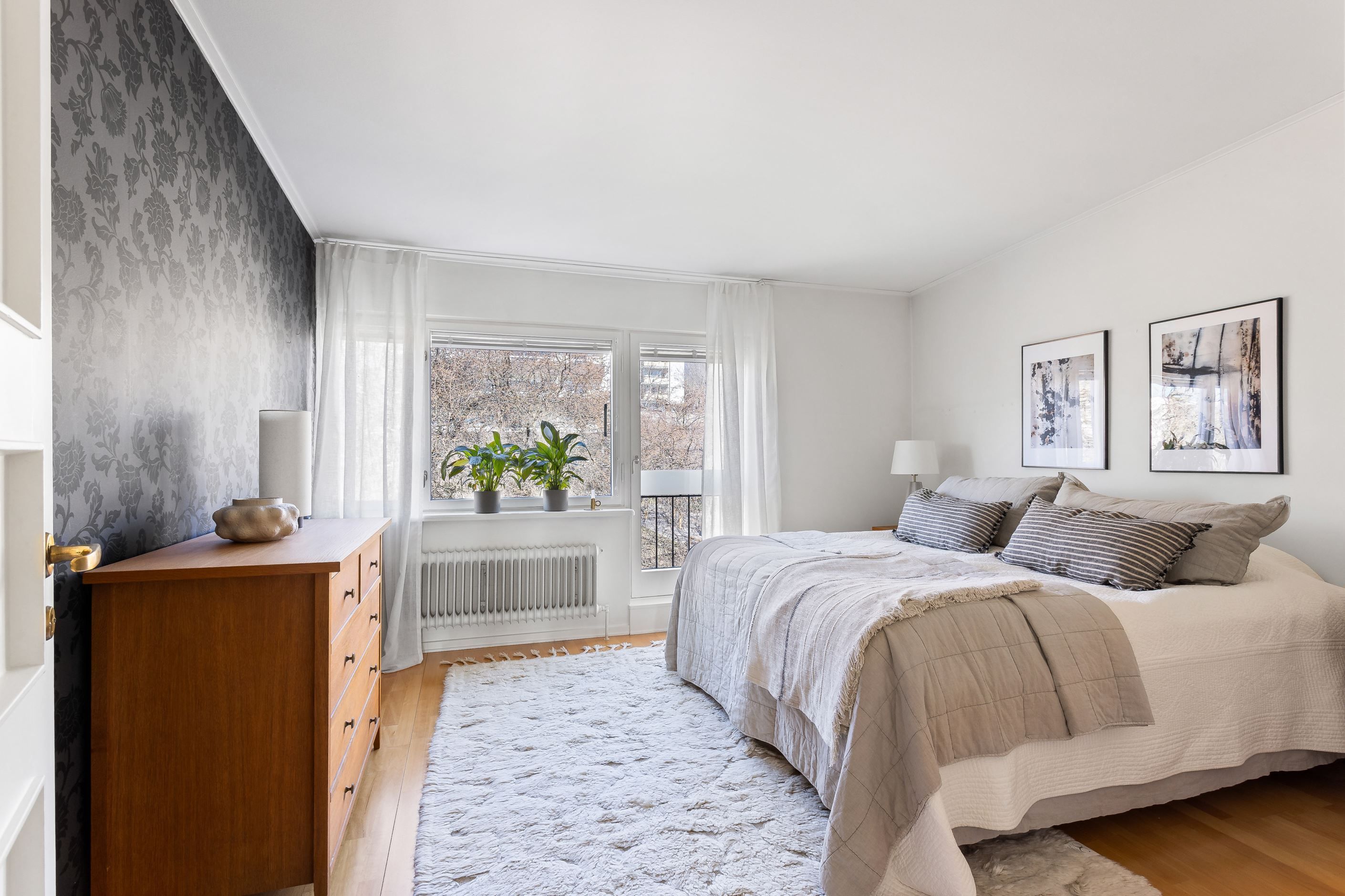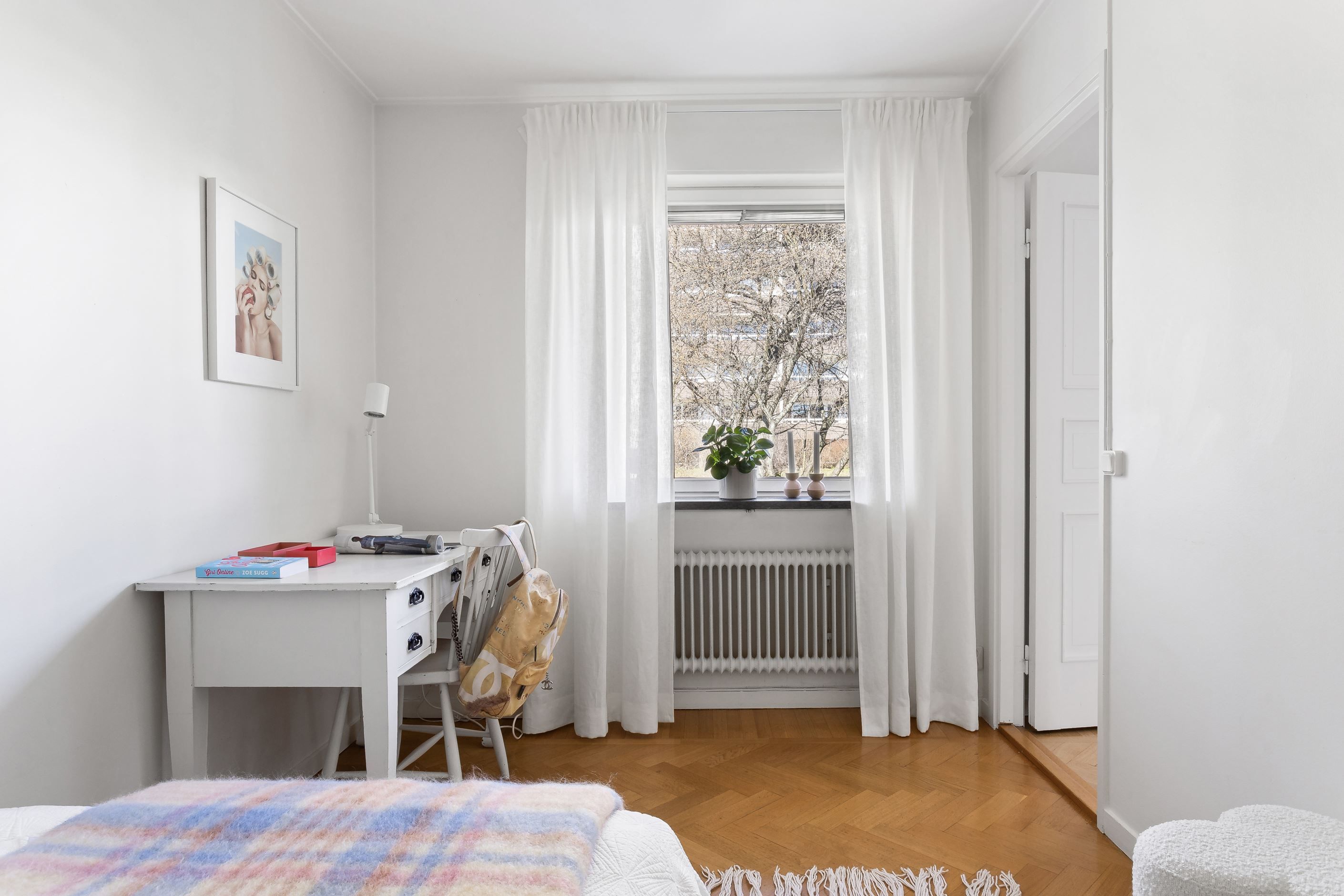 SOVRUM - Två sovrum varav ett med fransk balkong. Gott om plats för dubbelsäng samt skrivbordsdel. Garderobsvägg erbjuder bra med förvaring. Insynsfritt med vy mot grönskande park.