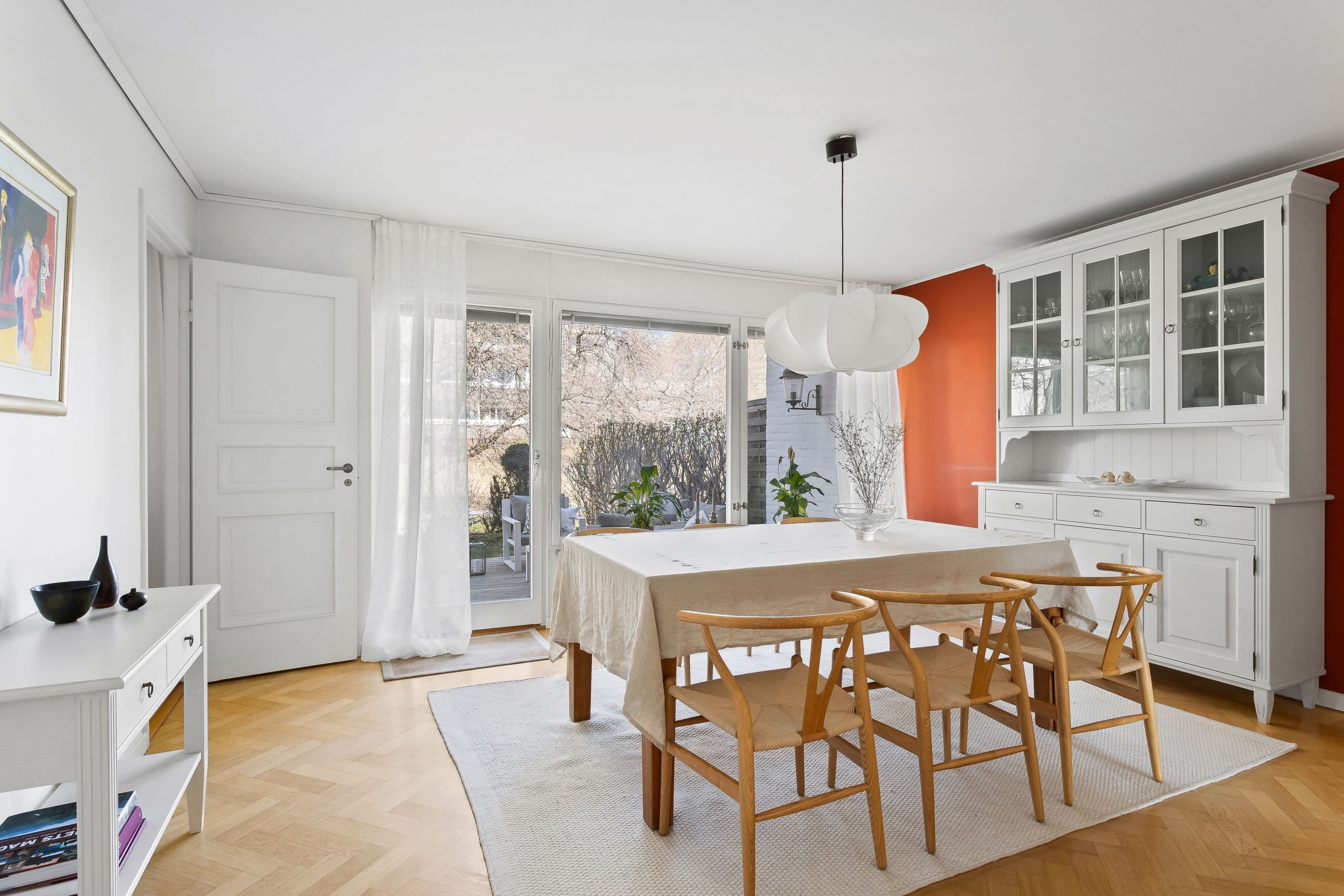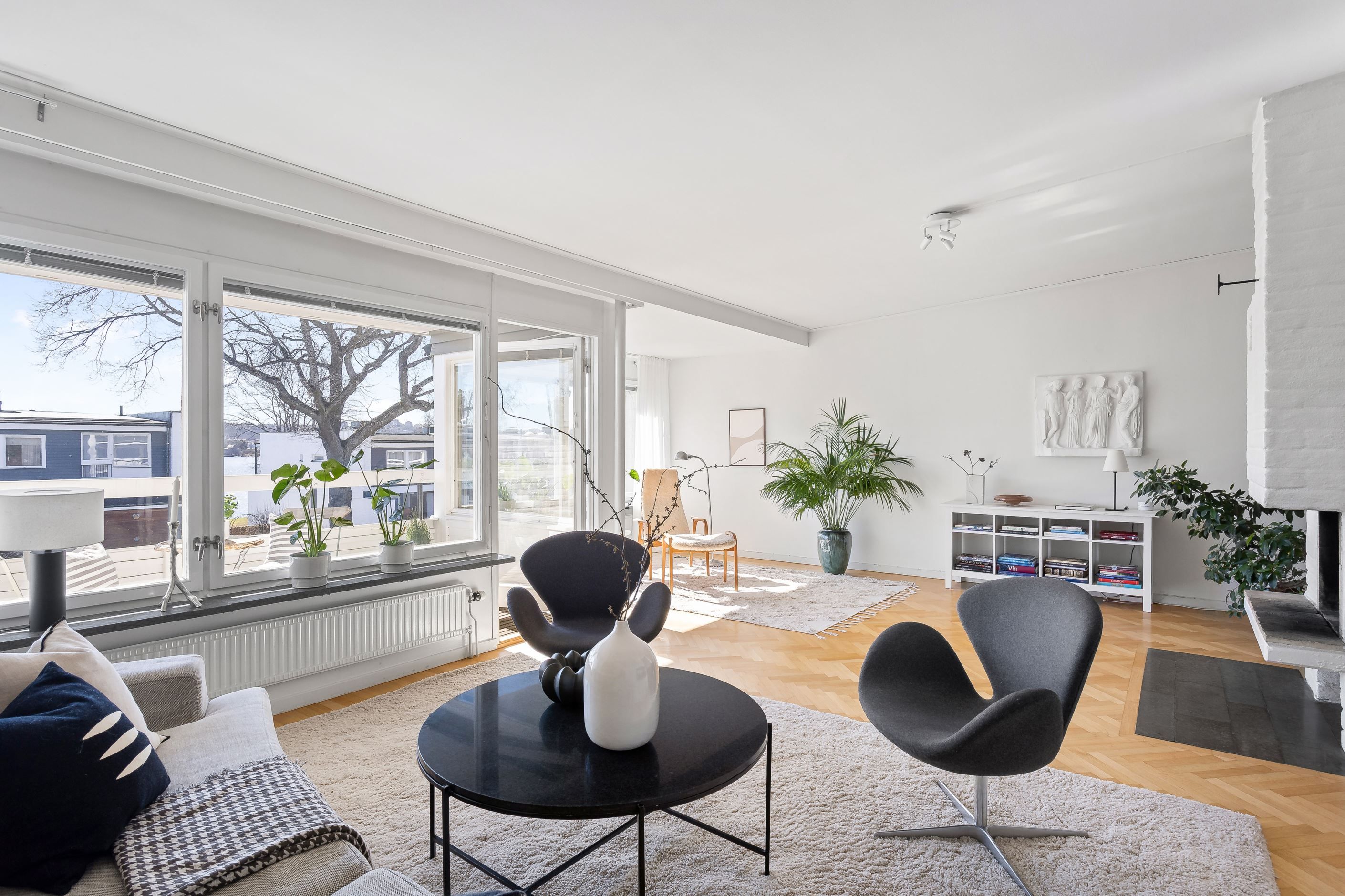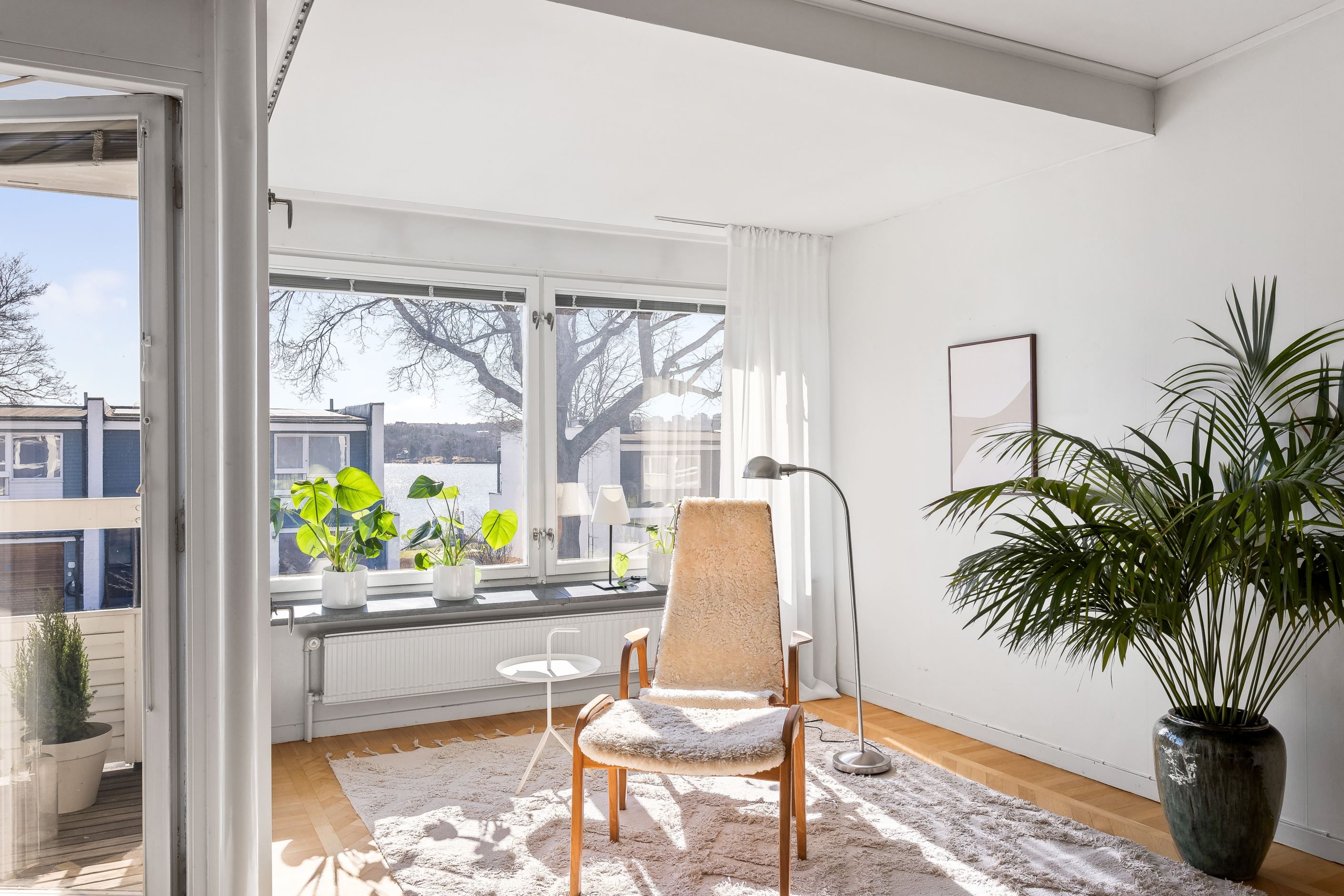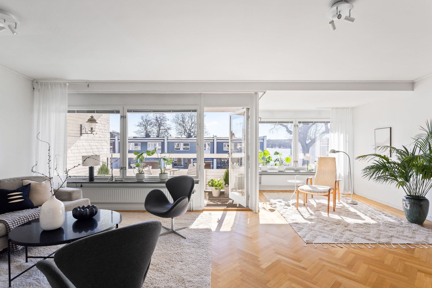 Exklusivt arkitektritat gavelradhus om tot. 249 kvm med fin sjöutsikt och Mälarnära läge. Vackra ljusa sällskapsytor med eldstad. Trivsamt kök, bra våtrum samt 5-6 sovrum. Gavelläge ger en skyddad och ogenerad tomt med härlig grönska, invid områdets park och med "badrocksavstånd" från strandkanten. Uteplatser med sol från morgon till kväll. Förstklassiga skolor, 12:ans spårvagn och ICA-butik på nära håll. P-plats i anslutning till huset för en smidig vardag. Ett välhållet och bekymmersfritt boende för den kräsne - ett stenkast från Mälarens strandpromenad med bad- och båtliv.