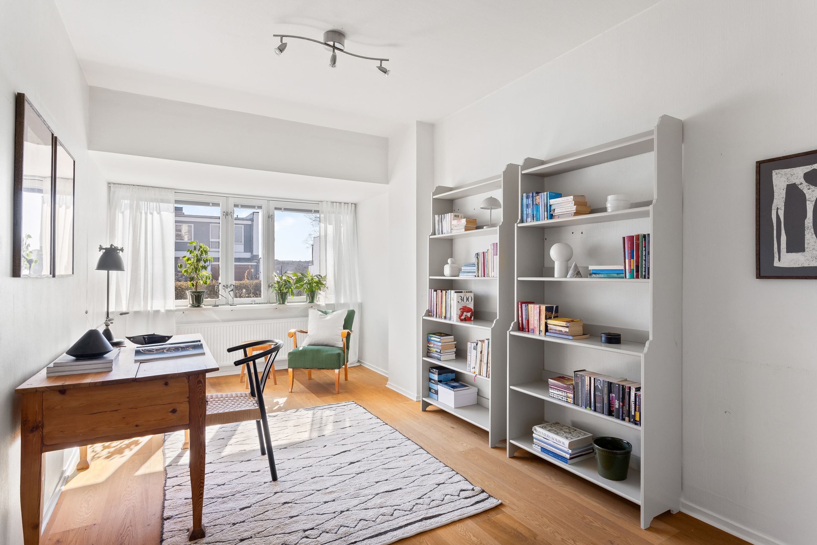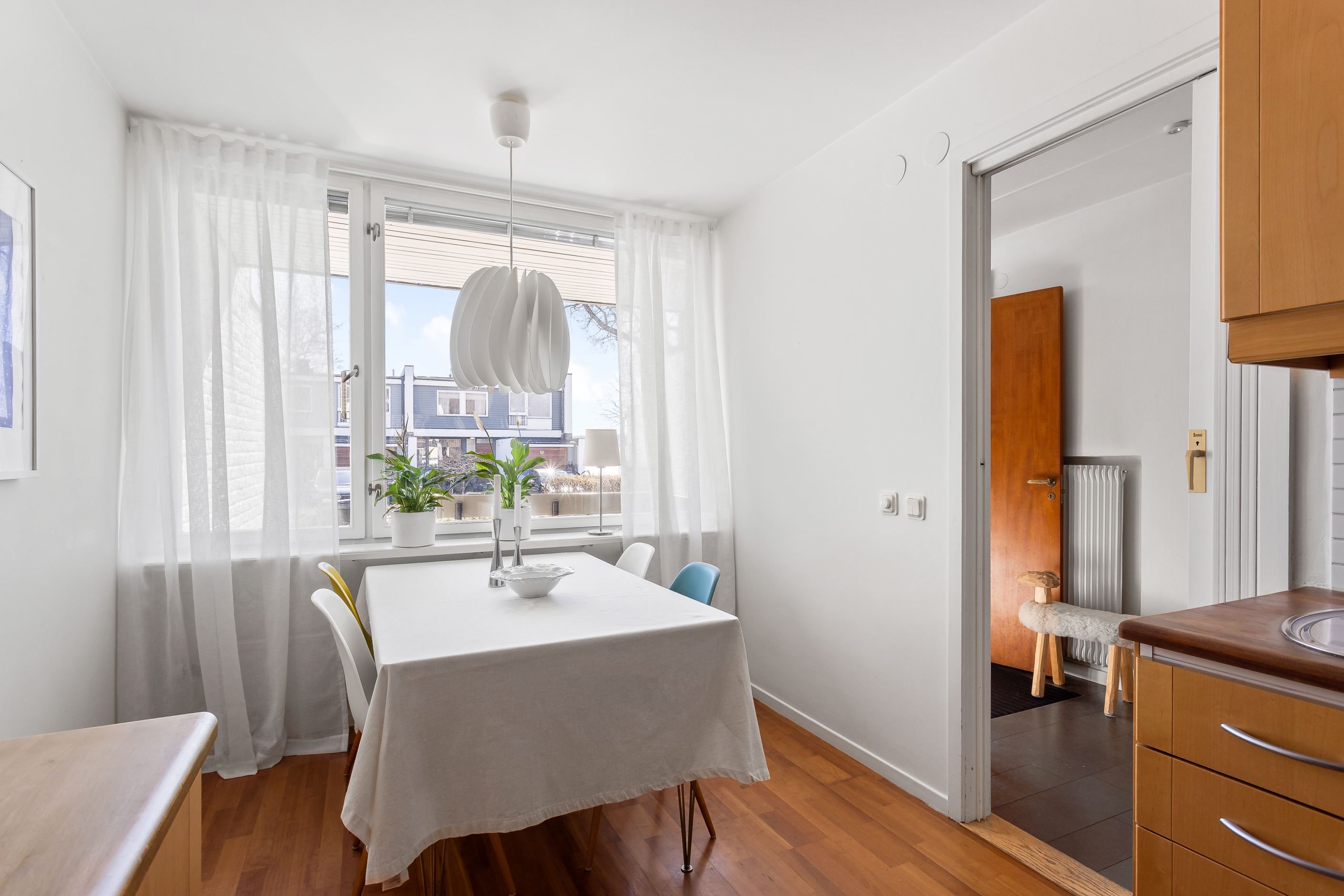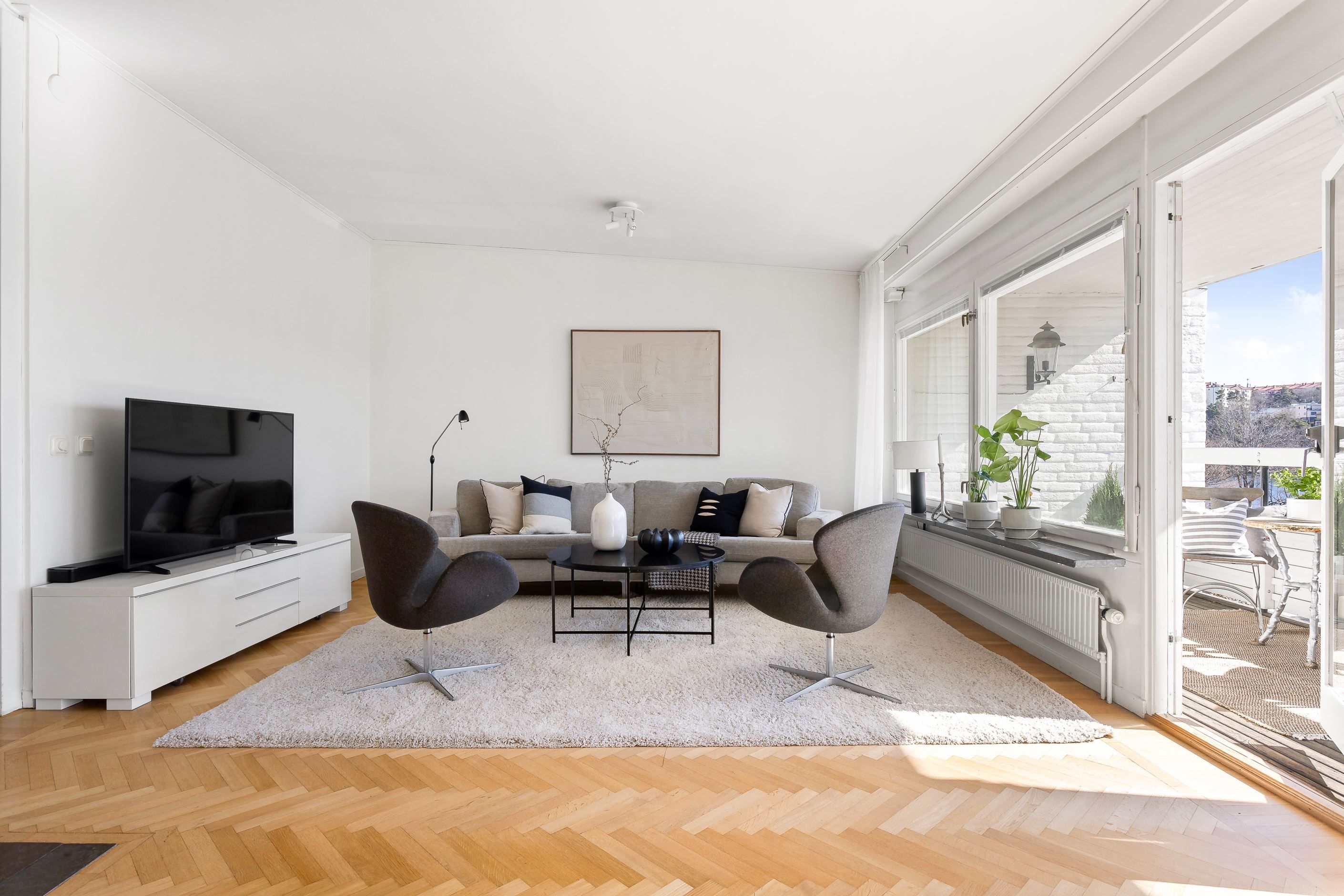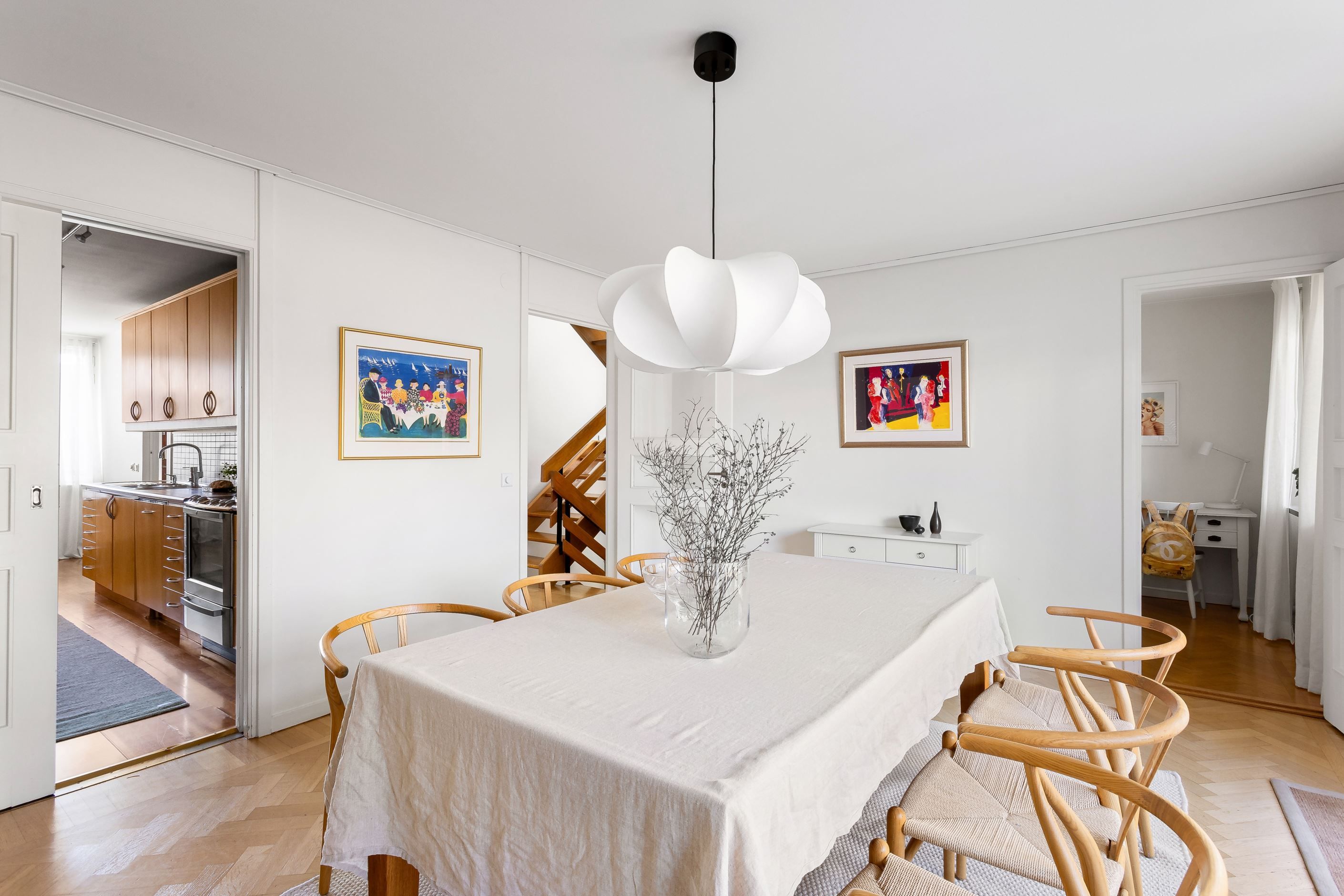 Exklusivt arkitektritat gavelradhus om tot. 249 kvm med fin sjöutsikt och Mälarnära läge. Vackra ljusa sällskapsytor med eldstad. Trivsamt kök, bra våtrum samt 5-6 sovrum. Gavelläge ger en skyddad och ogenerad tomt med härlig grönska, invid områdets park och med "badrocksavstånd" från strandkanten. Uteplatser med sol från morgon till kväll. Förstklassiga skolor, 12:ans spårvagn och ICA-butik på nära håll. P-plats i anslutning till huset för en smidig vardag. Ett välhållet och bekymmersfritt boende för den kräsne - ett stenkast från Mälarens strandpromenad med bad- och båtliv.