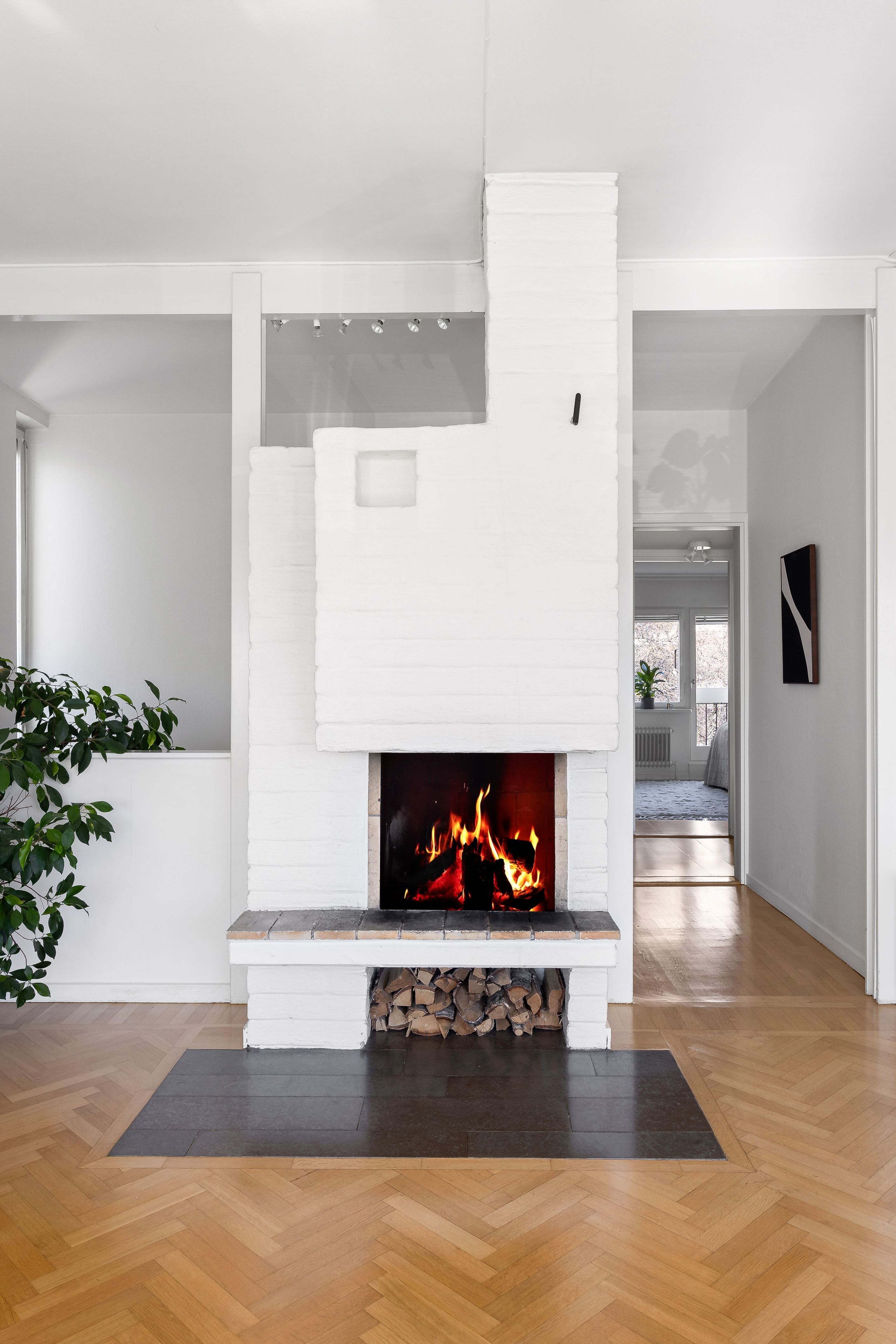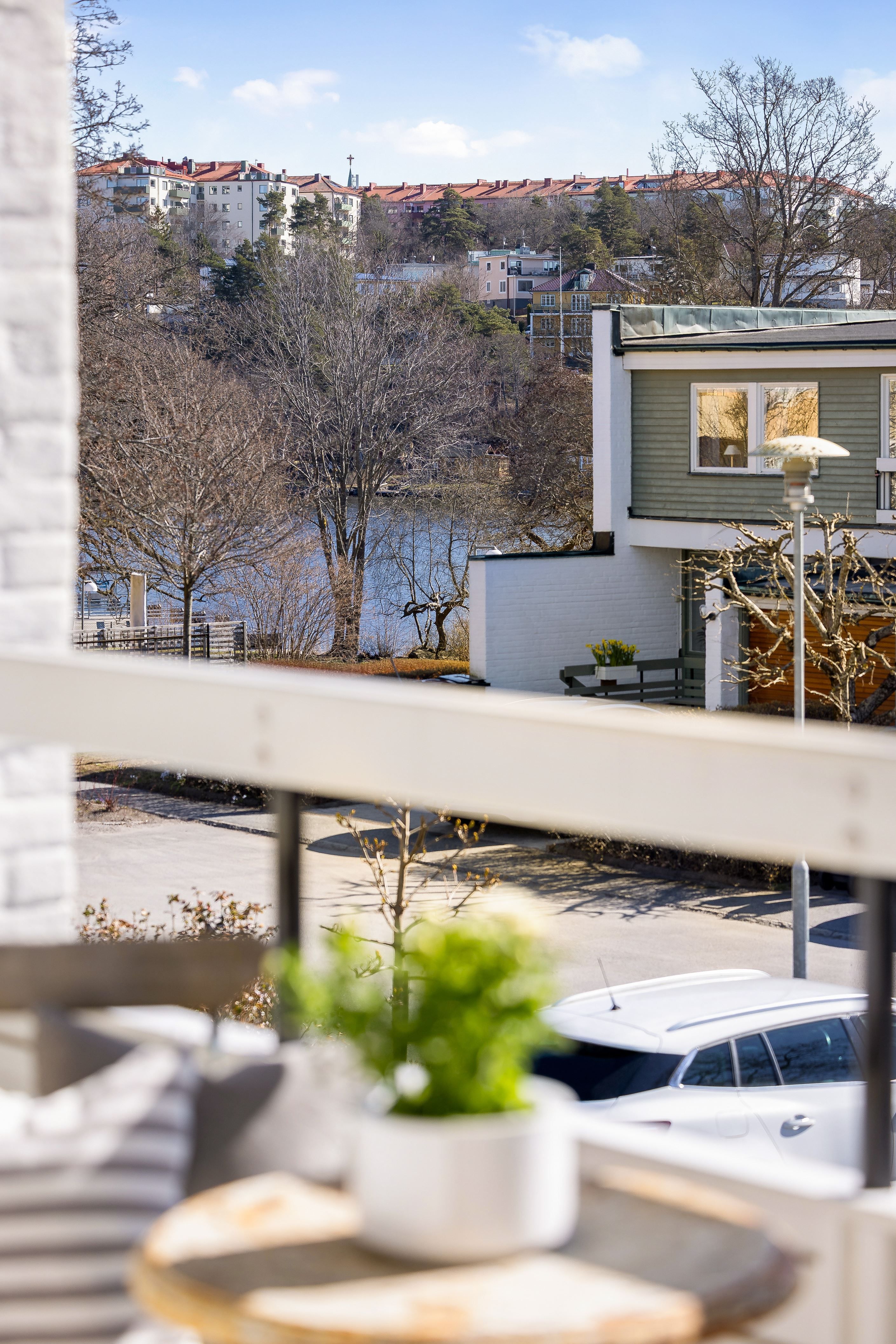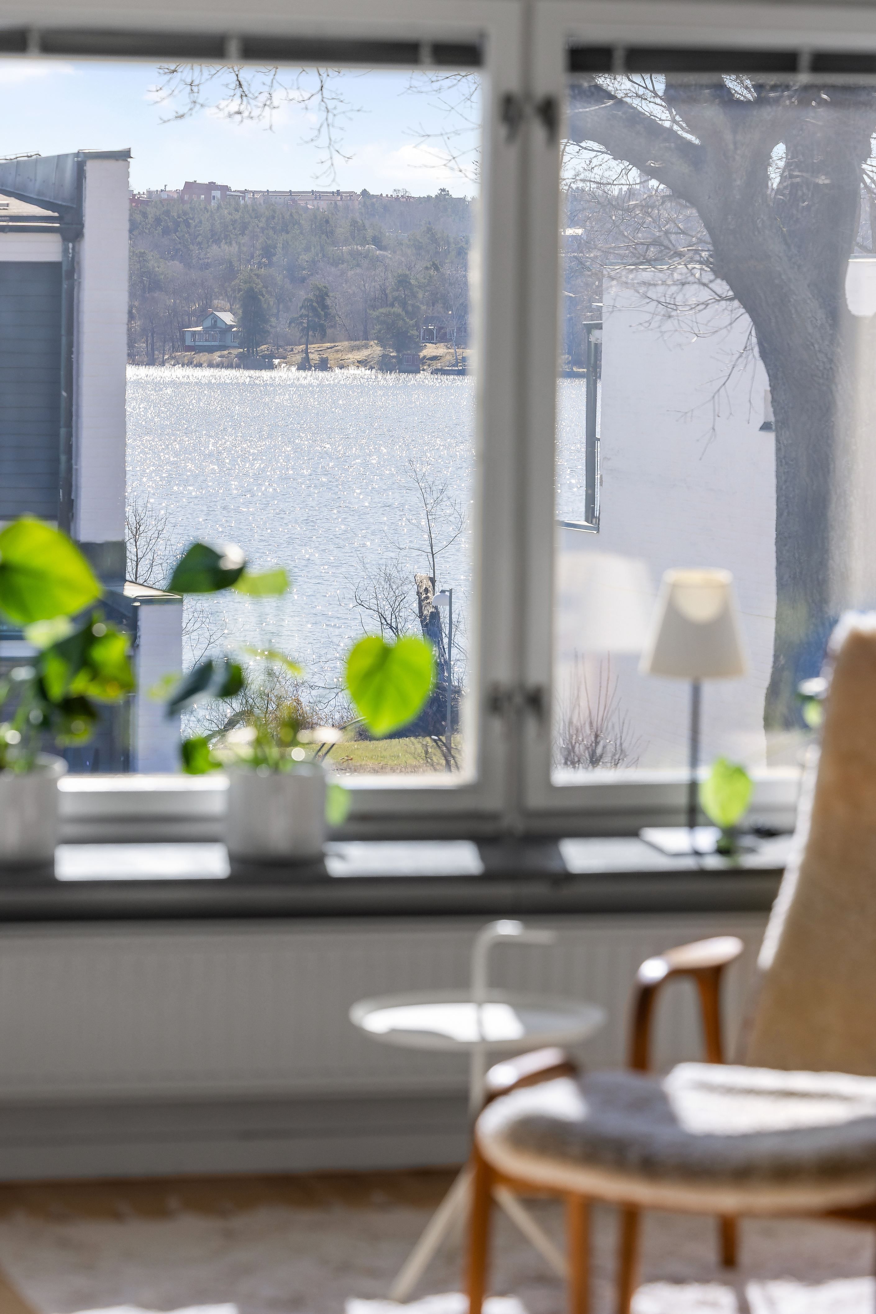 SÄLLSKAPSYTA - Vackert och ljust rum med härlig rymd och fin sjöutsikt. Stora glaspartier mot sydöst och utgång till solig balkong. Här sitter man gärna och ser Waxholmsbåtarna tuffa förbi och i fjärran anas Essingen. Vackra fönsterbänkar i kalksten. Stilren öppen spis i slammat tegel med eldstadsplan av kalksten. Rummet har plats för flera sittgrupper och ytterligare matsalsbord. Fiskbensparkett och vita väggar. Ett sällskapsrum utöver det vanliga. Enkelt avdelbart för den som önskar extra sovrum eller arbetsrum.