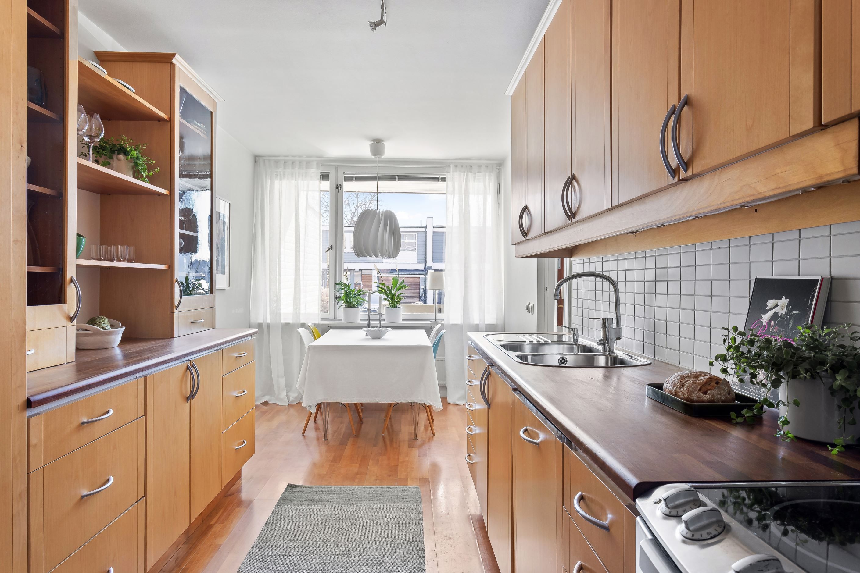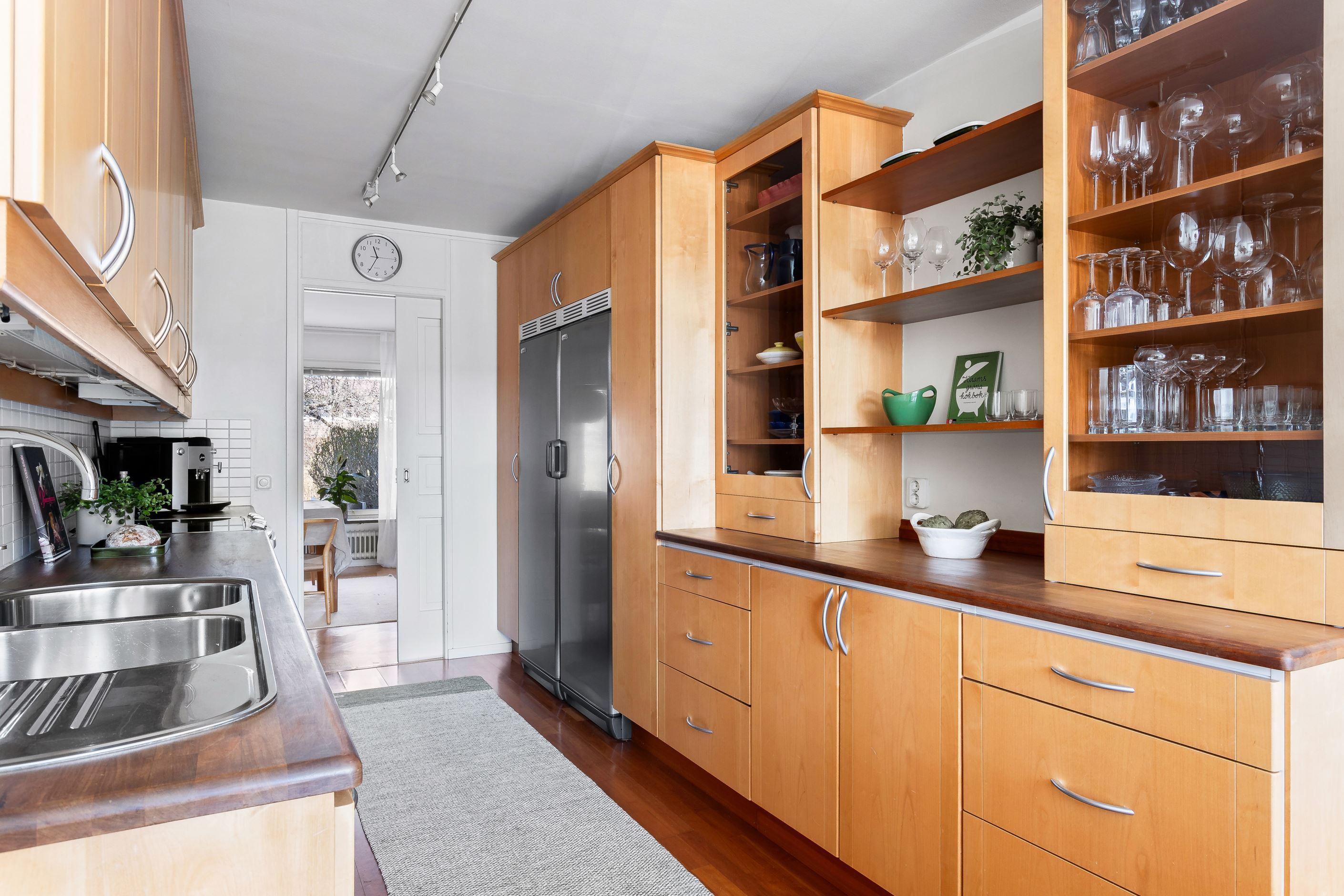 KÖK - Välplanerat och praktiskt kök med trivsam atmosfär och bra ljus samt sjöglimt. Plats för matbord vid fönster. Snickerier i trä med bra arbetsytor och gott om förvaring.