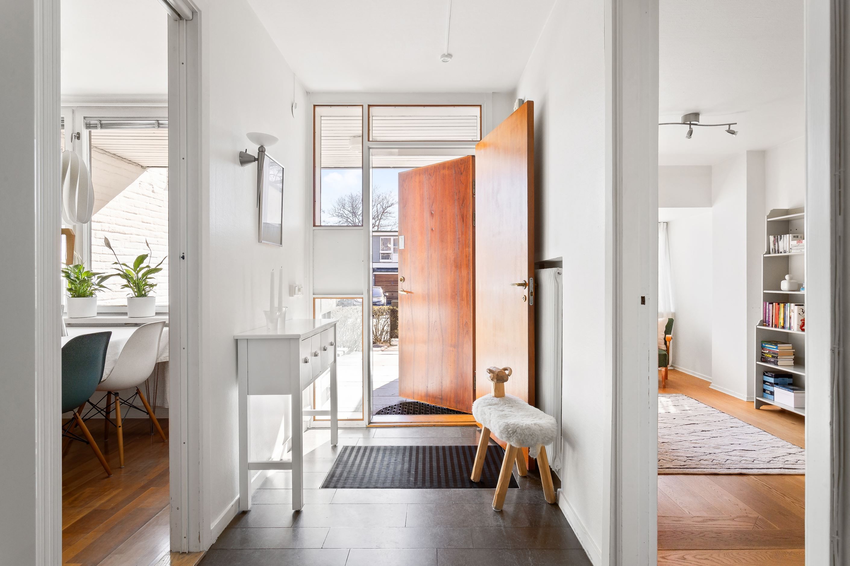 Entréhall med kalkstensgolv och plats för lättare möblemang
