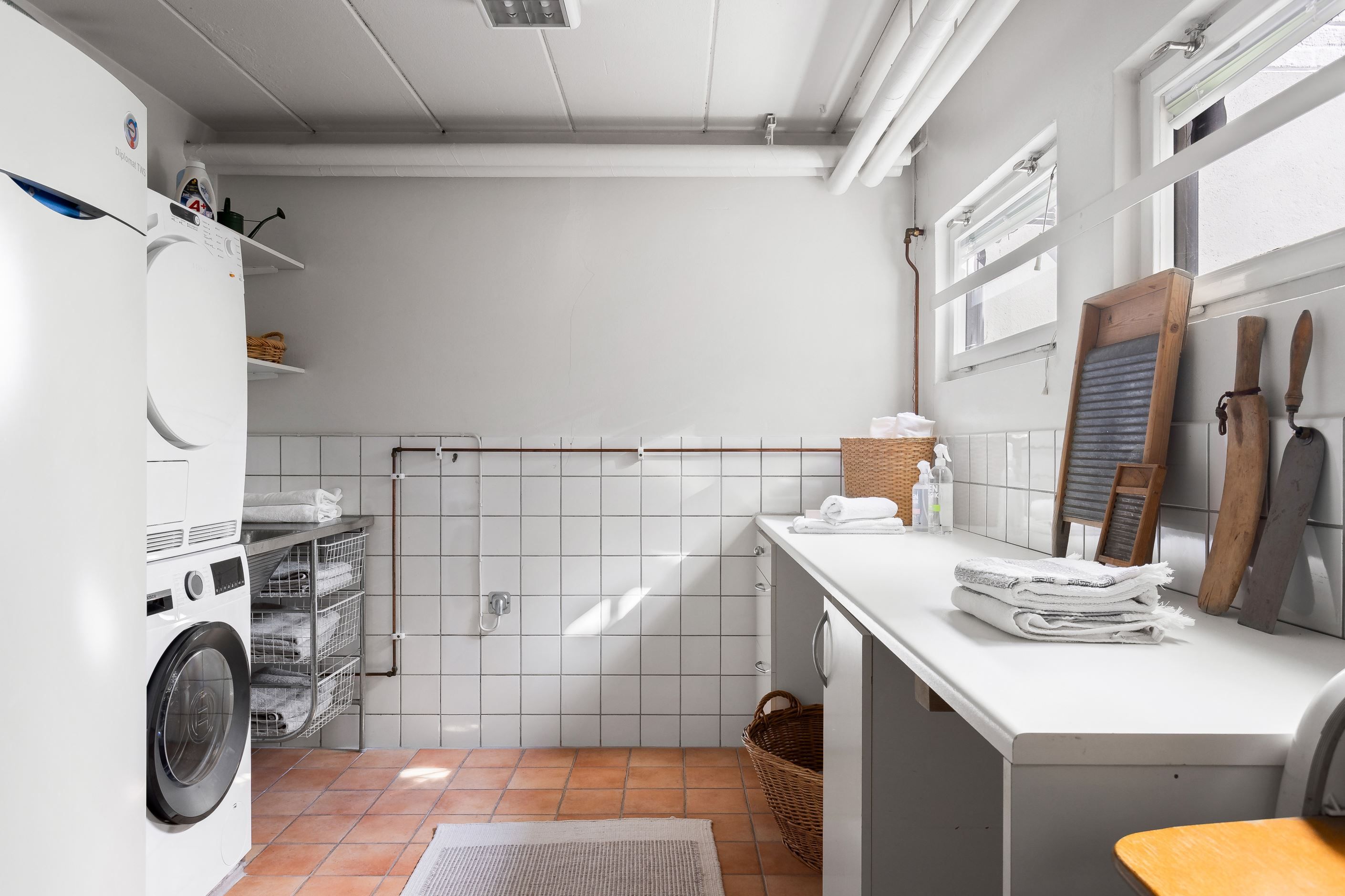 TVÄTTSTUGA - Rymlig tvättstuga med gott om plats för klädvård. Tvättmaskin och tumlare.