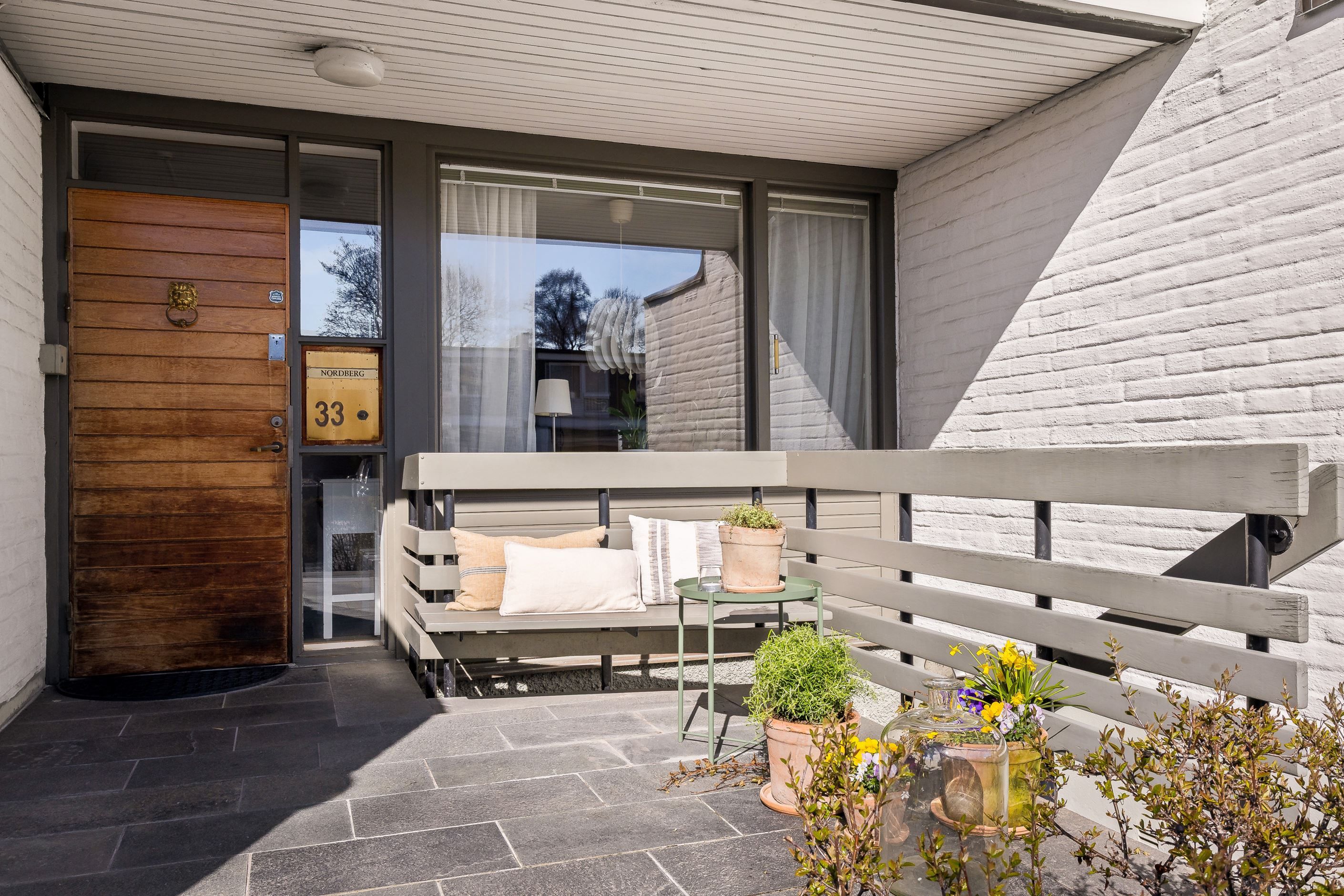 Entré på skiffer - även här en tilltalande uteplats där solen letar sig ner