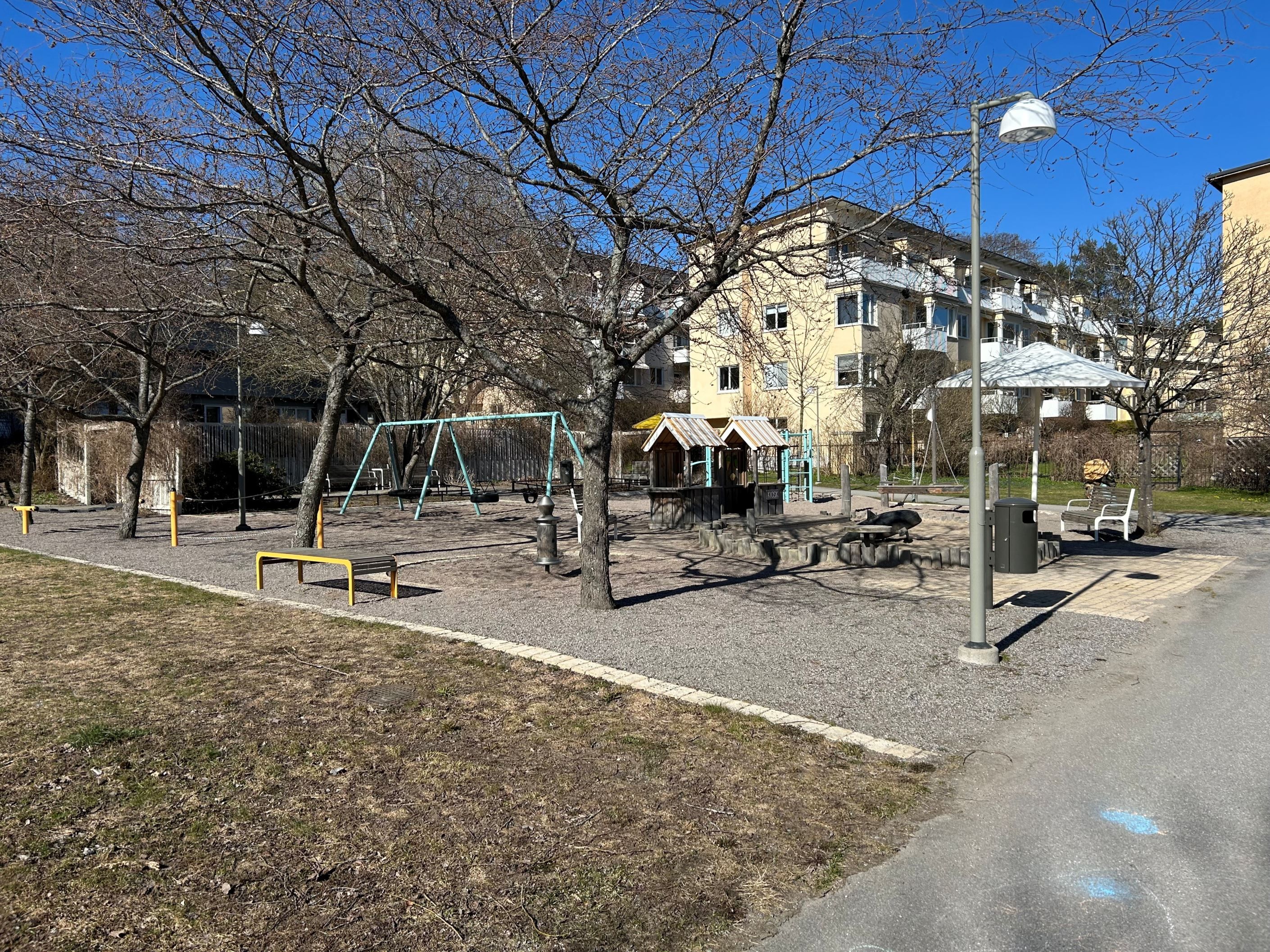 En generös uteplats mot tomt där barnen leker skyddat invid den angränsande parken