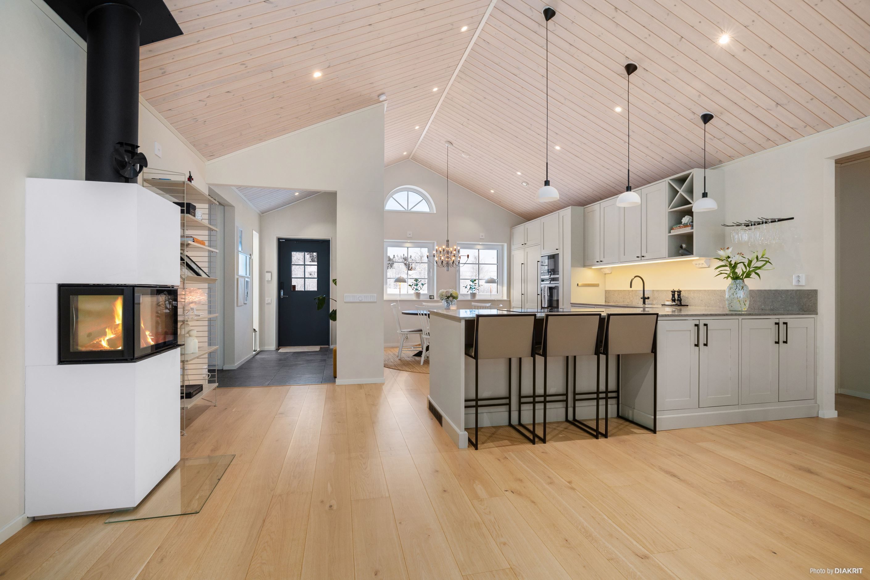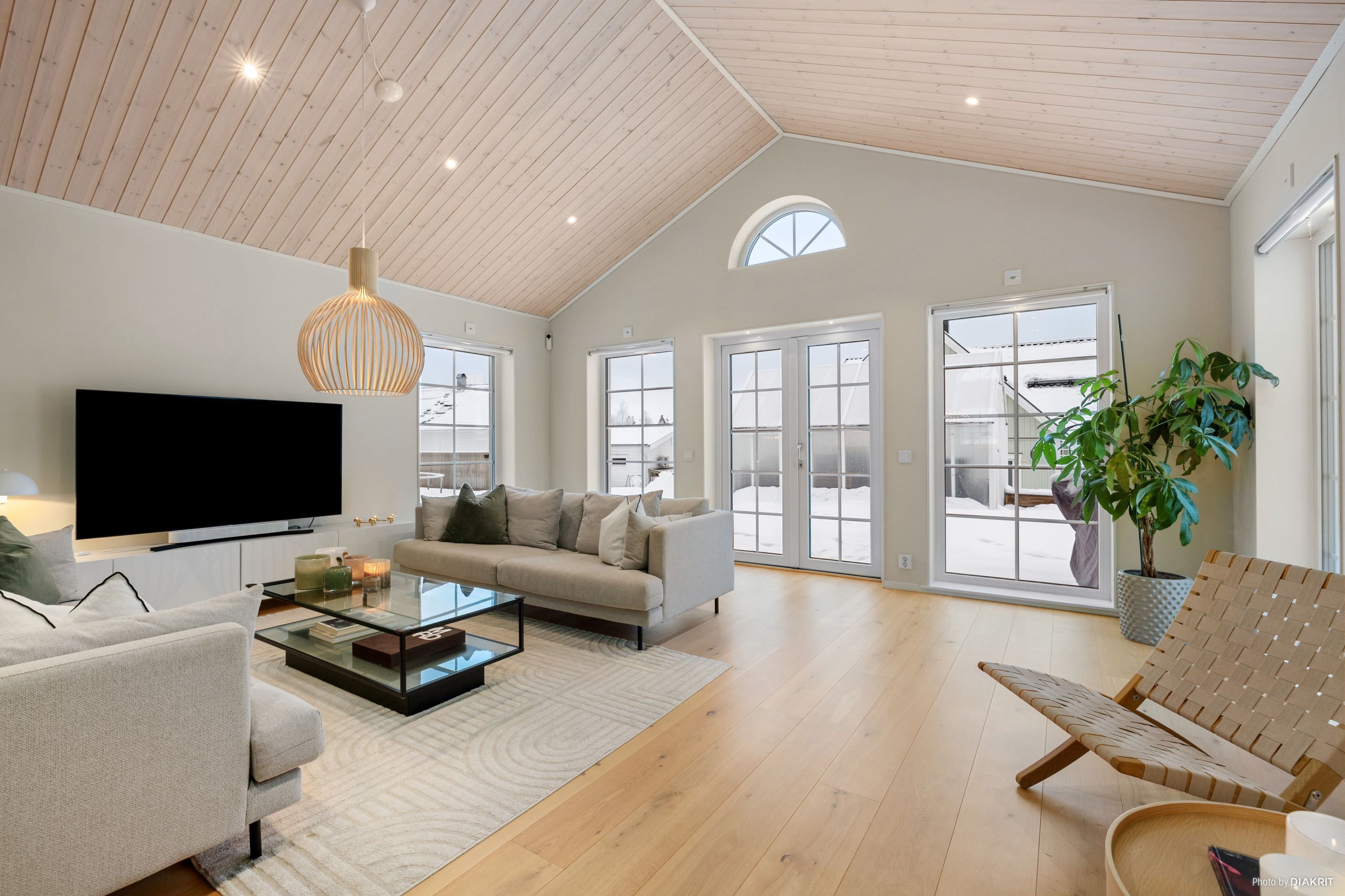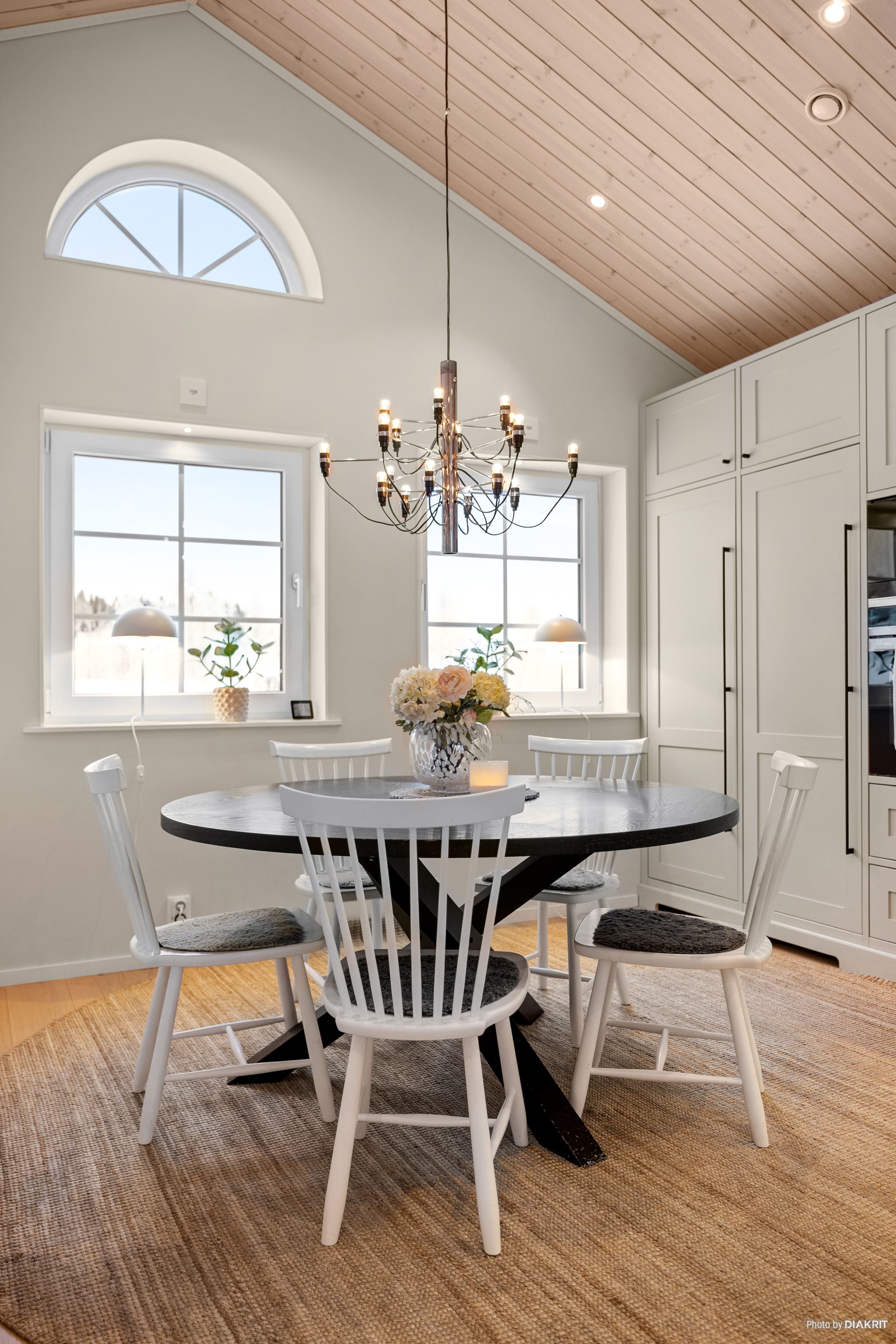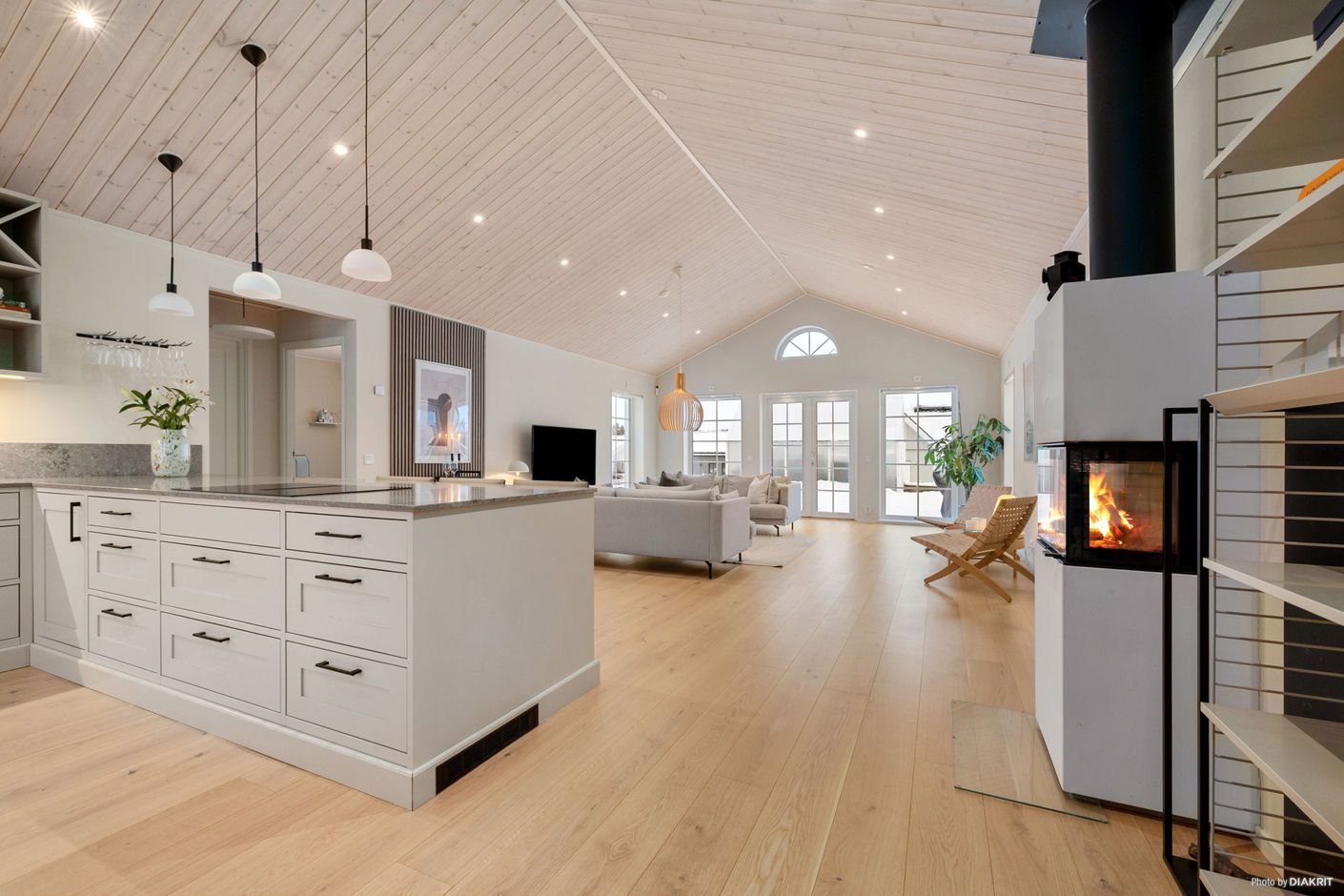 Vardagsrummet imponerar med ett ryggåstak på 3,7 meter, en kamin från Nordpeis och stora fönster som ger ett fantastiskt ljusinsläpp. Dubbeldörrarna leder ut till en altan med motordriven markis.