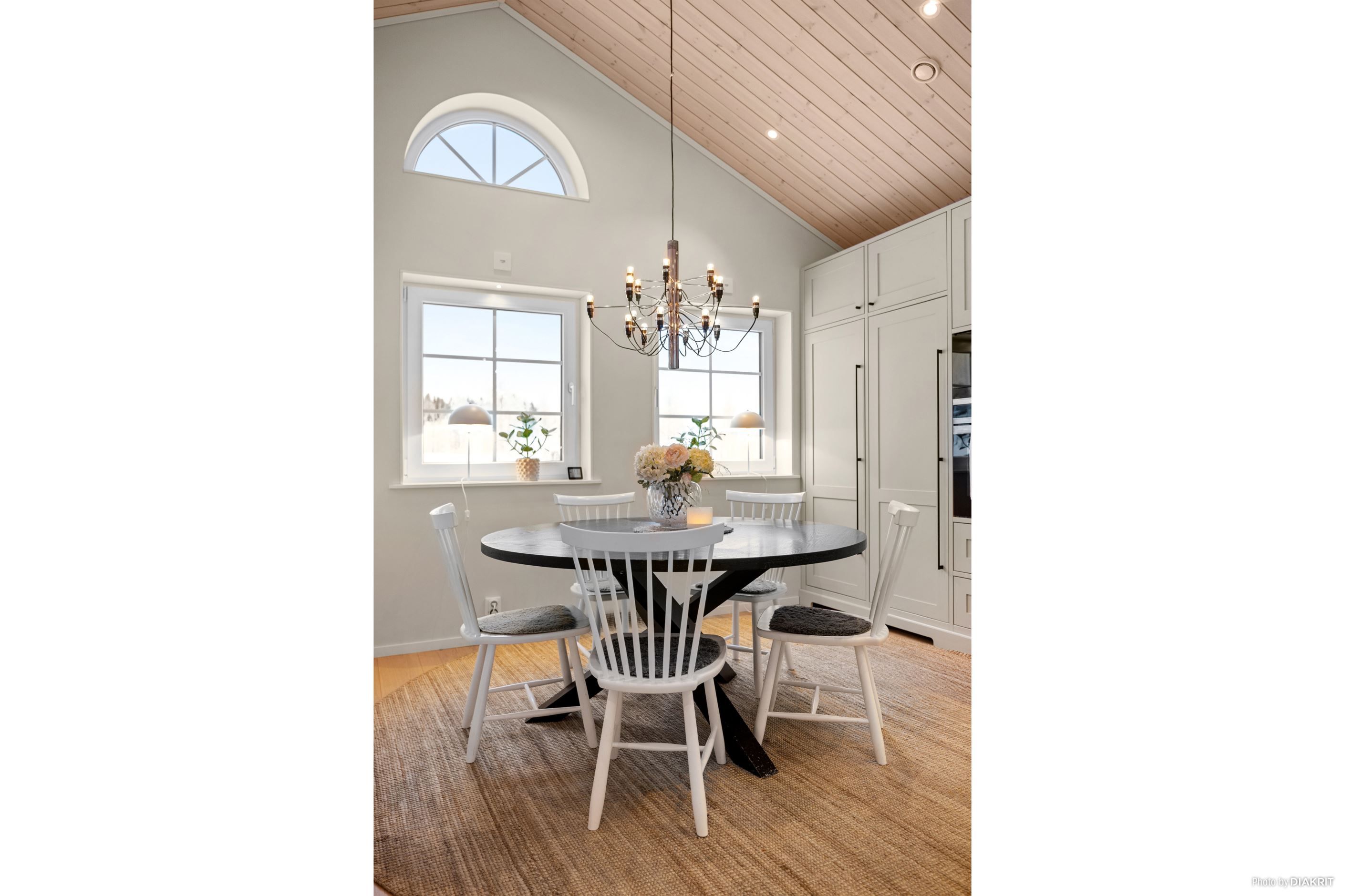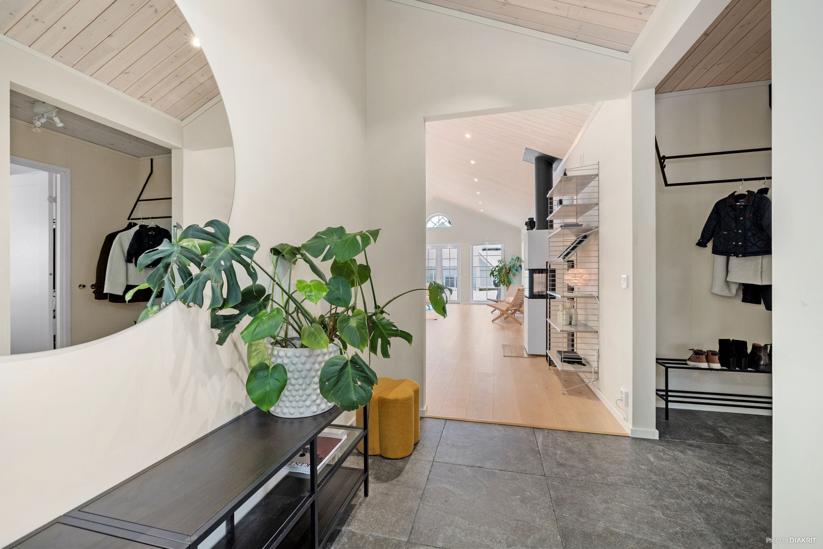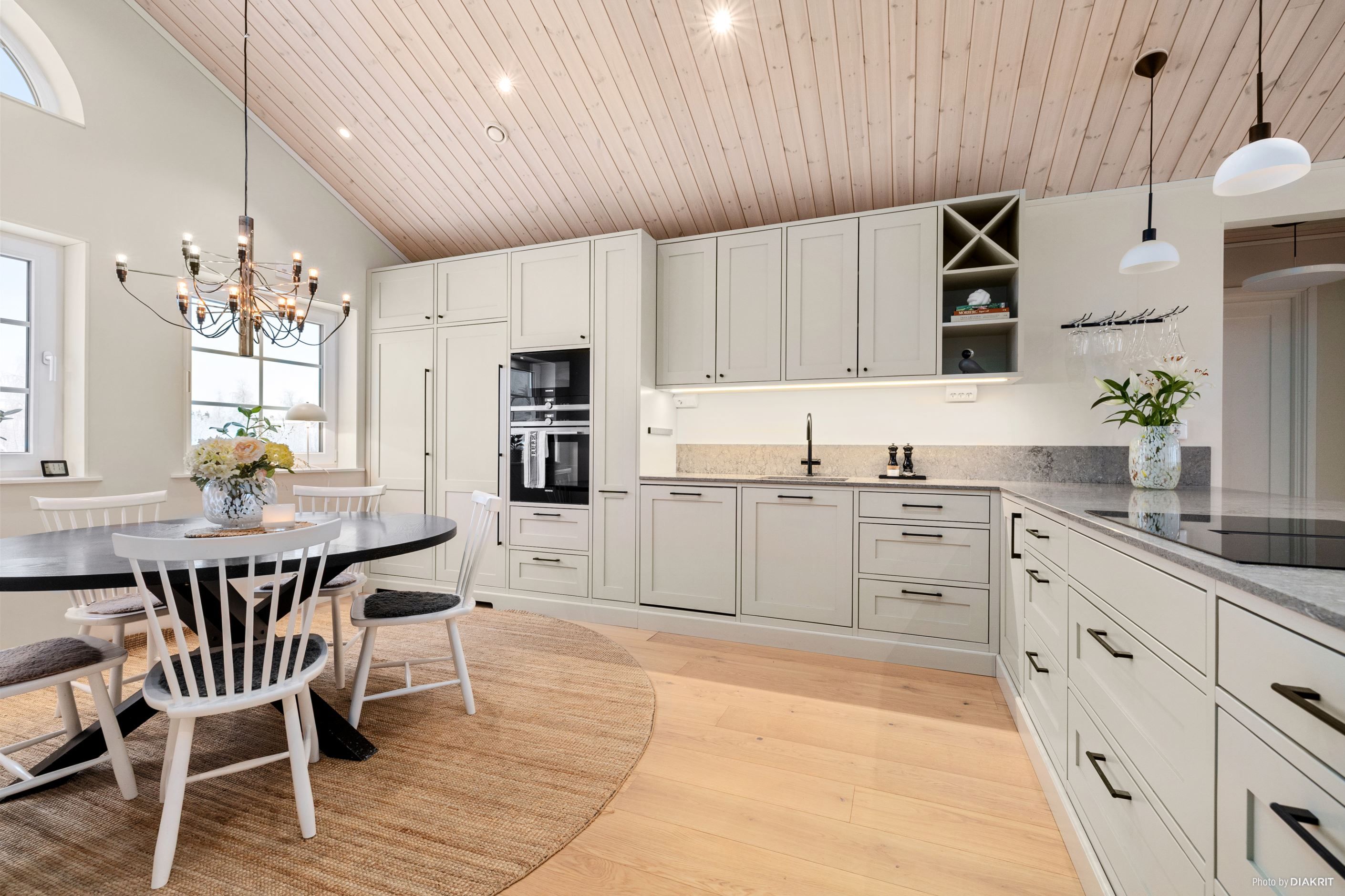 Vardagsrummet imponerar med ett ryggåstak på 3,7 meter, en kamin från Nordpeis och stora fönster som ger ett fantastiskt ljusinsläpp. Dubbeldörrarna leder ut till en altan med motordriven markis.