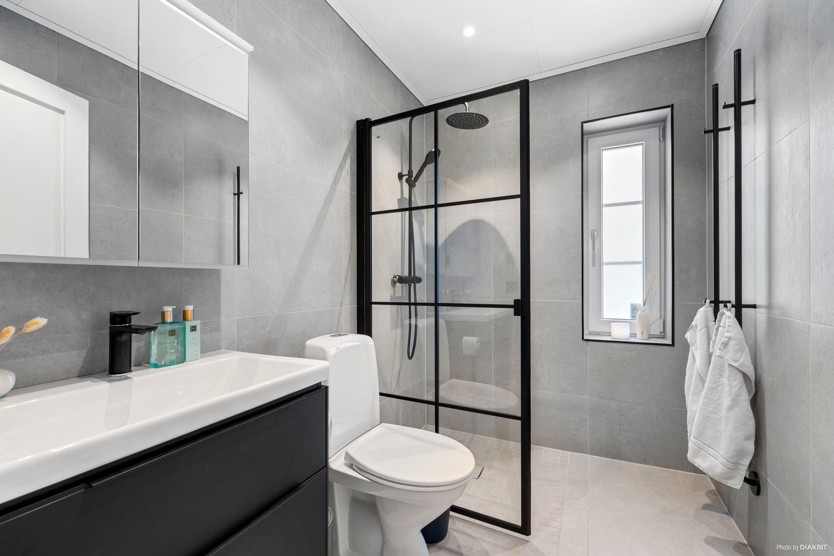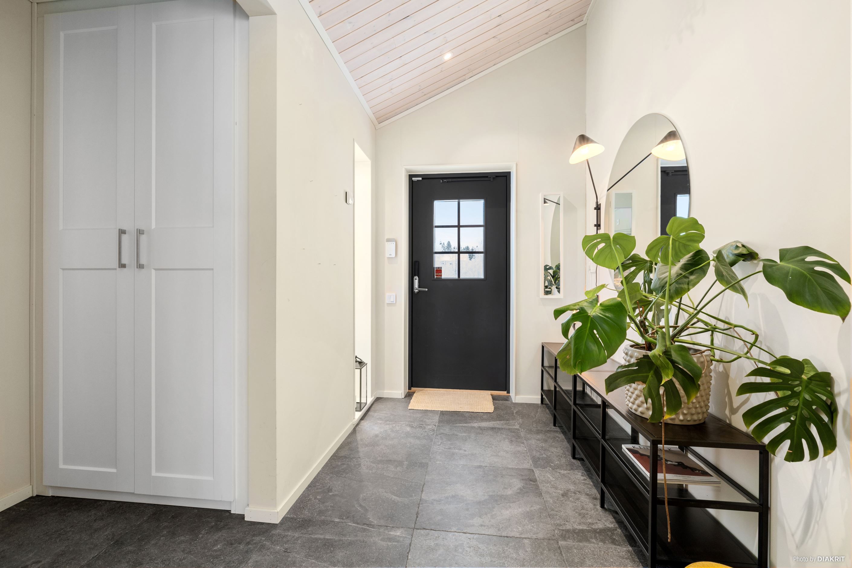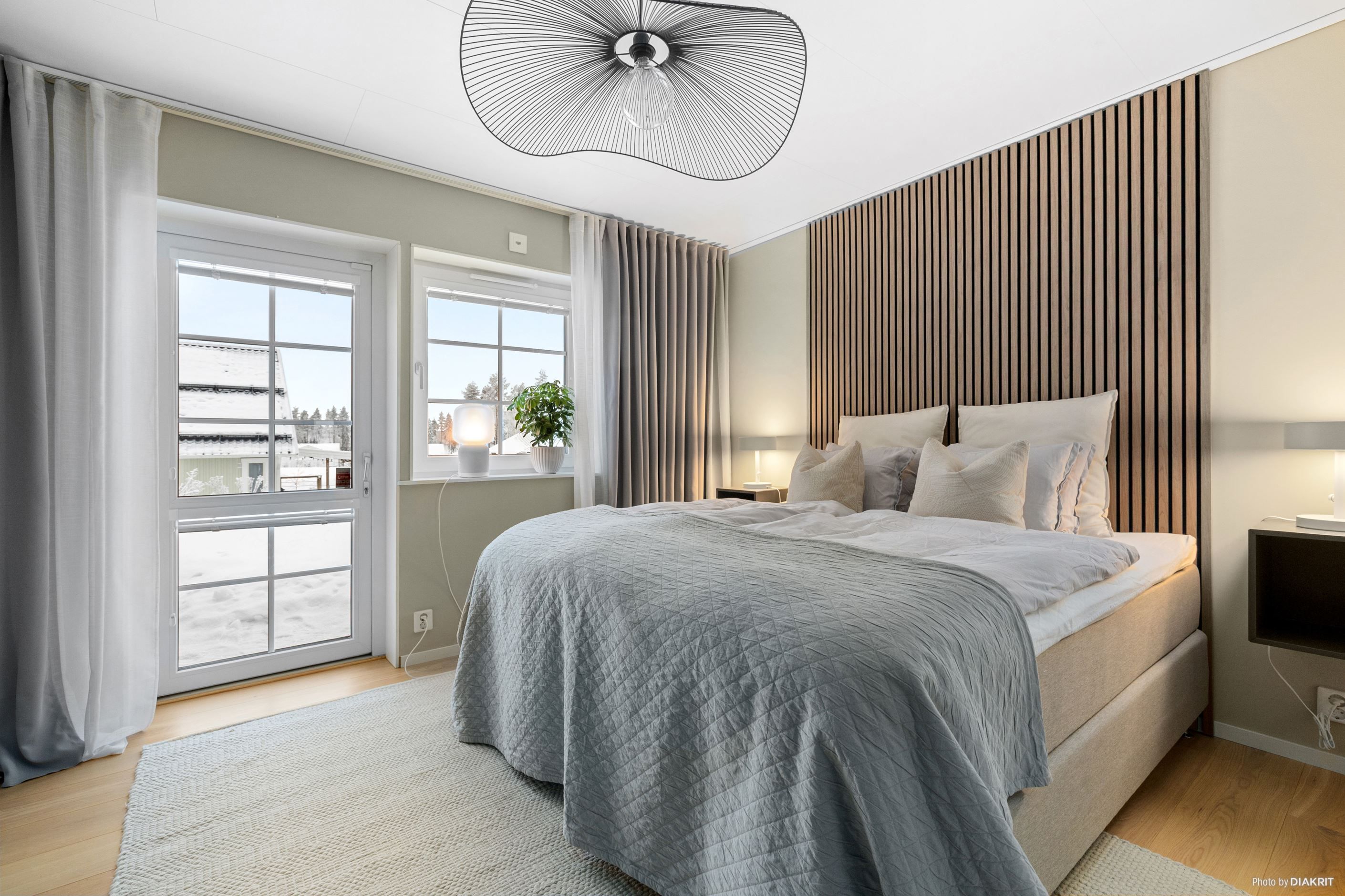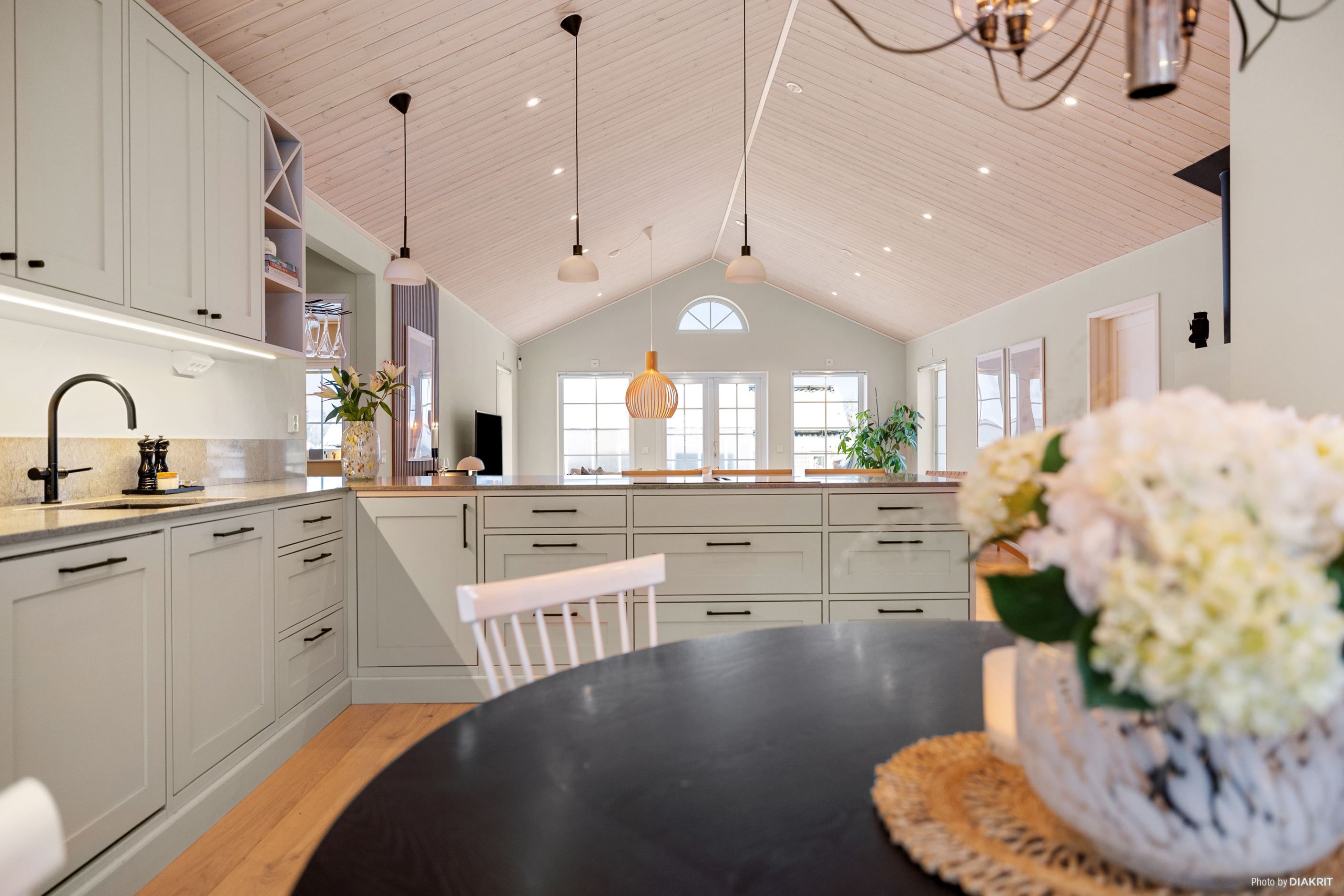 Vardagsrummet imponerar med ett ryggåstak på 3,7 meter, en kamin från Nordpeis och stora fönster som ger ett fantastiskt ljusinsläpp. Dubbeldörrarna leder ut till en altan med motordriven markis.