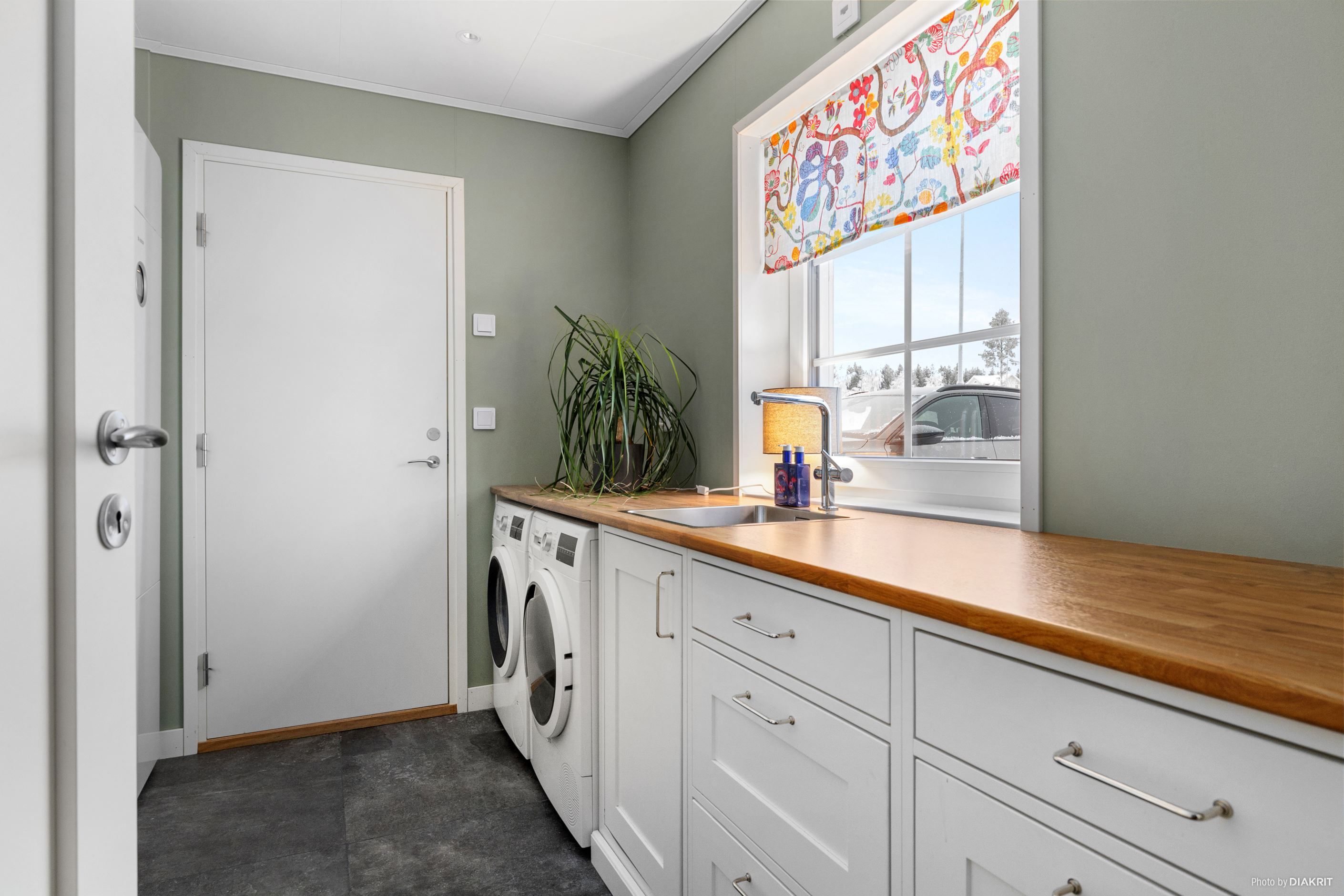 Den inbjudande hallen leder dig in i ett smakfullt snickeribyggt kök inspirerat av shakerstil, med skåp och lådor i massivt trä och en bänkskiva i komposit. Köket är utrustat med integrerade vitvaror från Siemens och praktiska detaljer som LED-belysning och sopsorteringsskåp från Blanco.