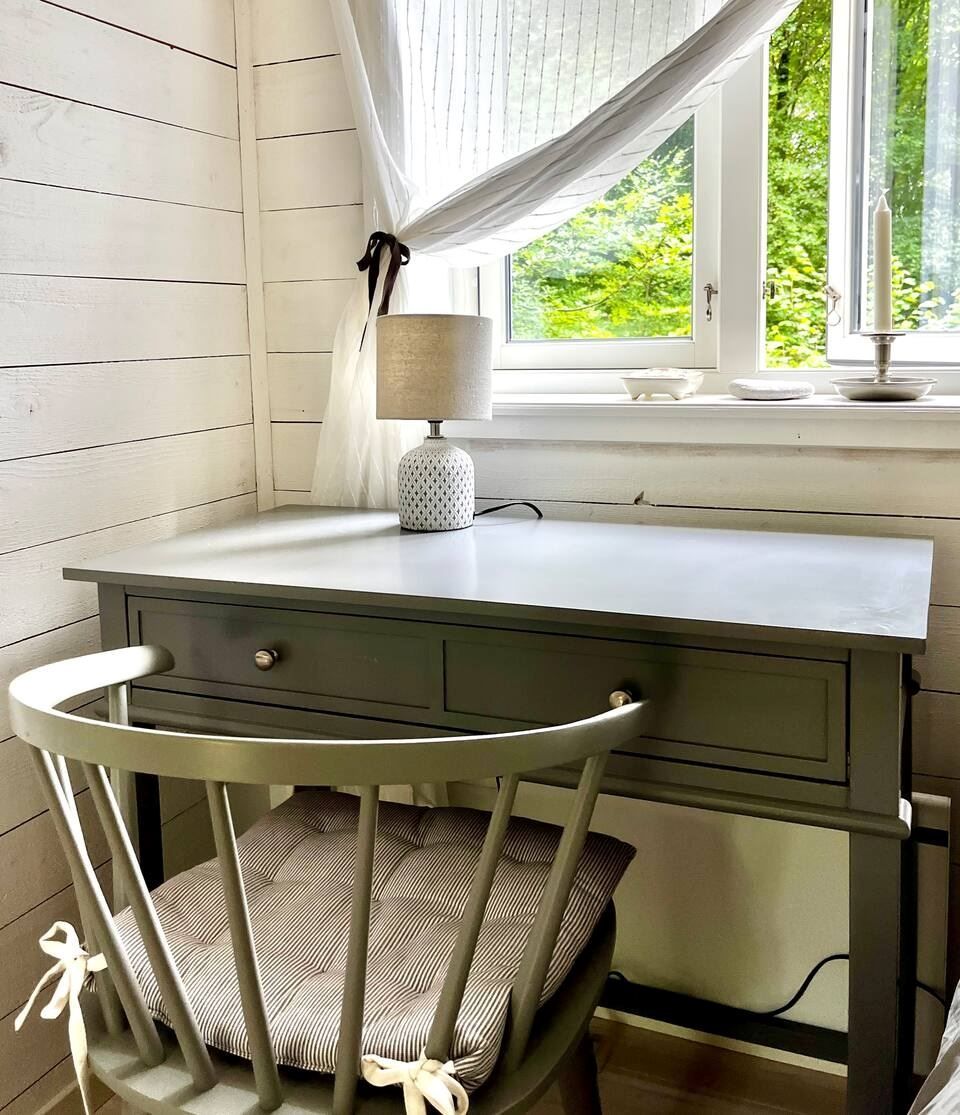 Arbetshörna med den lugnande grönskan utanför