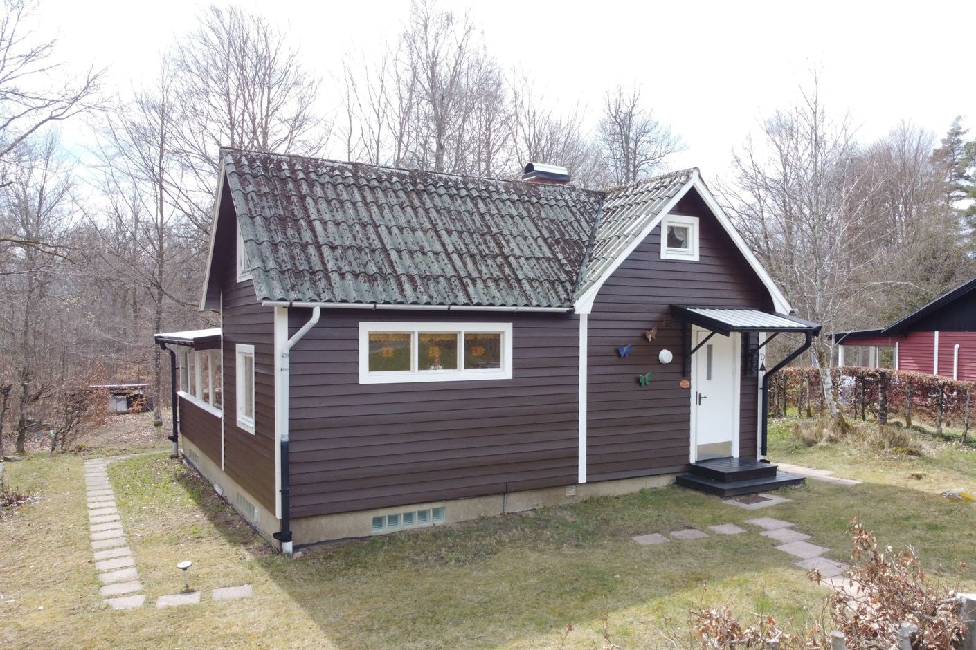 Det rymliga, inglasade uterummet blir snabbt en favoritplats – här kan du sitta länge med kaffekoppen och njuta av skogen runt omkring, oavsett väder och årstid. Den angränsande uteplatsen passar lika bra för grillkvällar som för avslappnade stunder i solen.