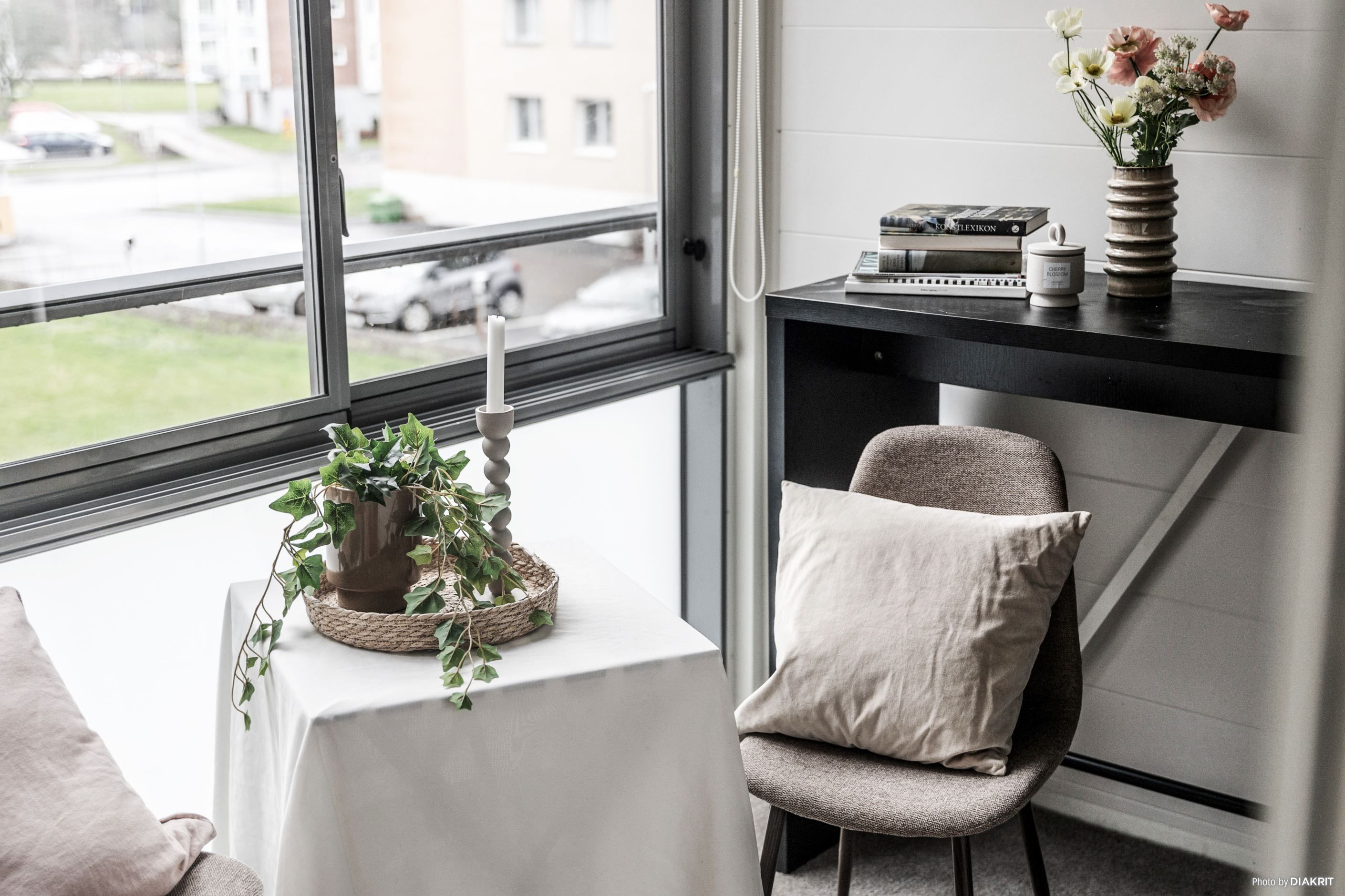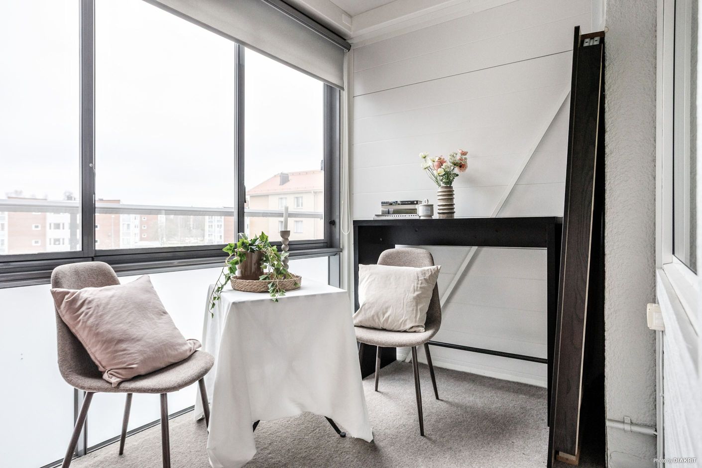Den inglasade balkongen ligger i soligt läge och blir ett extra rum större delen av året – perfekt för avkoppling, odling eller mysiga middagar.
