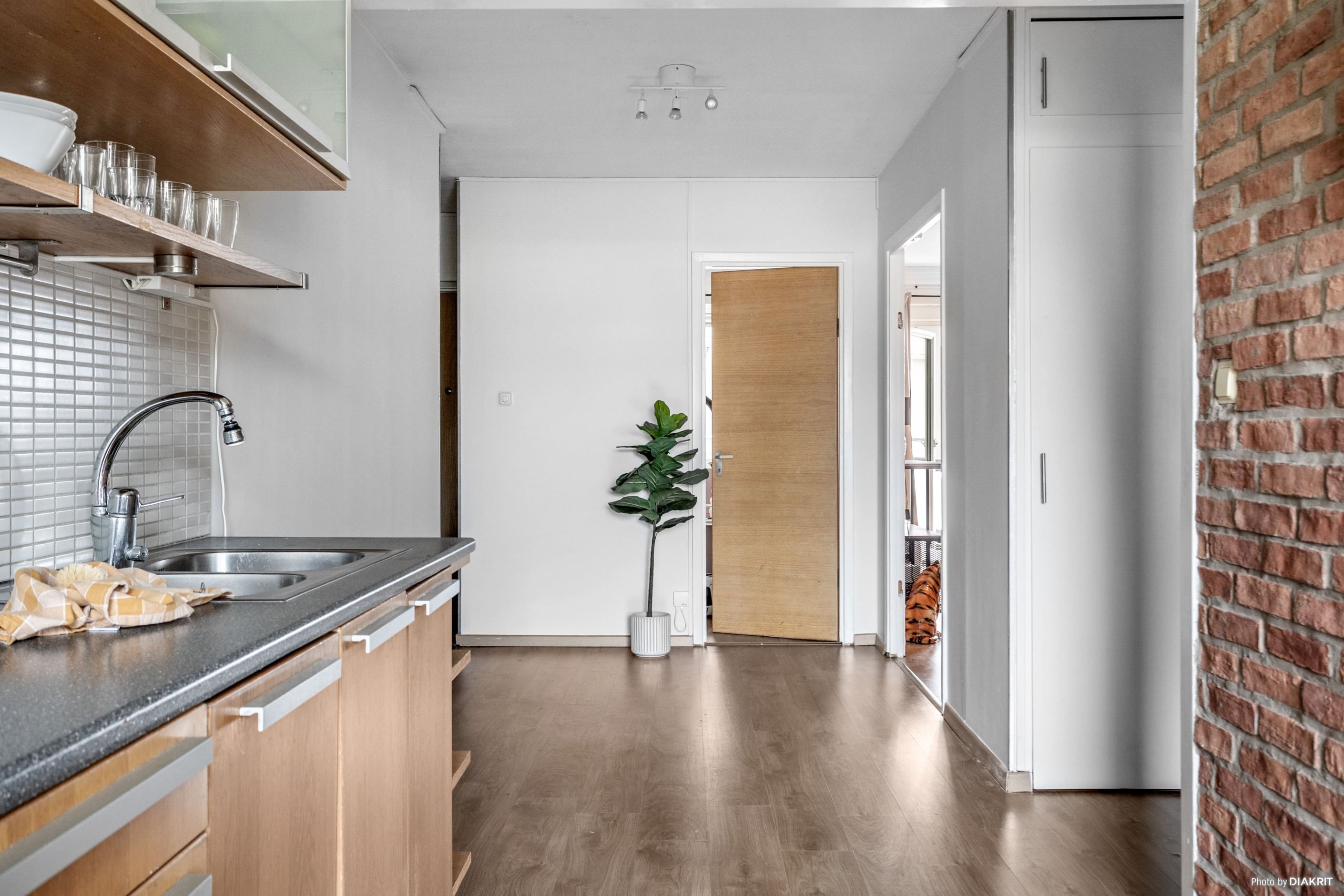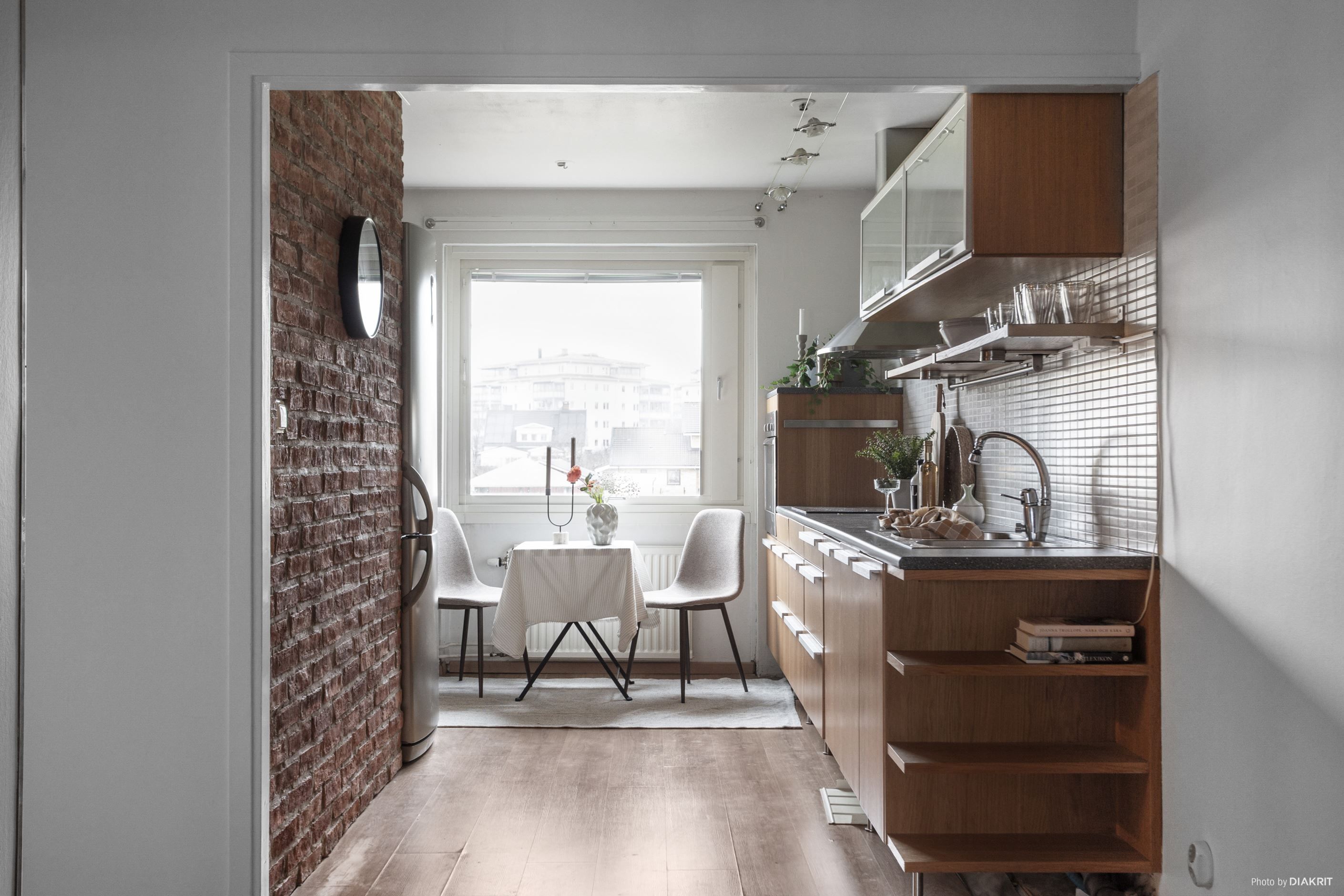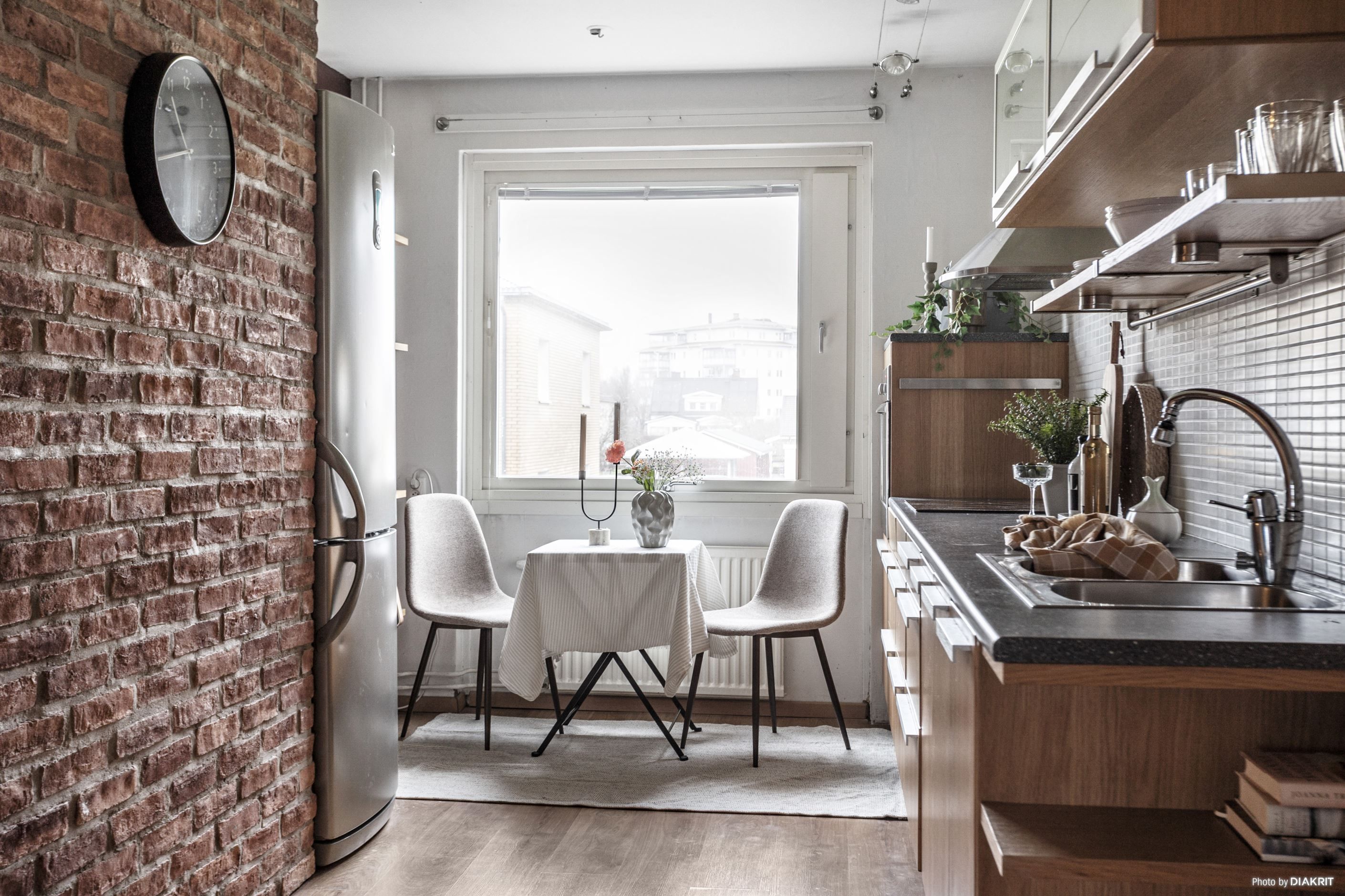 Lägenheten erbjuder ett praktiskt badrum med kakel och klinker, samt ett fint renoverat kök där en snygg tegelvägg möter rostfria vitvaror för en exklusiv och tidlös känsla. Här finns gott om arbetsyta och förvaring för dig som gillar att laga mat.