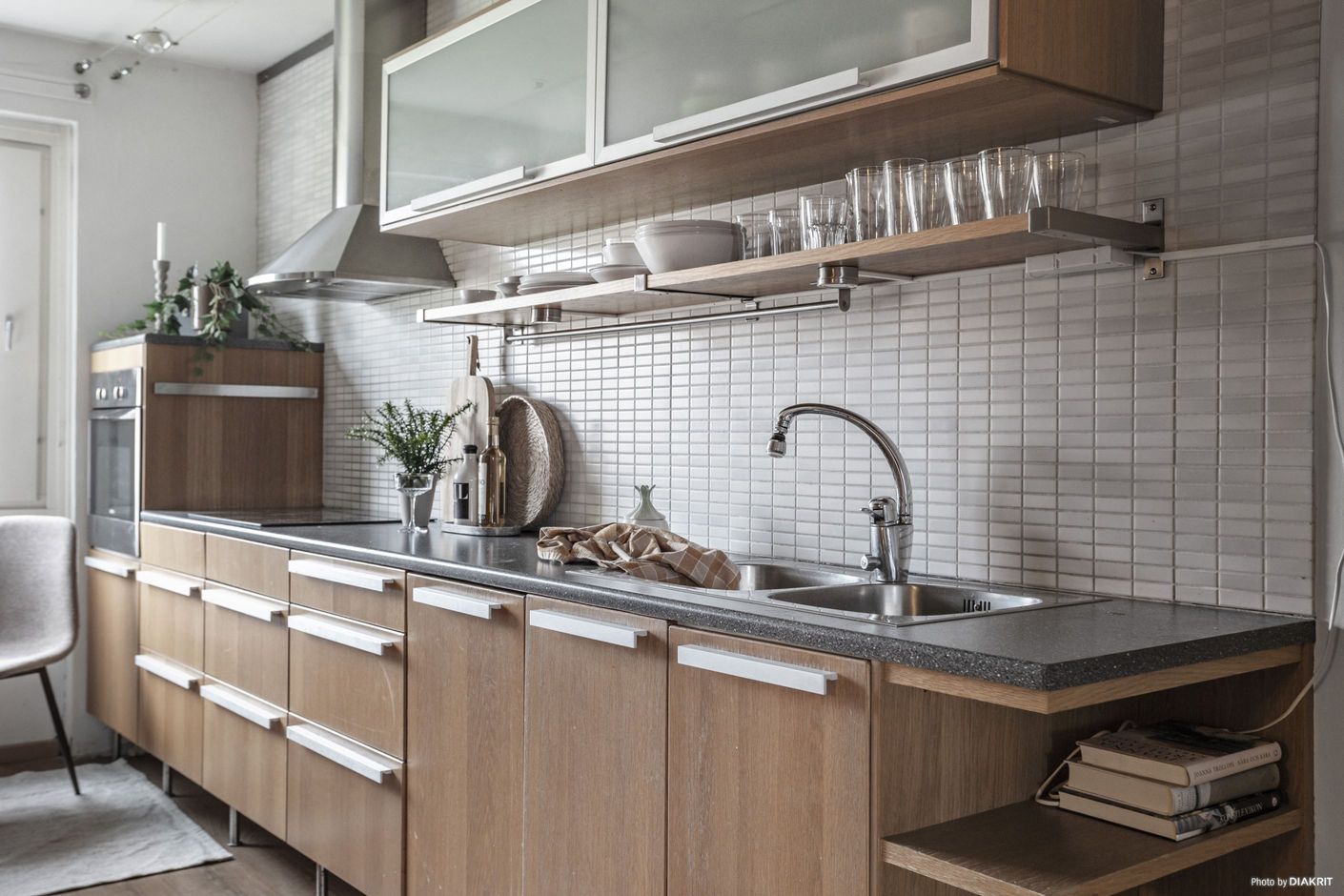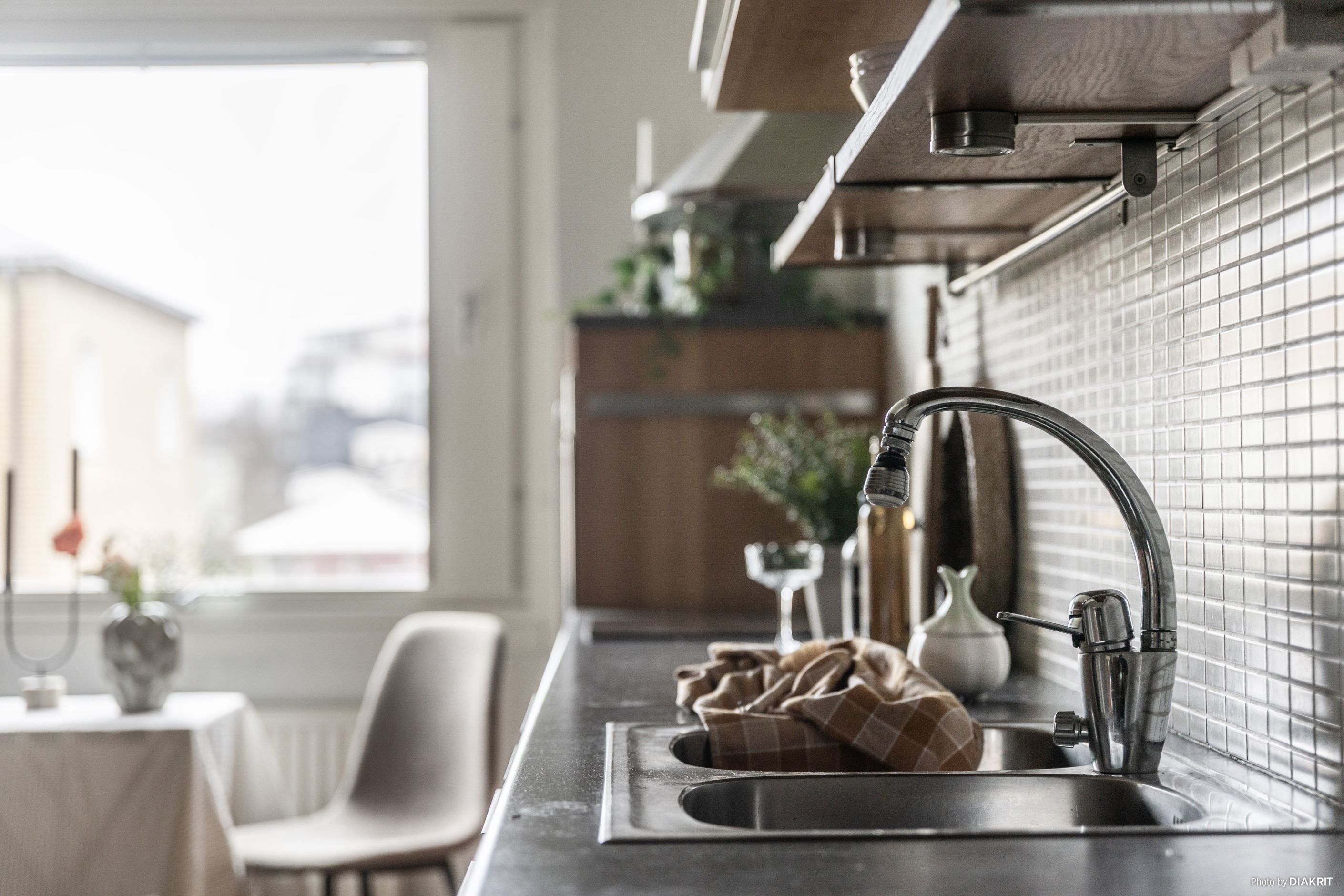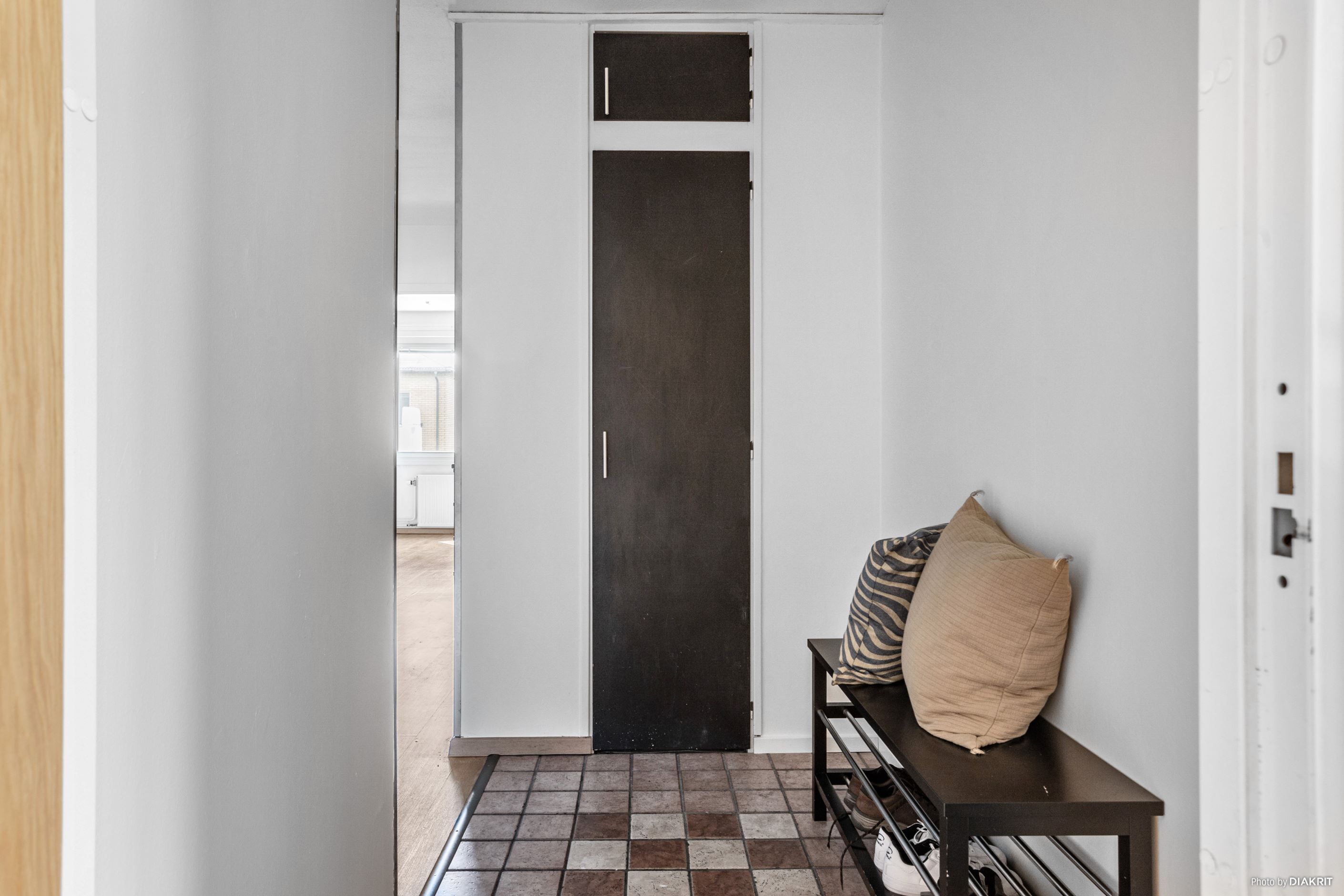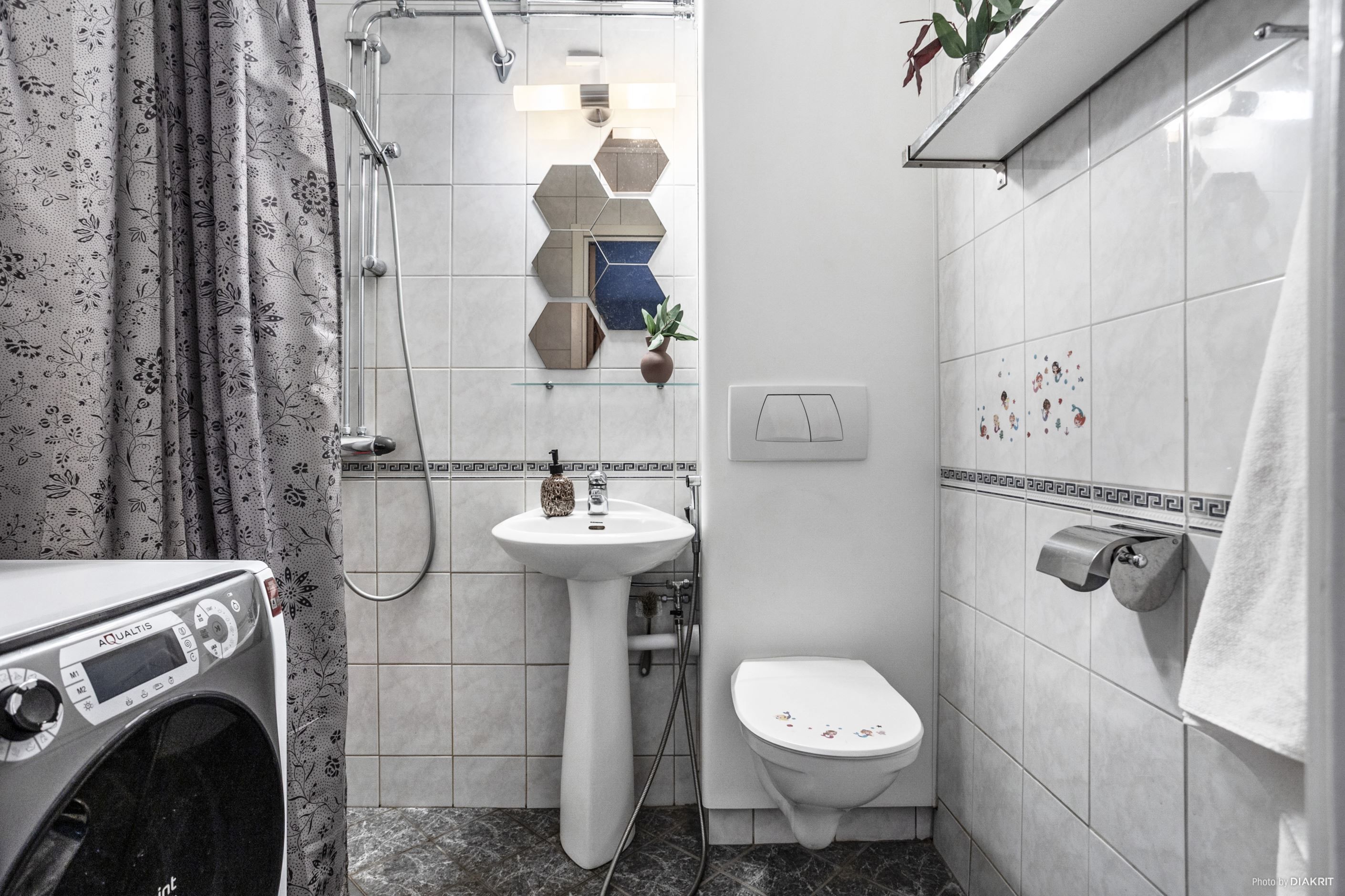 Lägenheten erbjuder ett praktiskt badrum med kakel och klinker, samt ett fint renoverat kök där en snygg tegelvägg möter rostfria vitvaror för en exklusiv och tidlös känsla. Här finns gott om arbetsyta och förvaring för dig som gillar att laga mat.