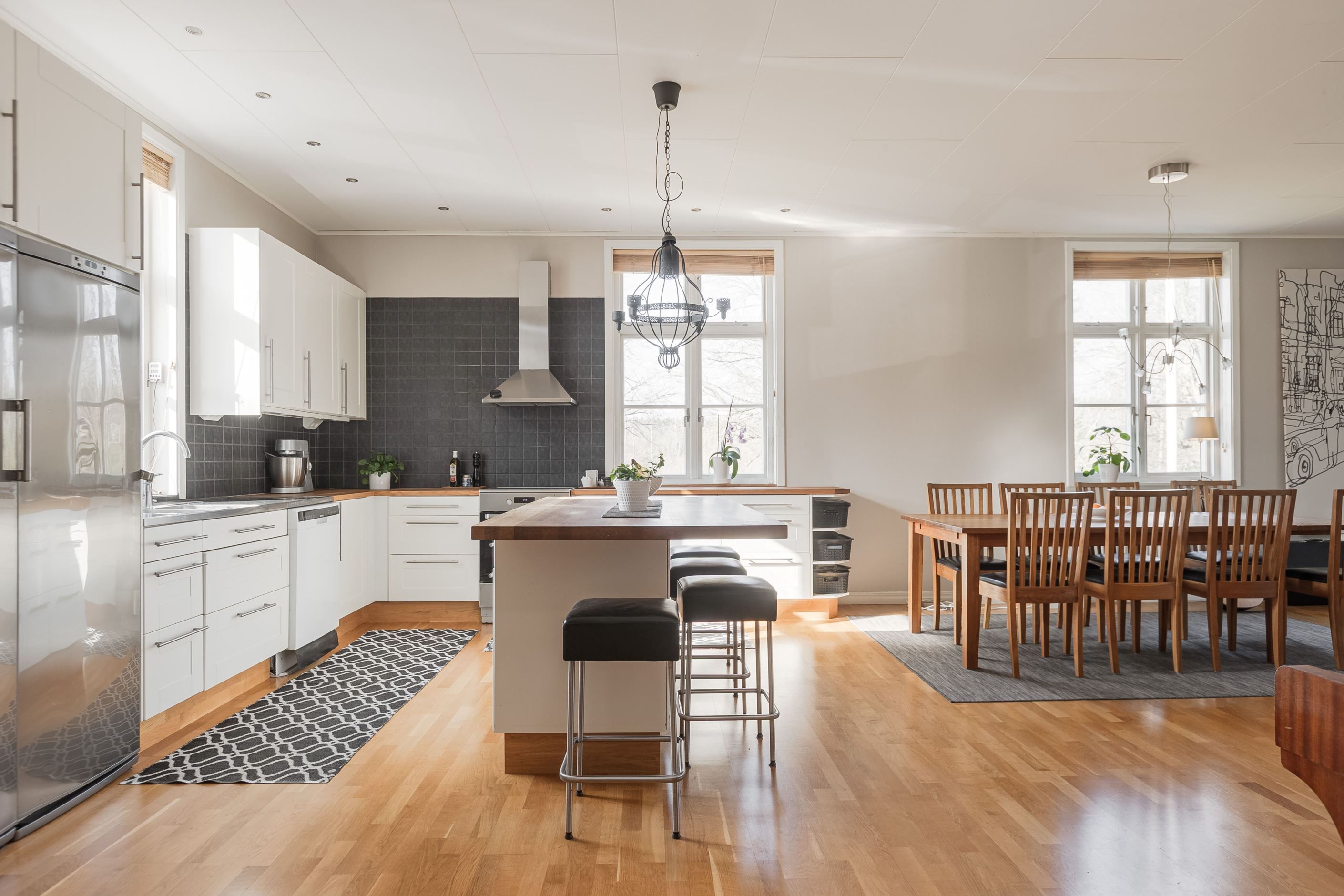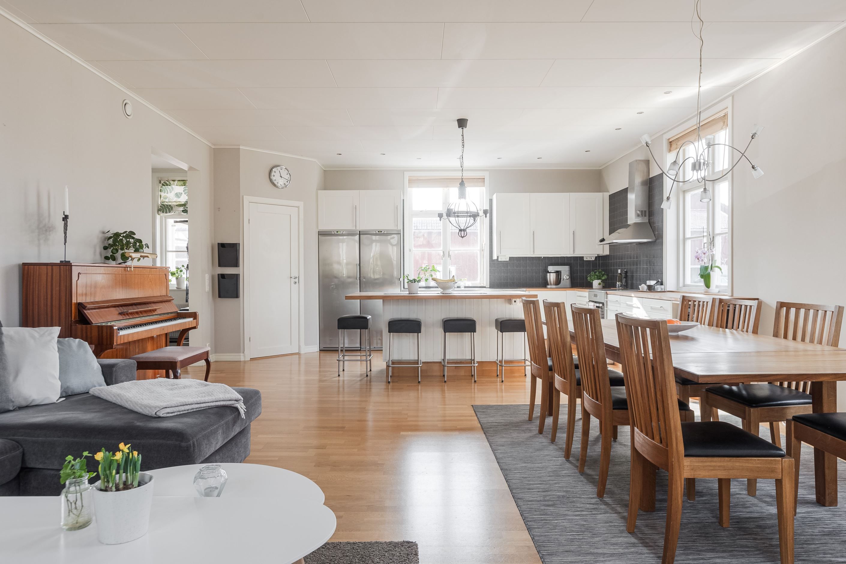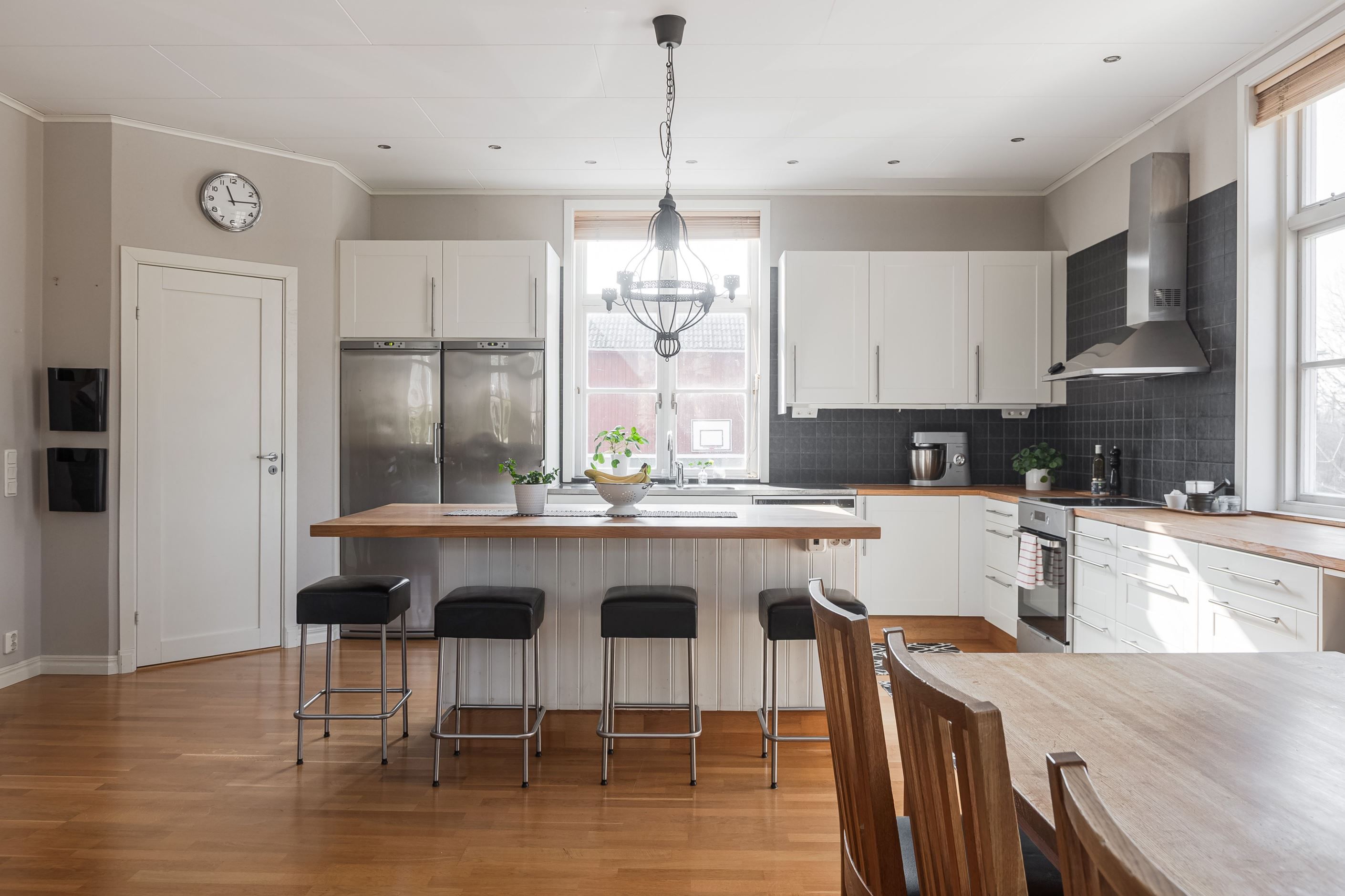 Lägenhet 1 på entréplan om 5 r.o.k på ca 145 kvm med ett duschrum samt toalett, båda med golvvärme. Det forna skolköket och matsalen har öppnats upp och renoverats så här finns gott om plats för socialt umgänge med familj och vänner. Stor entré med golvvärme och möblerbar hall. Härligt med gott om plats på altanen för fina dagar, altanen är delvis inglasad.