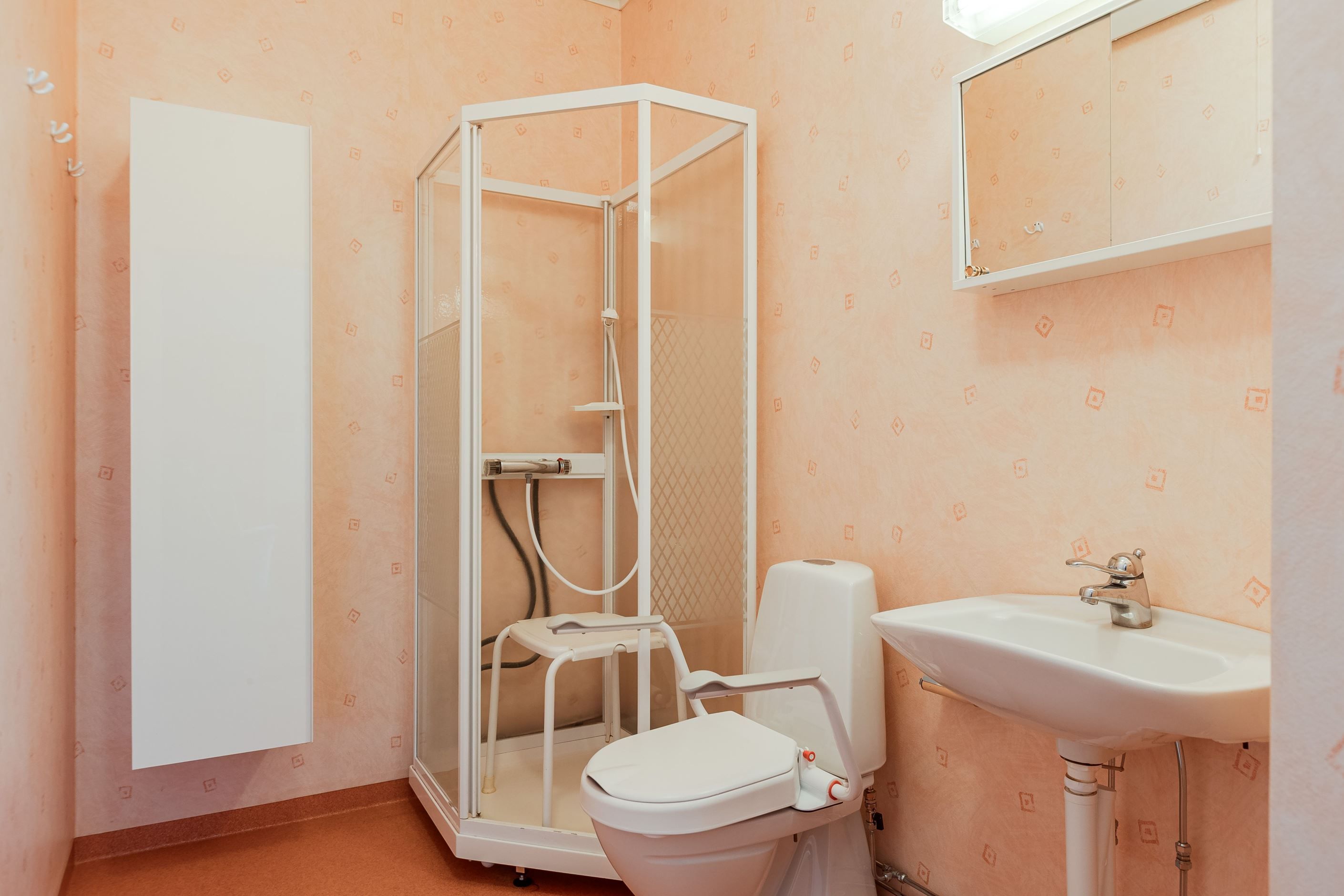 Lägenhet 2 på övre plan om 2 r.o.k på ca 48 kvm som förr var skolsysterns mottagning. Mindre hall som flyter ihop med kök och vardagsrum samt sovrum. Duschrum med plastmatta och duschkabin.