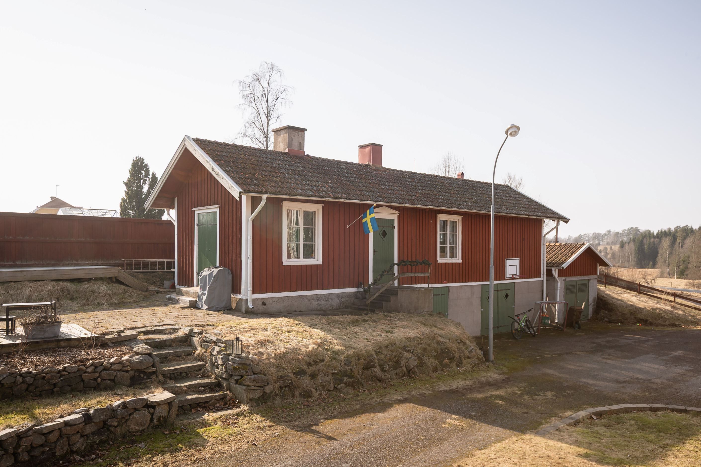 Här bjuds på hela 320 luftiga kvadratmeter fördelade på tre lägenheter. Säljaren önskar sälja denna fastighet tillsammans med grannfastigheten där en nybyggd ekonomibyggnad uppfördes 2005 som värmecentral och silo för att senare användas som bryggeri/garage/förråd. Vatten och el finns i byggnaden och sidotak på ena långsidan vilket möjliggör förvaring under tak. På denna anslutande fastighet finns även solceller monterade som nyttjas av huvudbostaden och bidrar till fördelaktig boendekalkyl i kombination med bergvärme, varför säljaren önskar sälja båda fastigheterna vid samma tillfälle. Det gäller fastigheterna Vaggeryd Tofteryd 4:4 och 4:8.