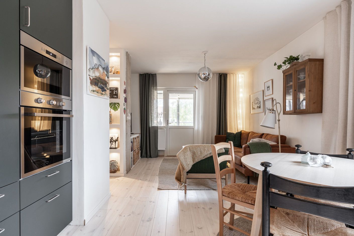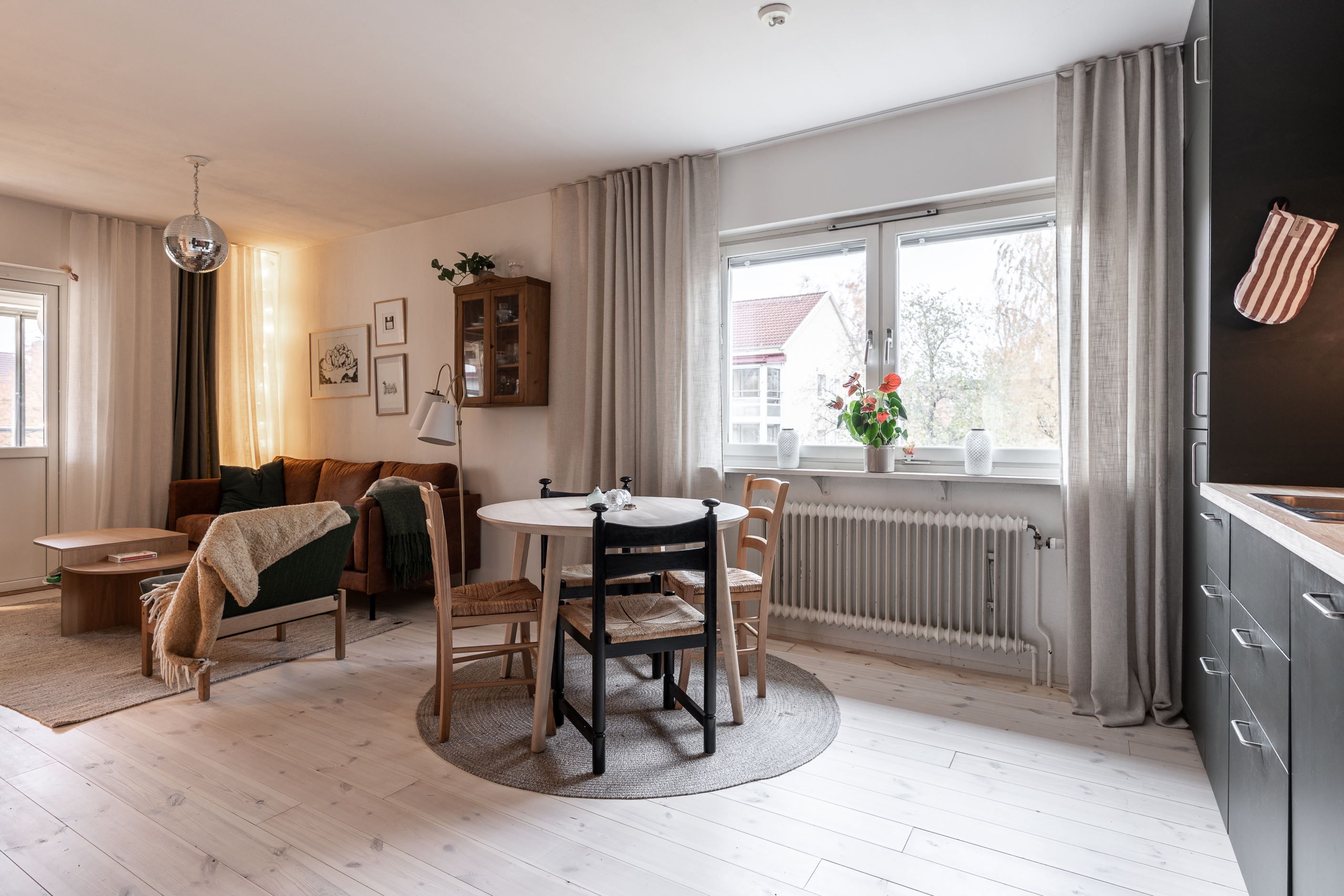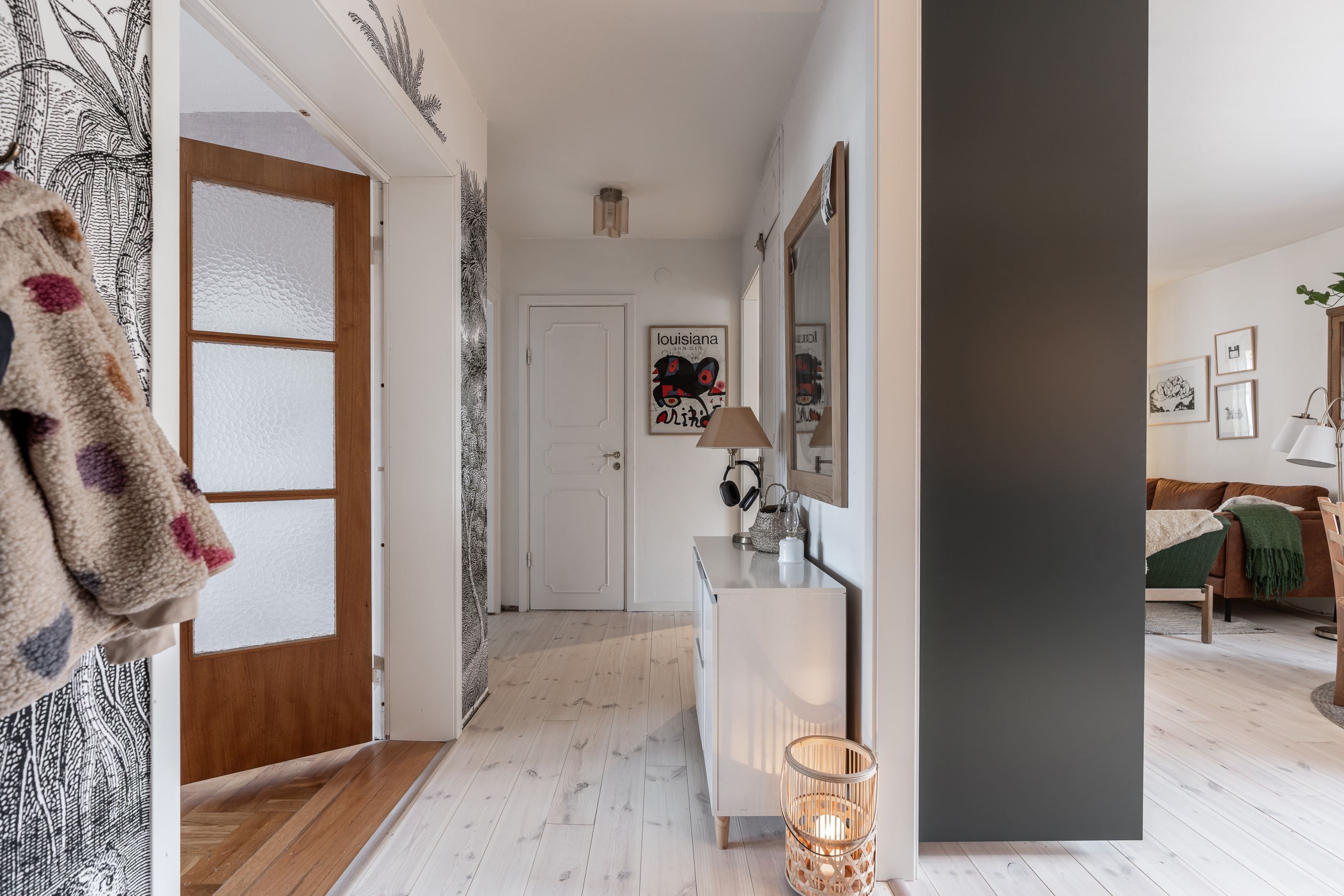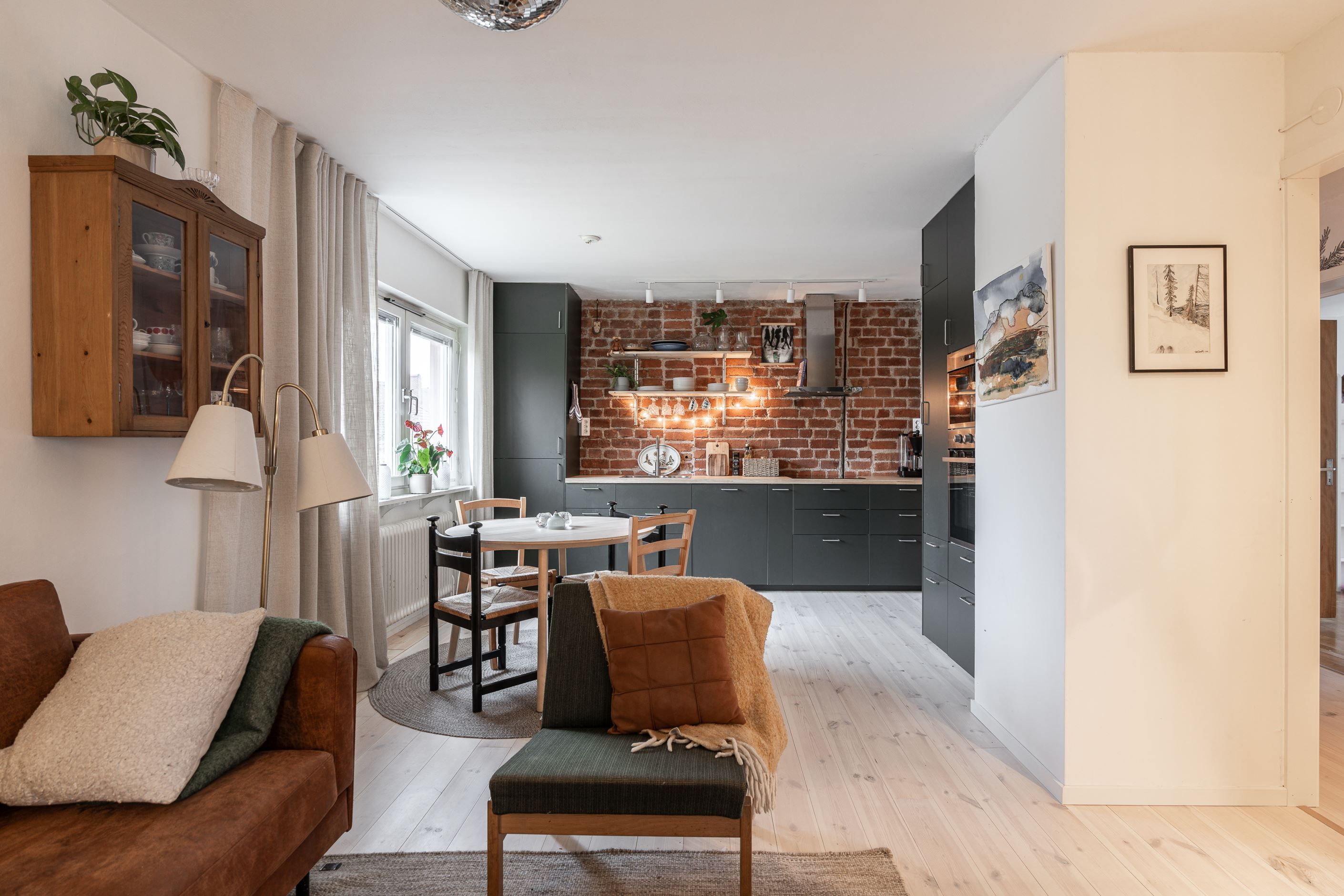 Bostaden har nyligen genomgått en totalrenovering där stil och kvalitet stått i fokus. Resultatet är ett modernt hem med ljusa ytskikt, nya golv och genomtänkta materialval. Köket har fått en uppdaterad design med snygga tegeldetaljer som skapar stark karaktär och värme, medan det härliga trägolvet adderar en tidlös charm.