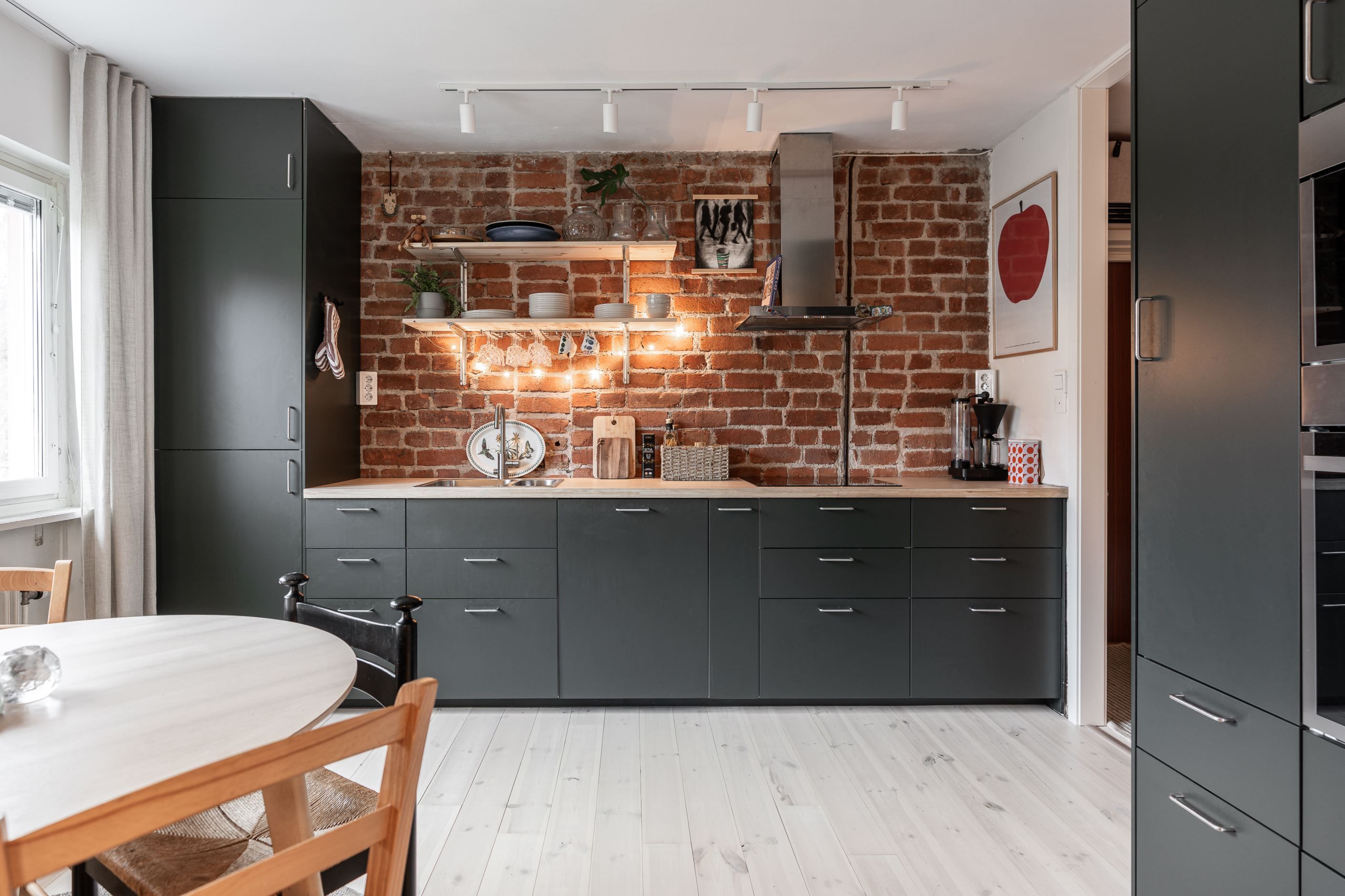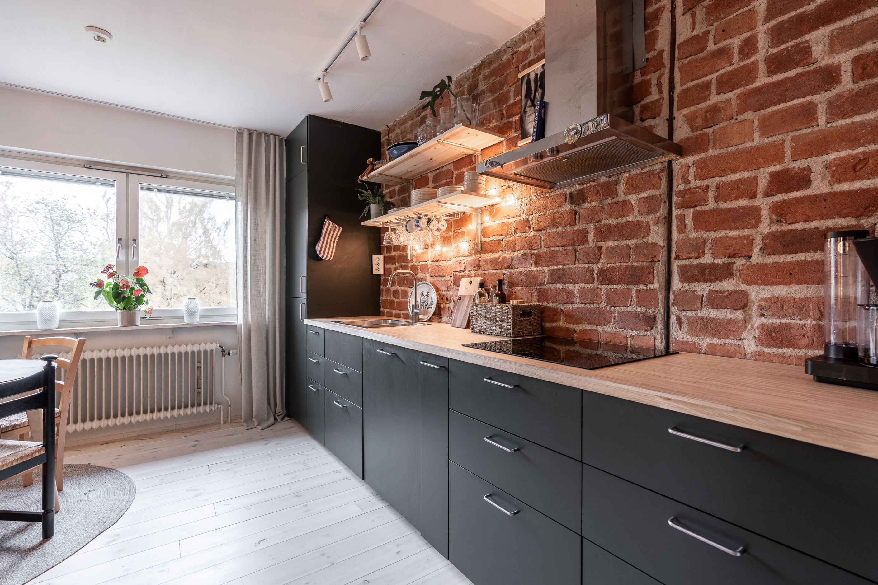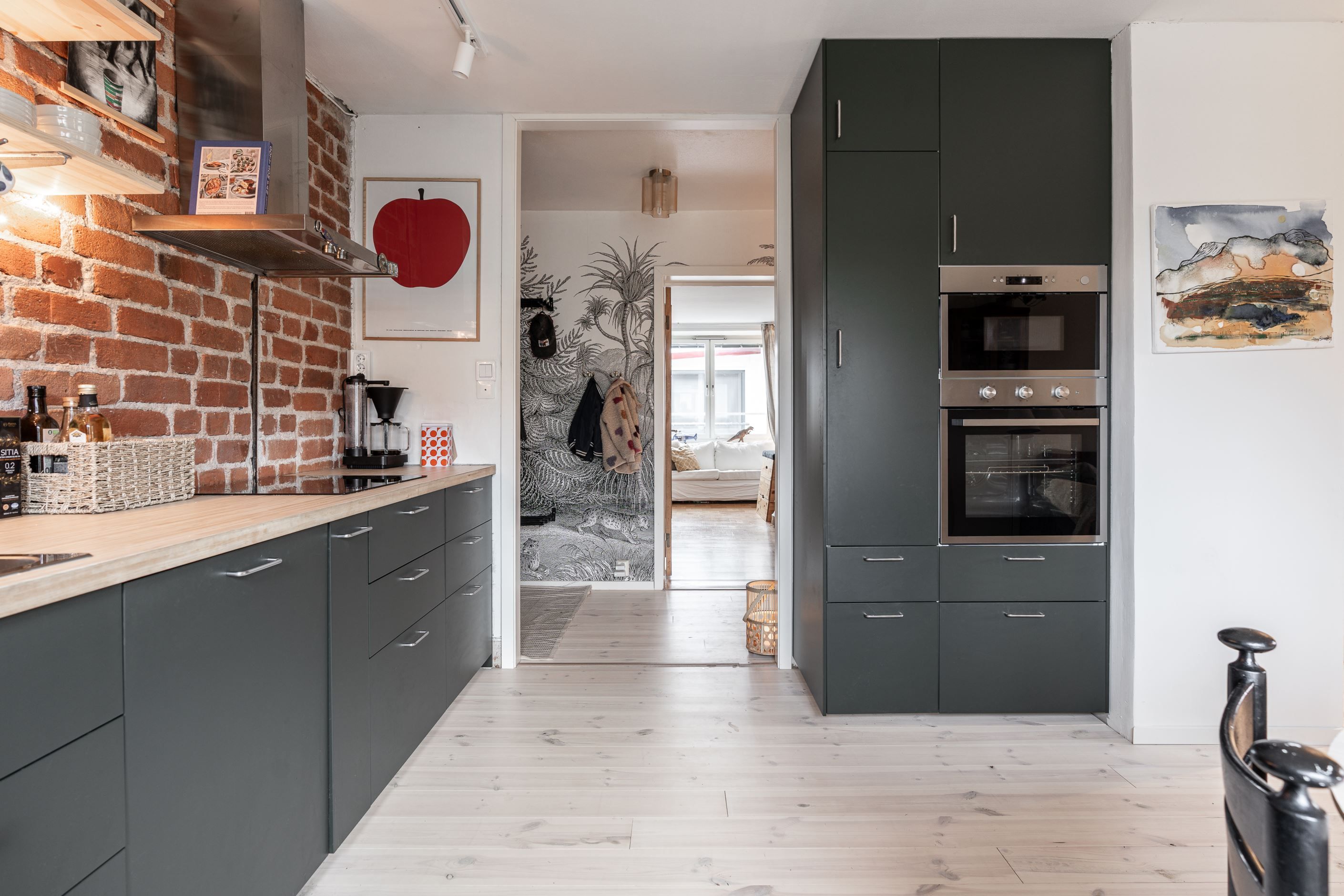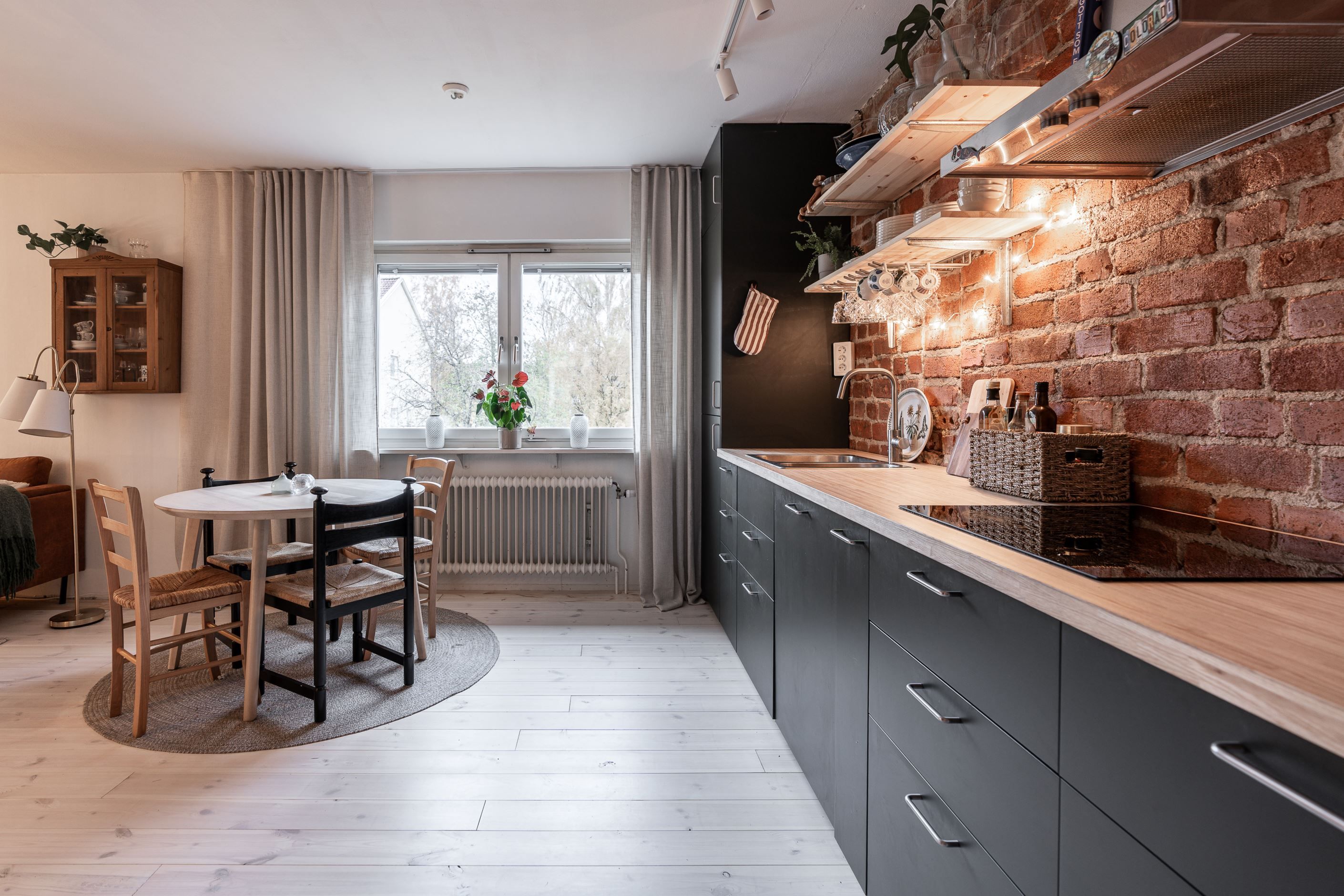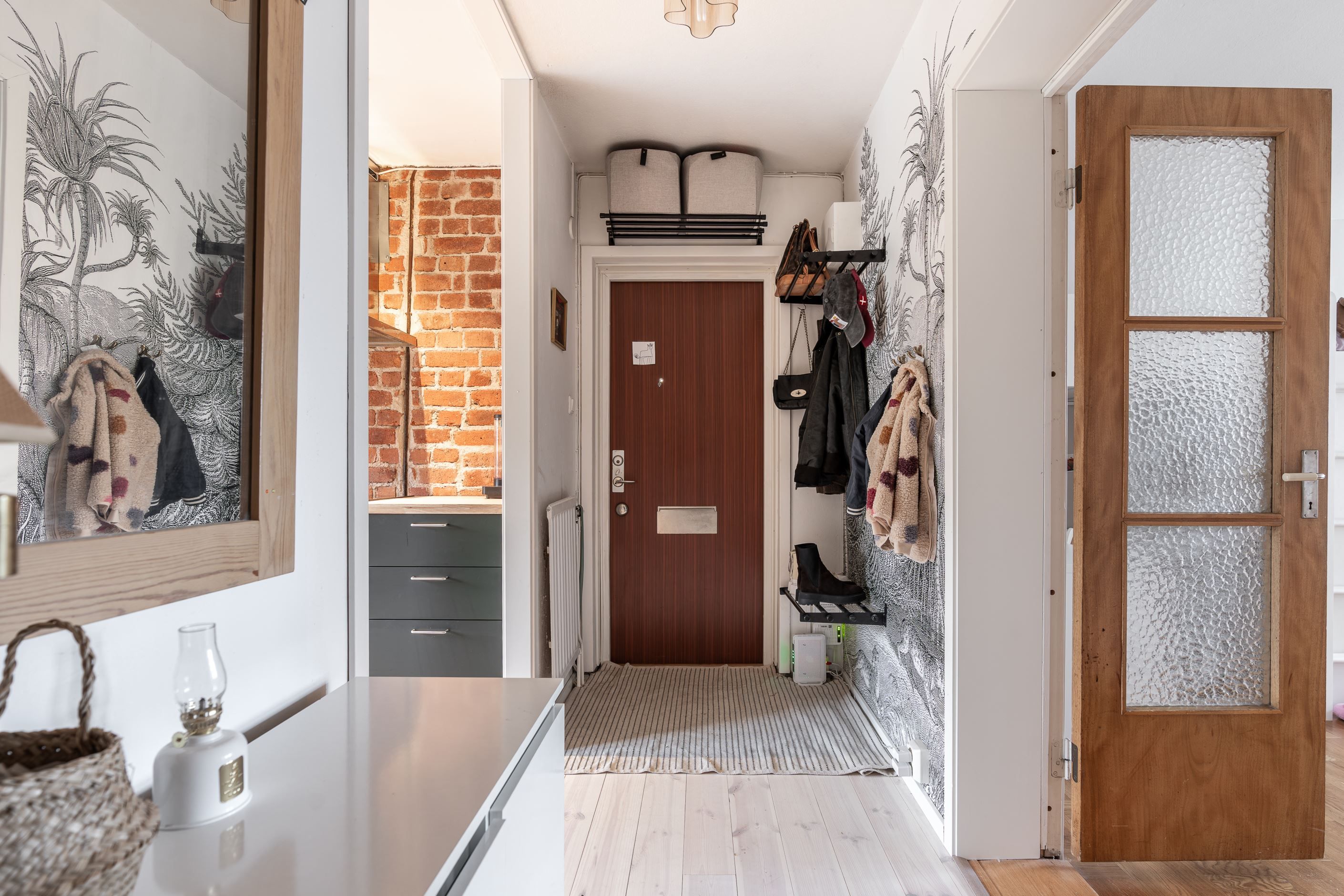 Bostaden har nyligen genomgått en totalrenovering där stil och kvalitet stått i fokus. Resultatet är ett modernt hem med ljusa ytskikt, nya golv och genomtänkta materialval. Köket har fått en uppdaterad design med snygga tegeldetaljer som skapar stark karaktär och värme, medan det härliga trägolvet adderar en tidlös charm.