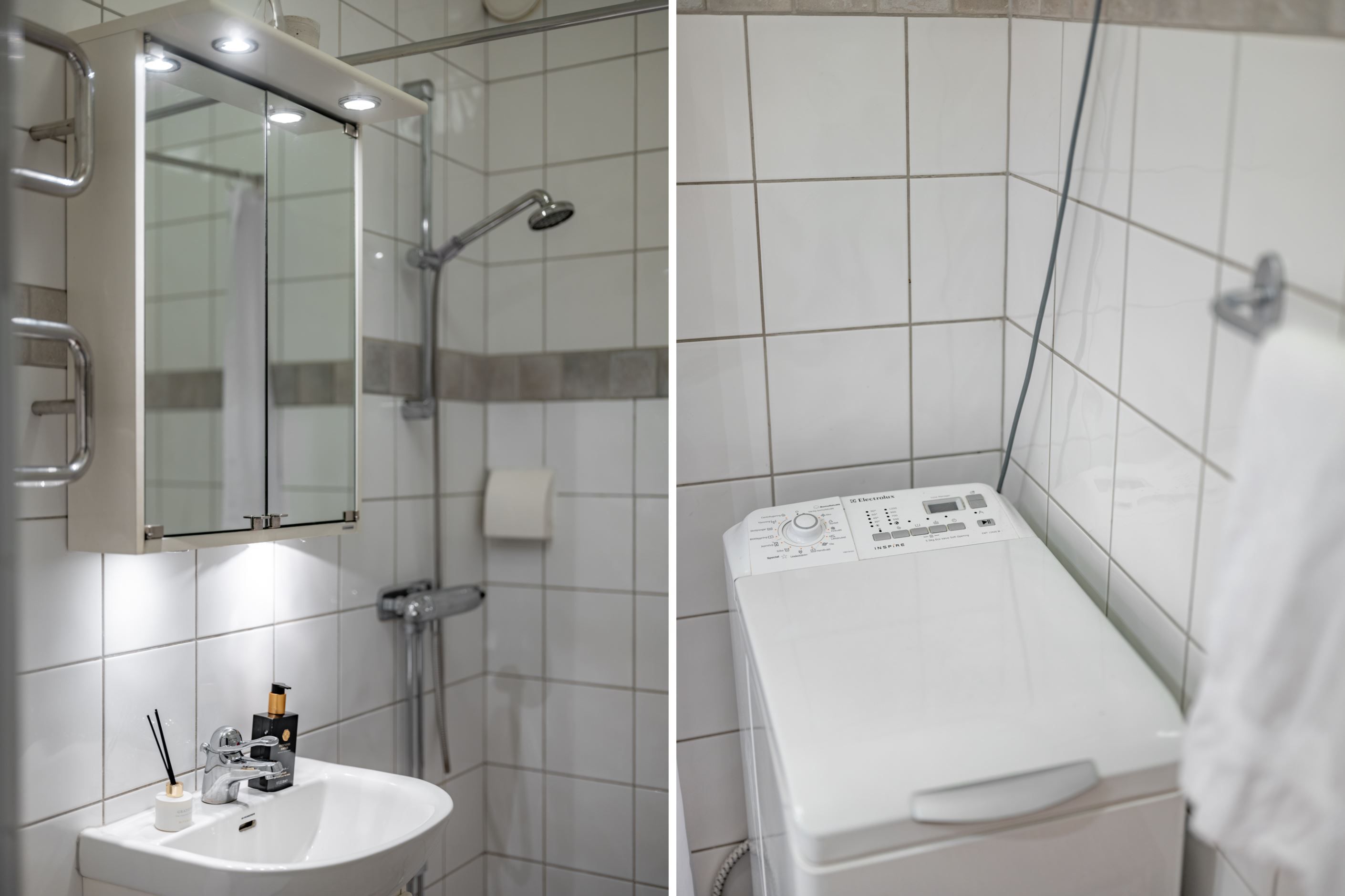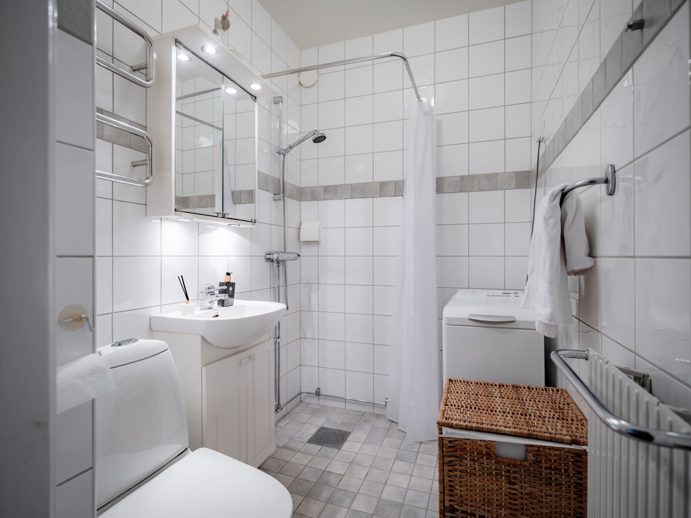 Badrummet är stambytt och helkaklat i tidlöst utförande, vilket ger en fräsch och lättskött miljö. Badrummet är utrustat med dusch, handdukstork och tvättmaskin. Genomgående vackra golv, smakfull färgsättning och stilsäkra inredningsval skapar ett hem där du inte behöver göra annat än att flytta in och trivas. Två förråd disponeras av lägenheten och erbjuder gott om förvaring. Flera garderober finns även i vardagsrummet.