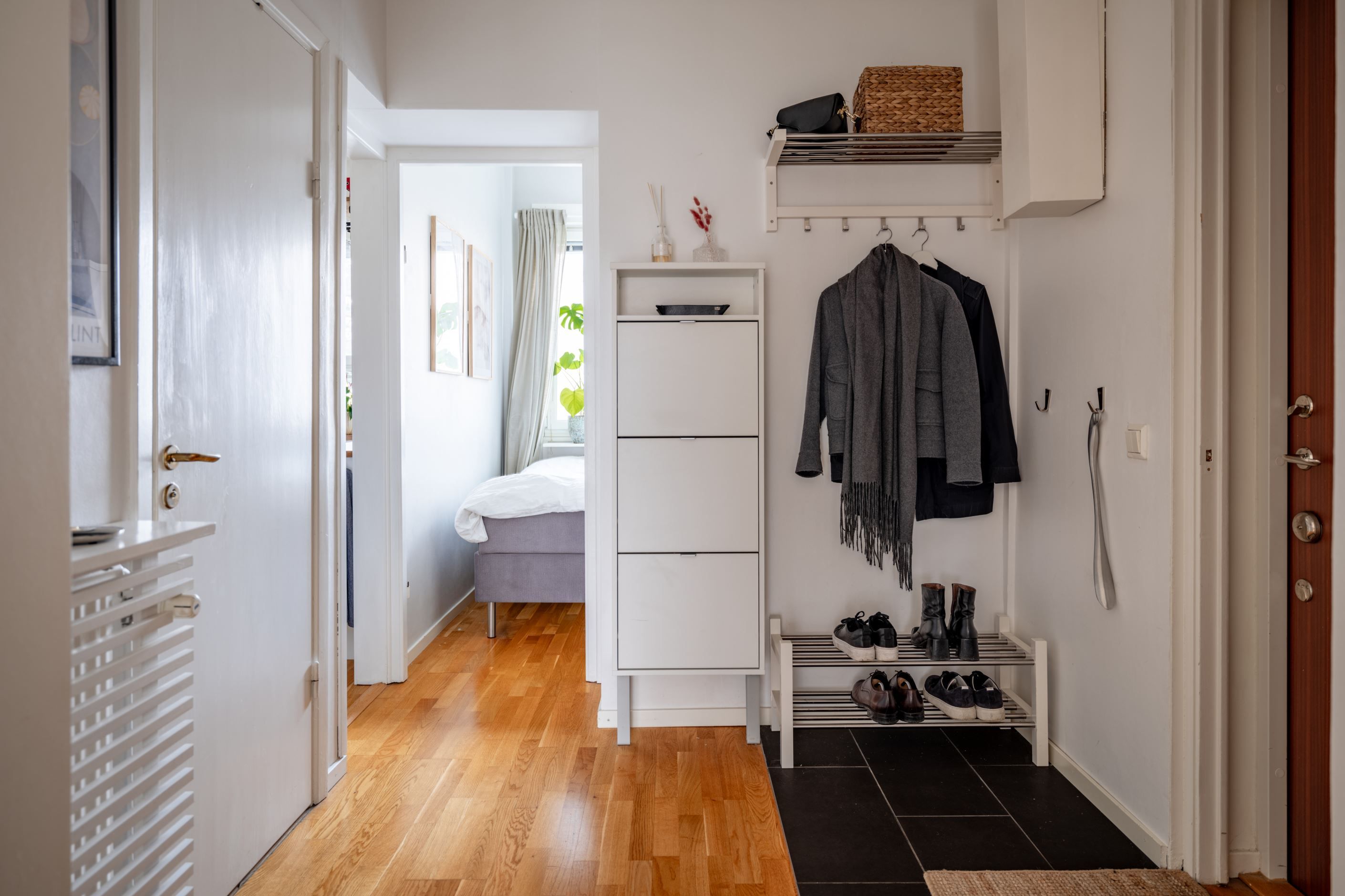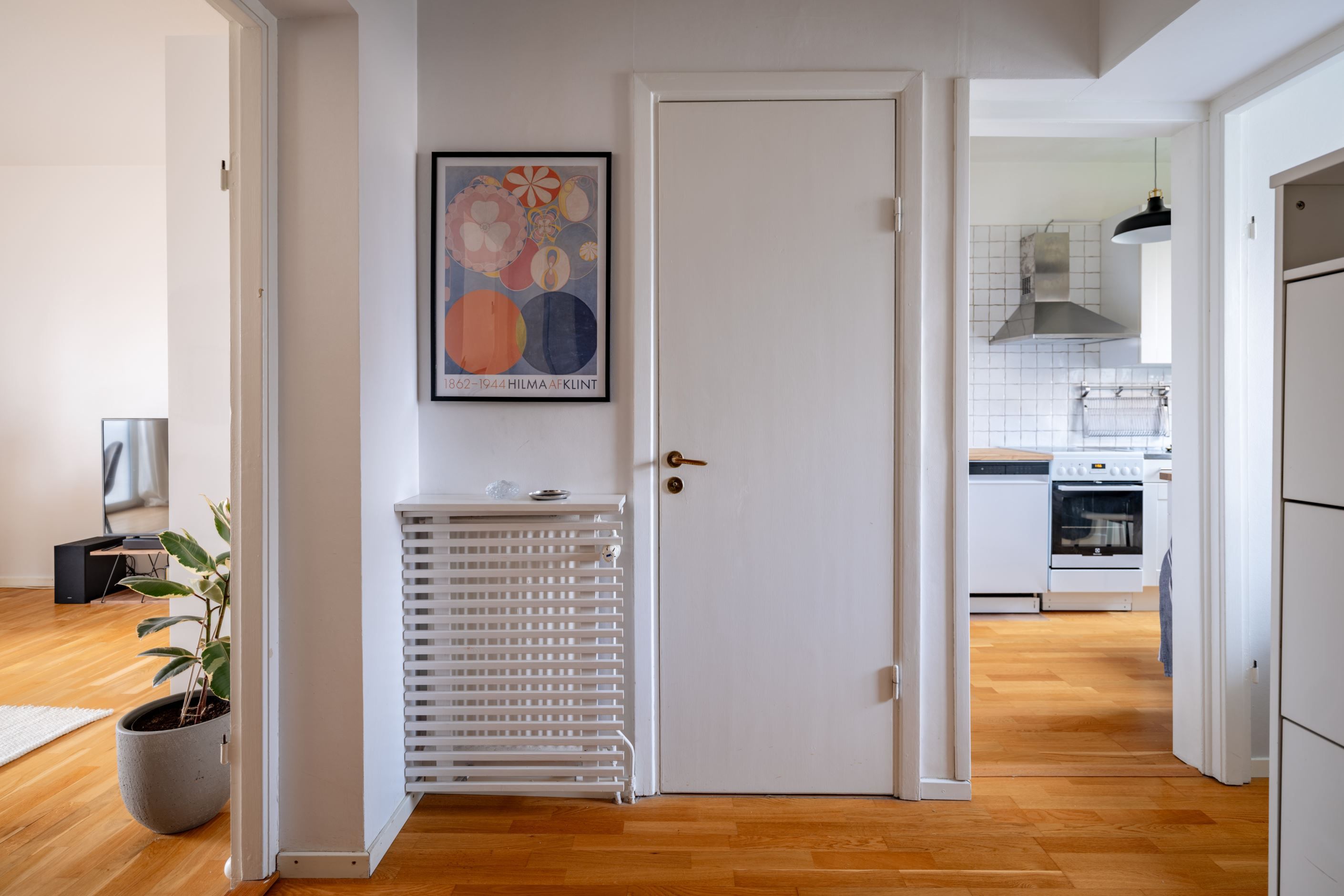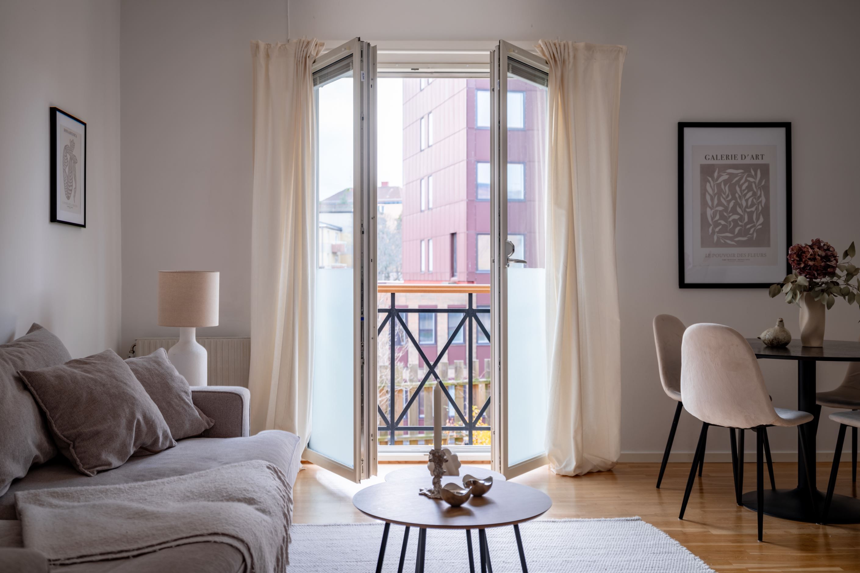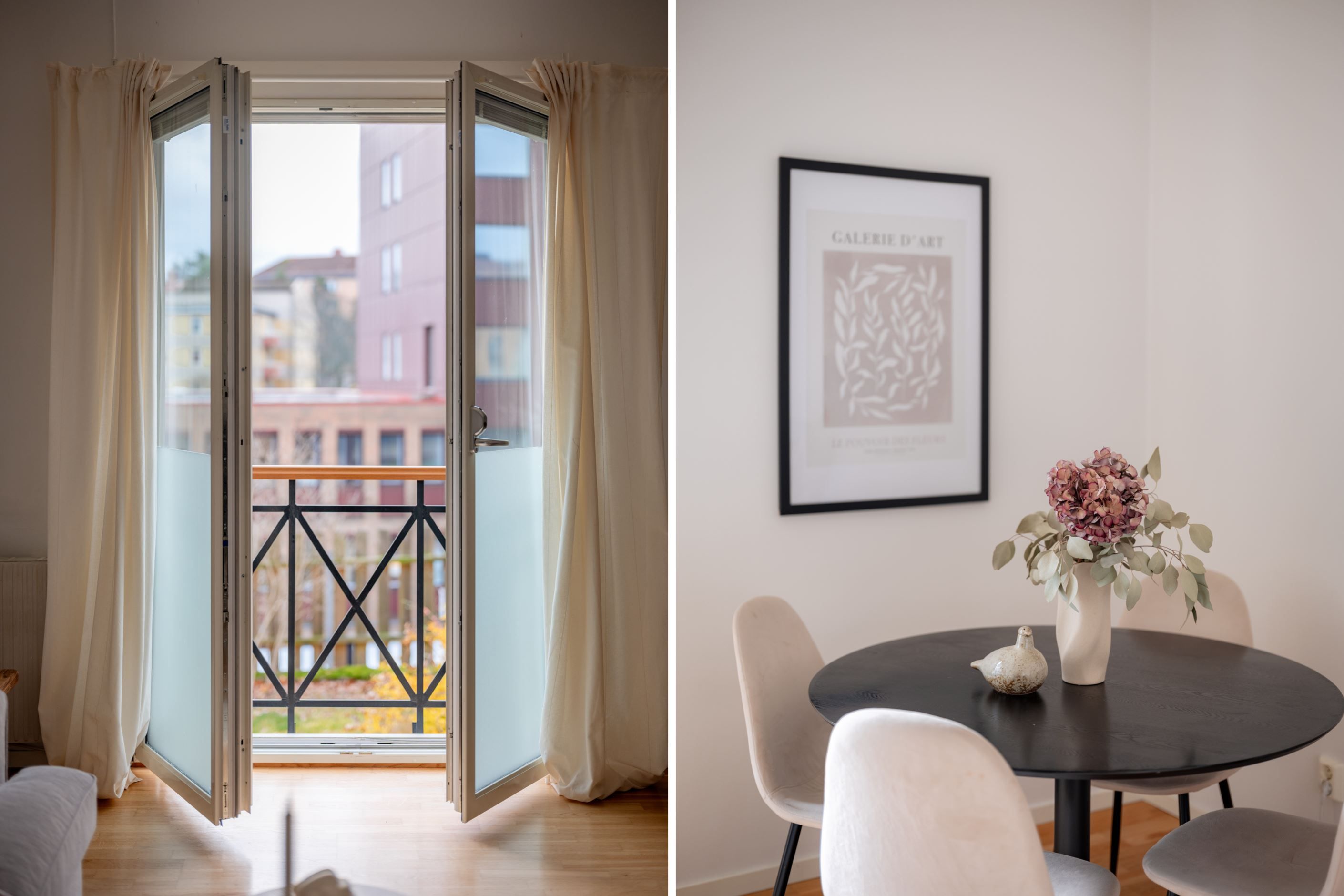 Det stilrena köket bjuder in till matlagning, medan vardagsrummet med sin franska balkong blir hemmets naturliga samlingspunkt. Här kan du slå upp balkongdörrarna och njuta av ljuset. Sovrummet erbjuder plats för dubbelsäng, garderob och till och med ett mindre skrivbord – perfekt för den som arbetar hemifrån.