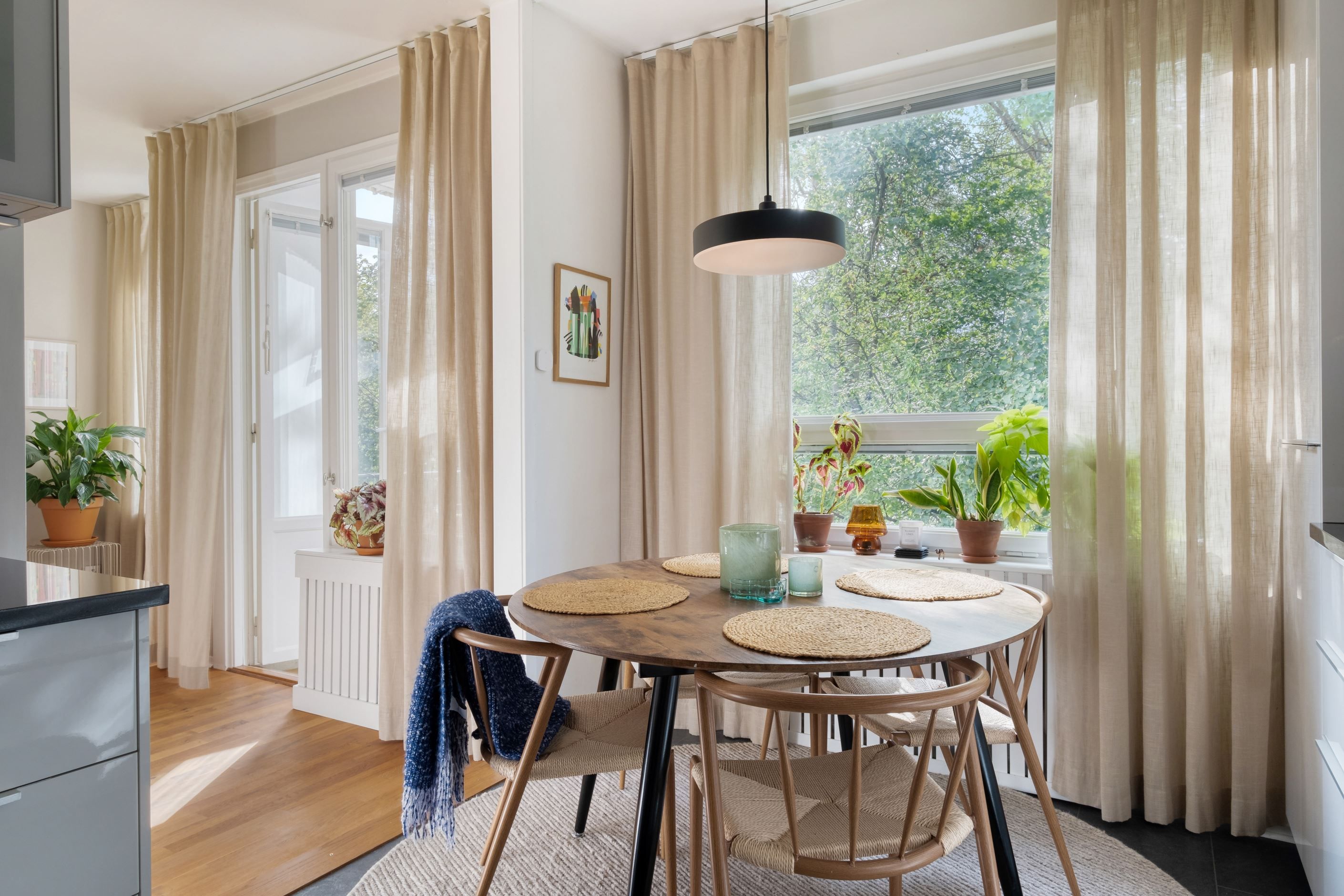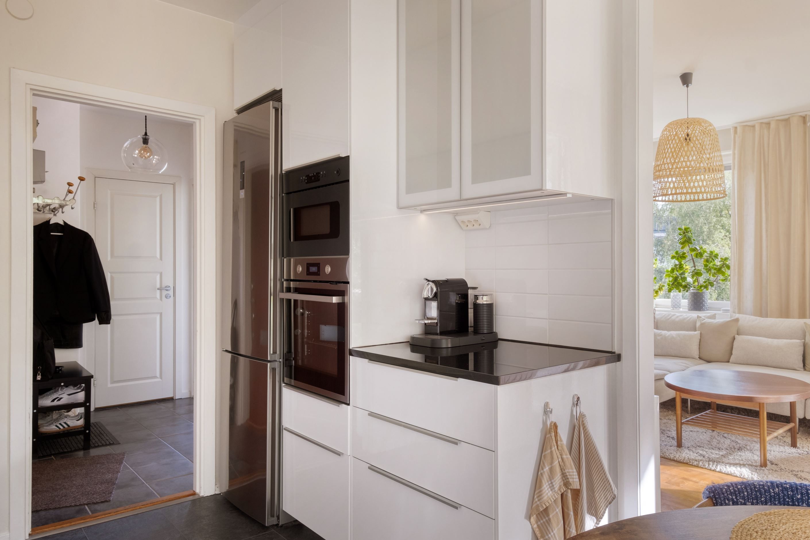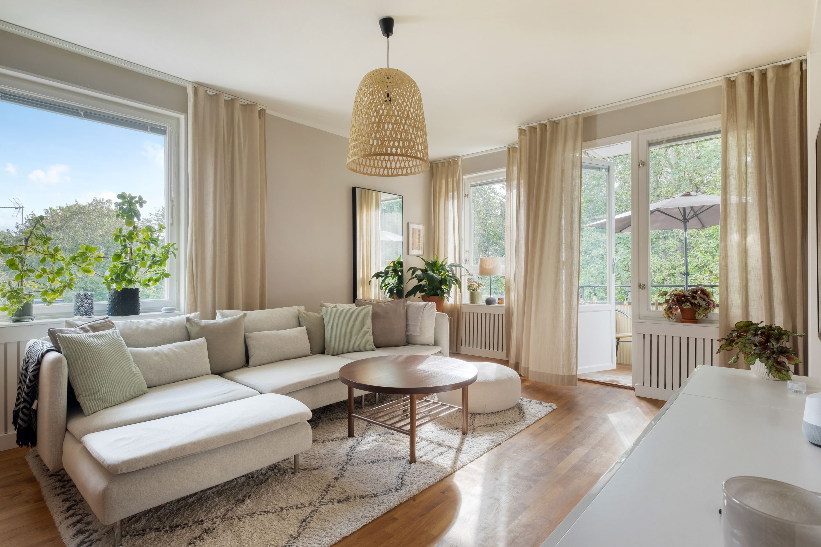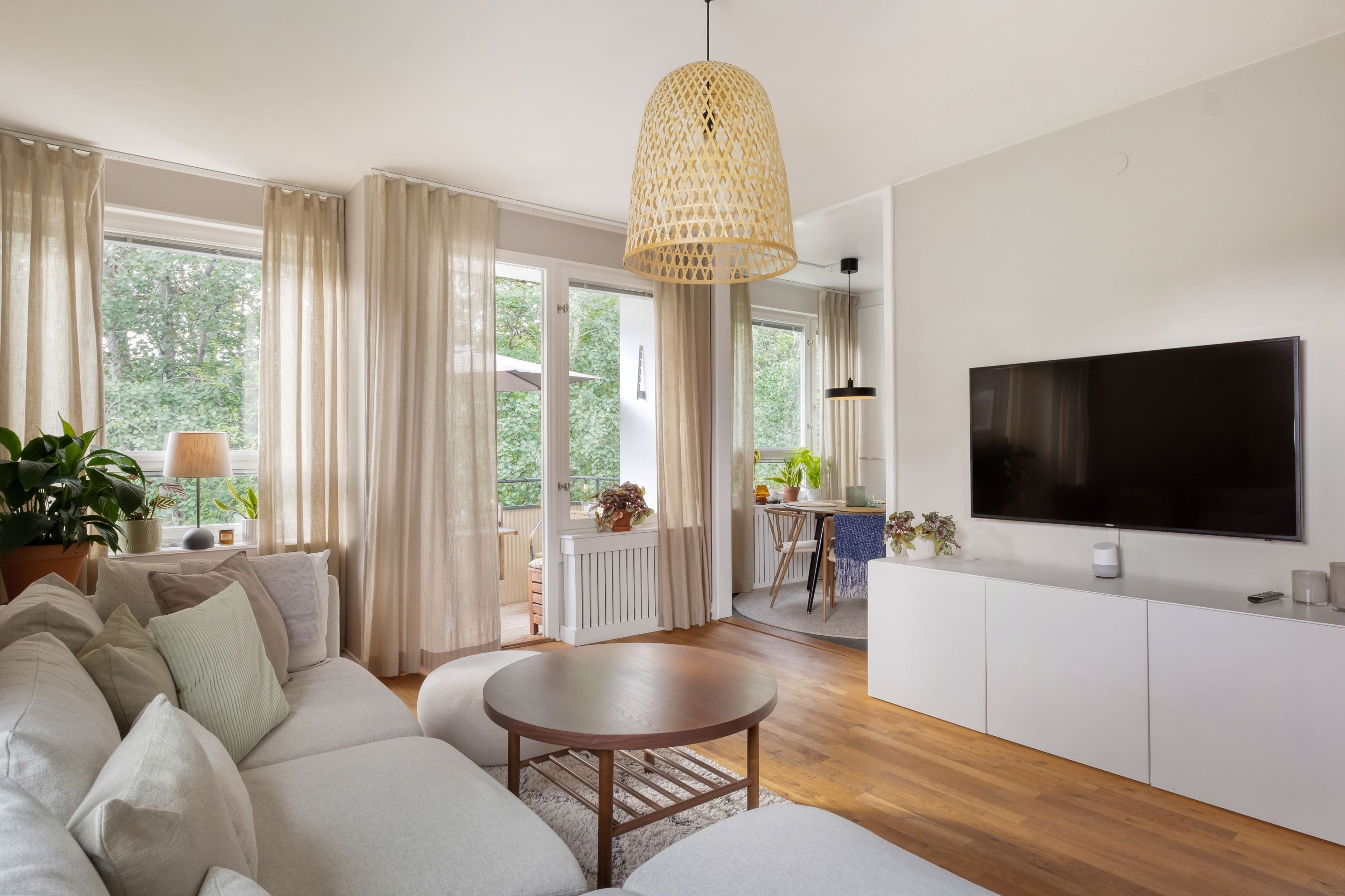 Här finner ni generösa sällskapsytor och gott om plats för större möblemang i varje rum. Det rymliga vardagsrummet förlängs av den mysiga balkongen i söderläge som bjuder på många härliga soltimmar med utsikt över lummig grönska. Vardagsrummet ligger i öppen och social planlösning med det stilrena köket som erbjuder gott om arbetsyta samt förvaringsmöjligheter. Köket är smakfullt utformat med mjuka linjer, tidlös färgsättning och en komplett maskinell utrustning. Intill det stora fönsterpartiet finns det en naturlig plats för matbord.