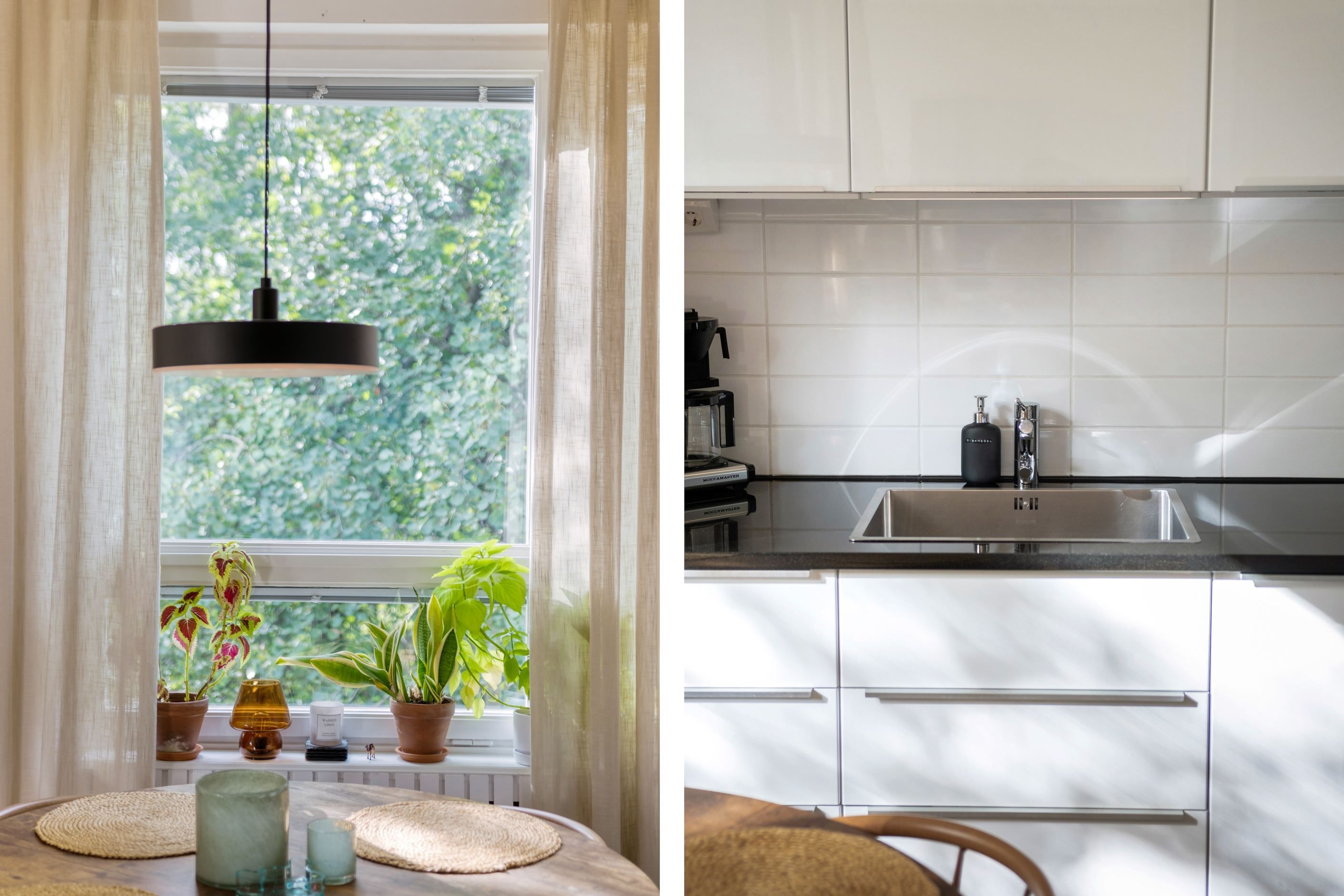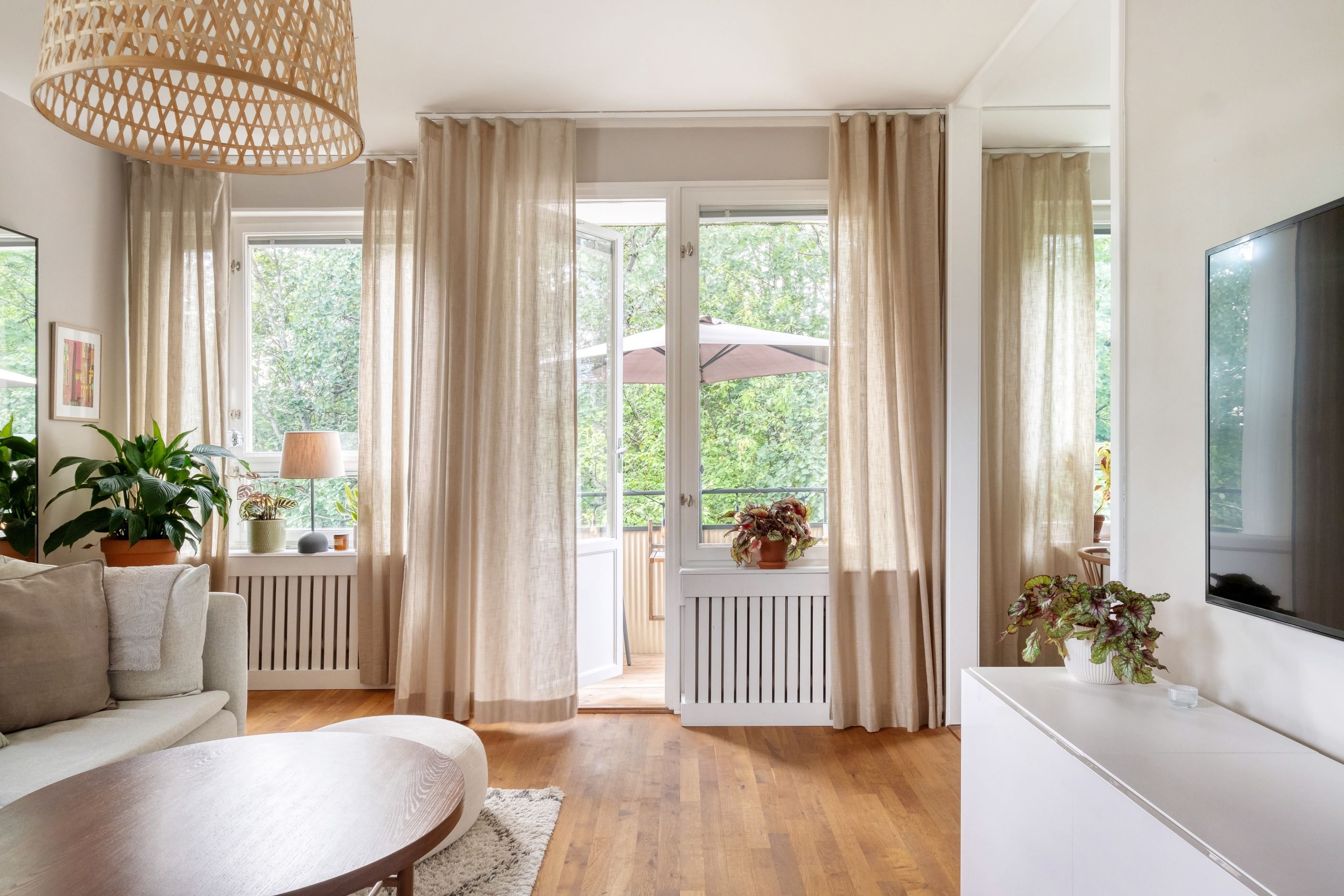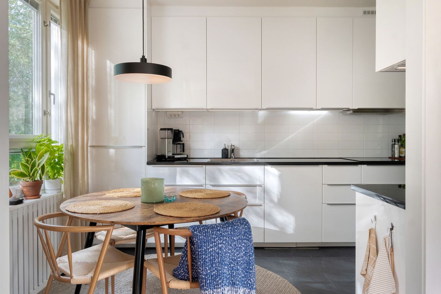 Här finner ni generösa sällskapsytor och gott om plats för större möblemang i varje rum. Det rymliga vardagsrummet förlängs av den mysiga balkongen i söderläge som bjuder på många härliga soltimmar med utsikt över lummig grönska. Vardagsrummet ligger i öppen och social planlösning med det stilrena köket som erbjuder gott om arbetsyta samt förvaringsmöjligheter. Köket är smakfullt utformat med mjuka linjer, tidlös färgsättning och en komplett maskinell utrustning. Intill det stora fönsterpartiet finns det en naturlig plats för matbord.