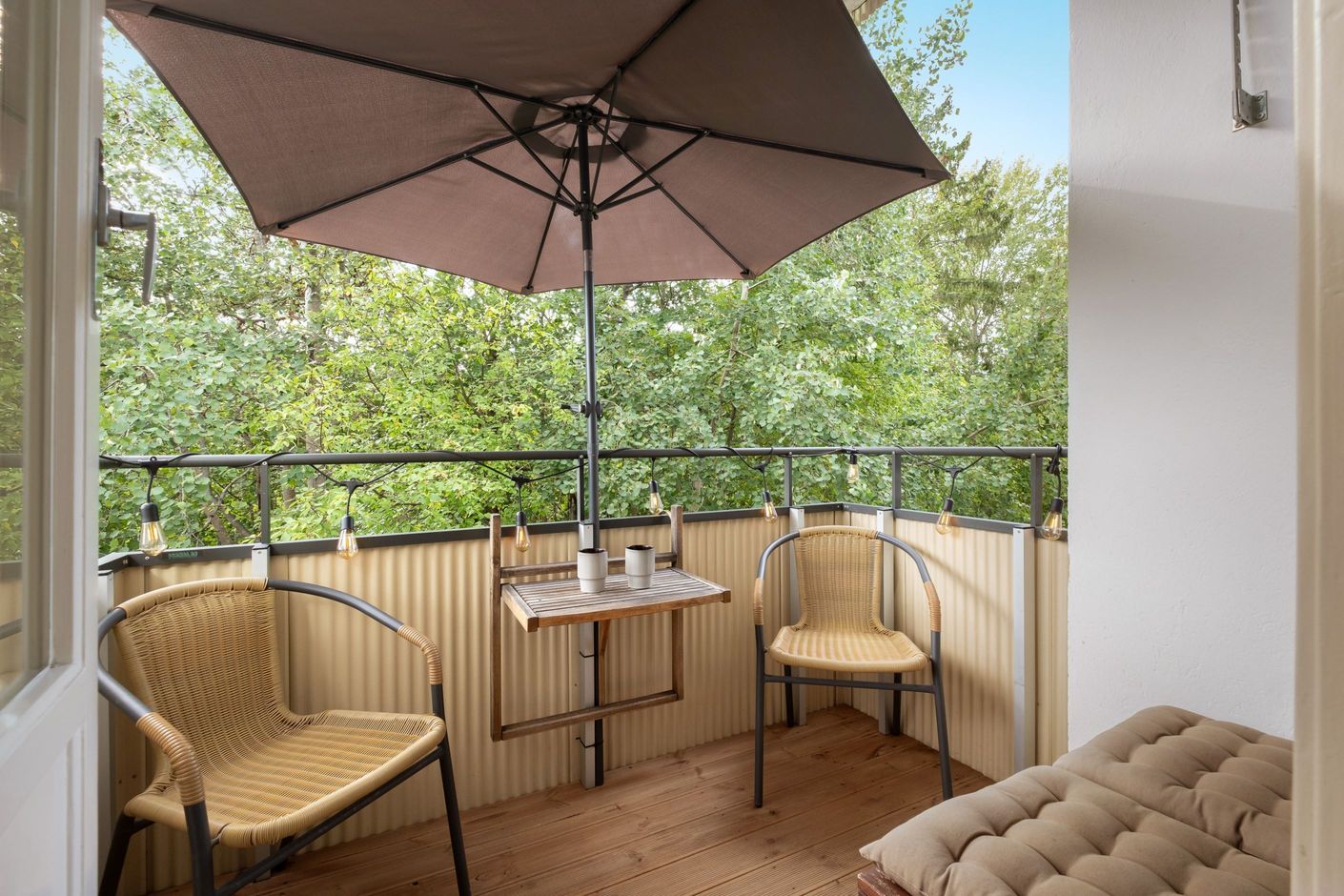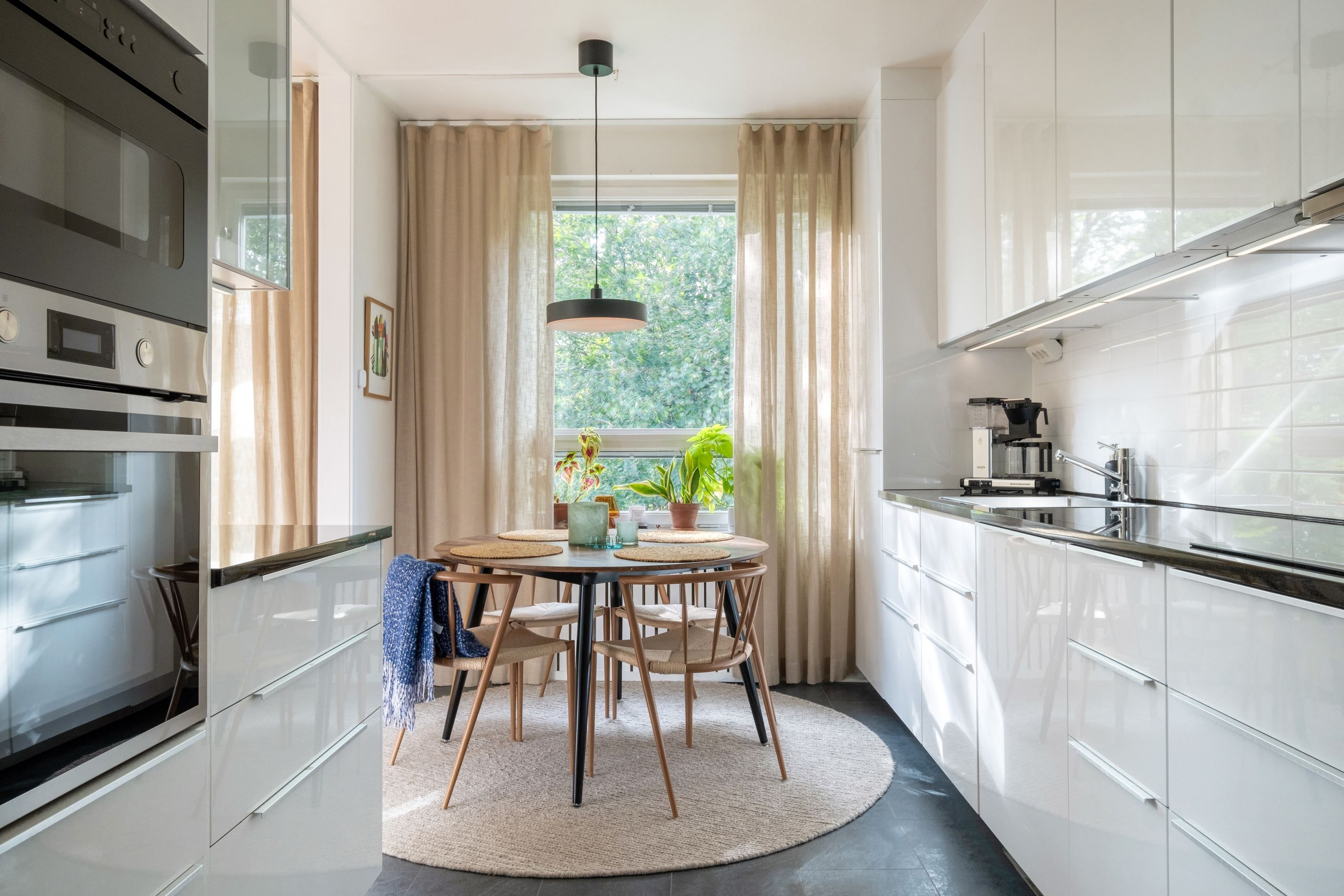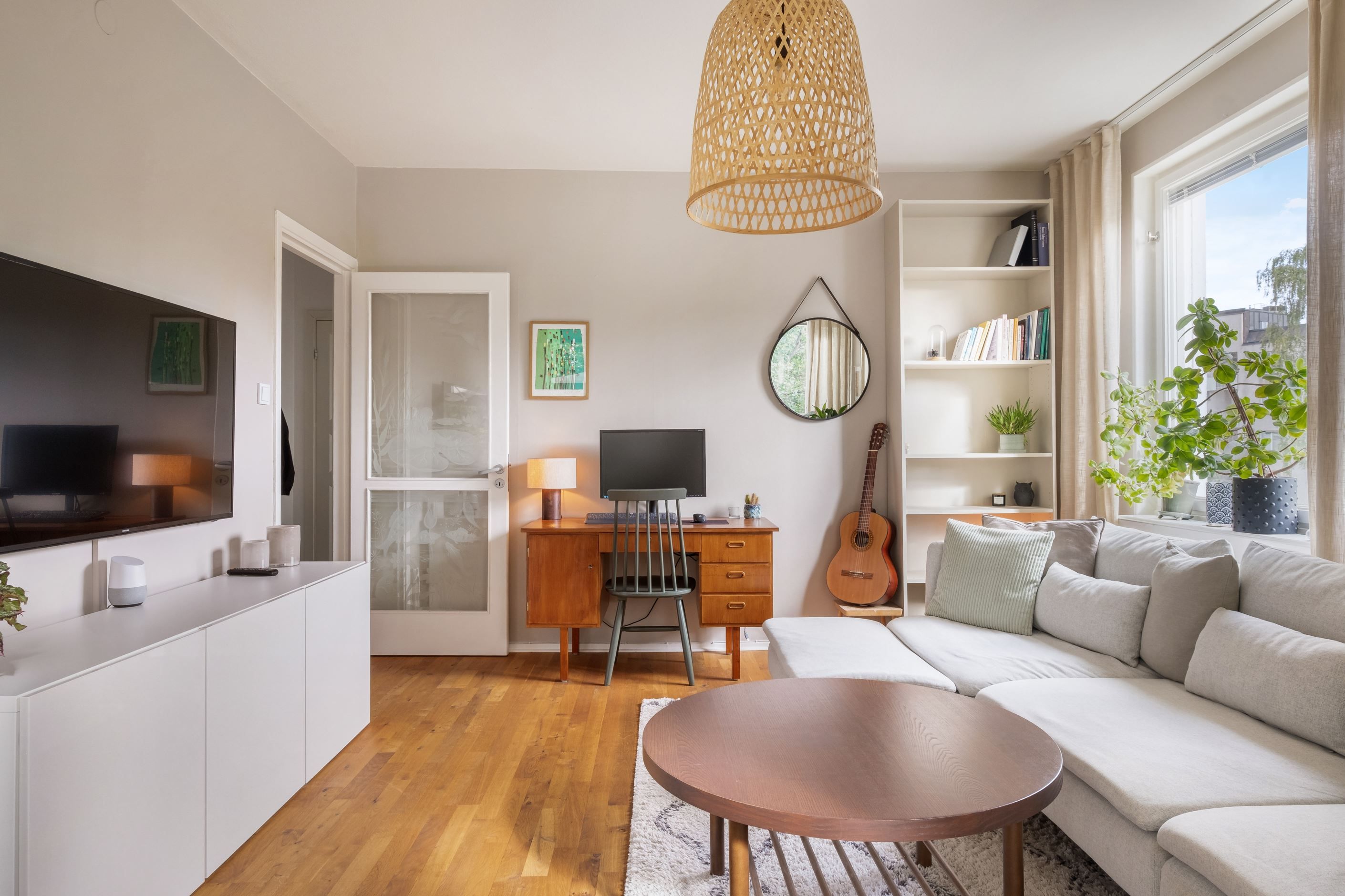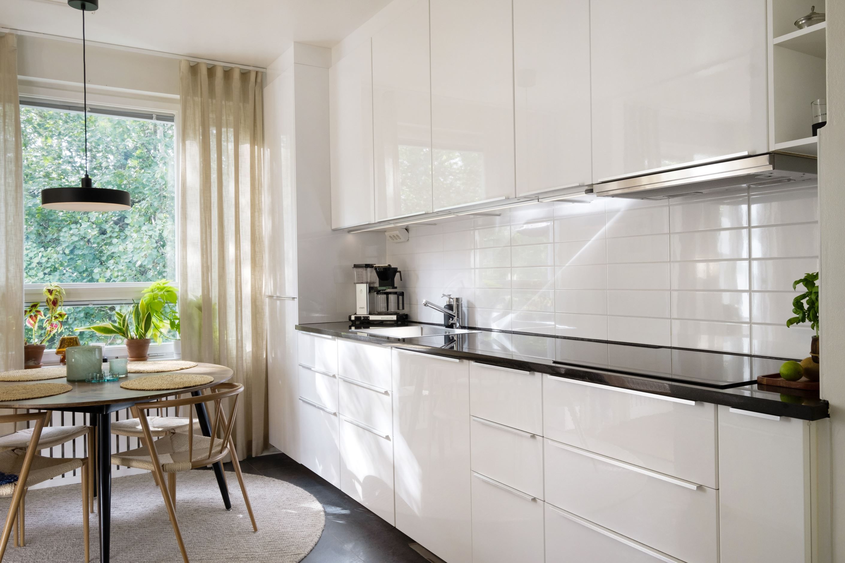 Här finner ni generösa sällskapsytor och gott om plats för större möblemang i varje rum. Det rymliga vardagsrummet förlängs av den mysiga balkongen i söderläge som bjuder på många härliga soltimmar med utsikt över lummig grönska. Vardagsrummet ligger i öppen och social planlösning med det stilrena köket som erbjuder gott om arbetsyta samt förvaringsmöjligheter. Köket är smakfullt utformat med mjuka linjer, tidlös färgsättning och en komplett maskinell utrustning. Intill det stora fönsterpartiet finns det en naturlig plats för matbord.
