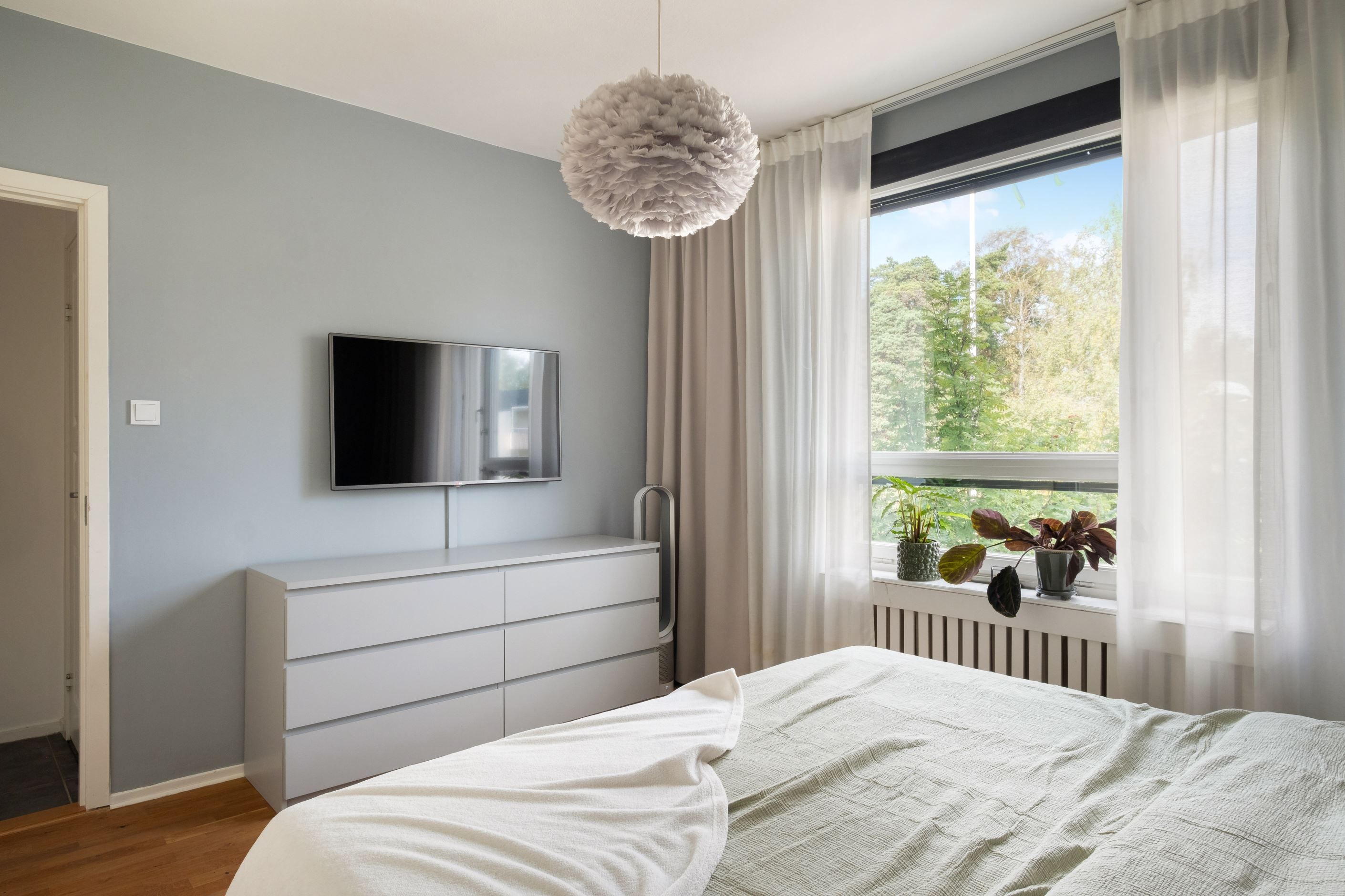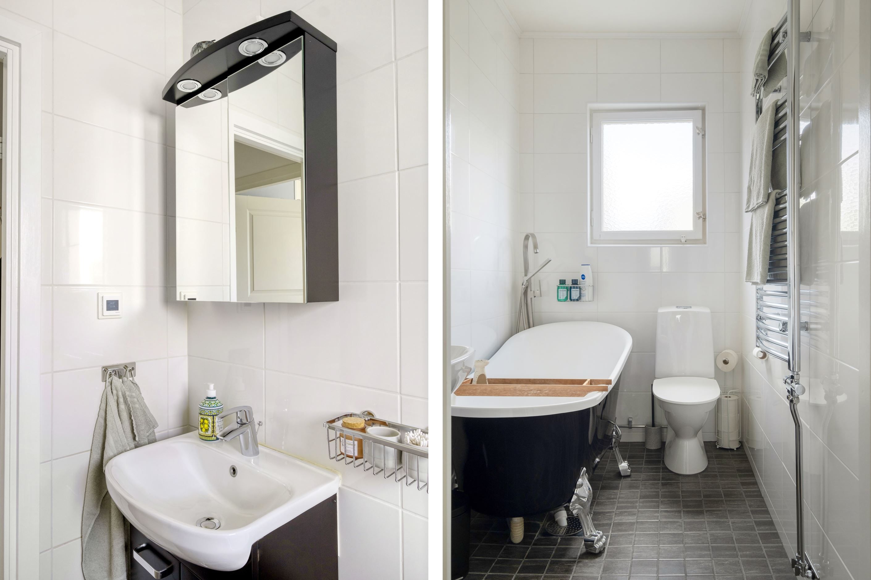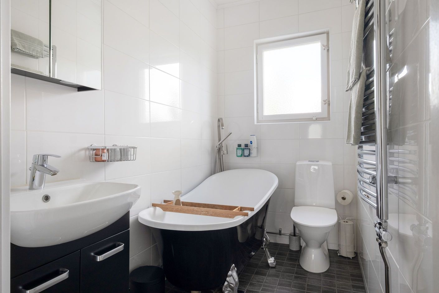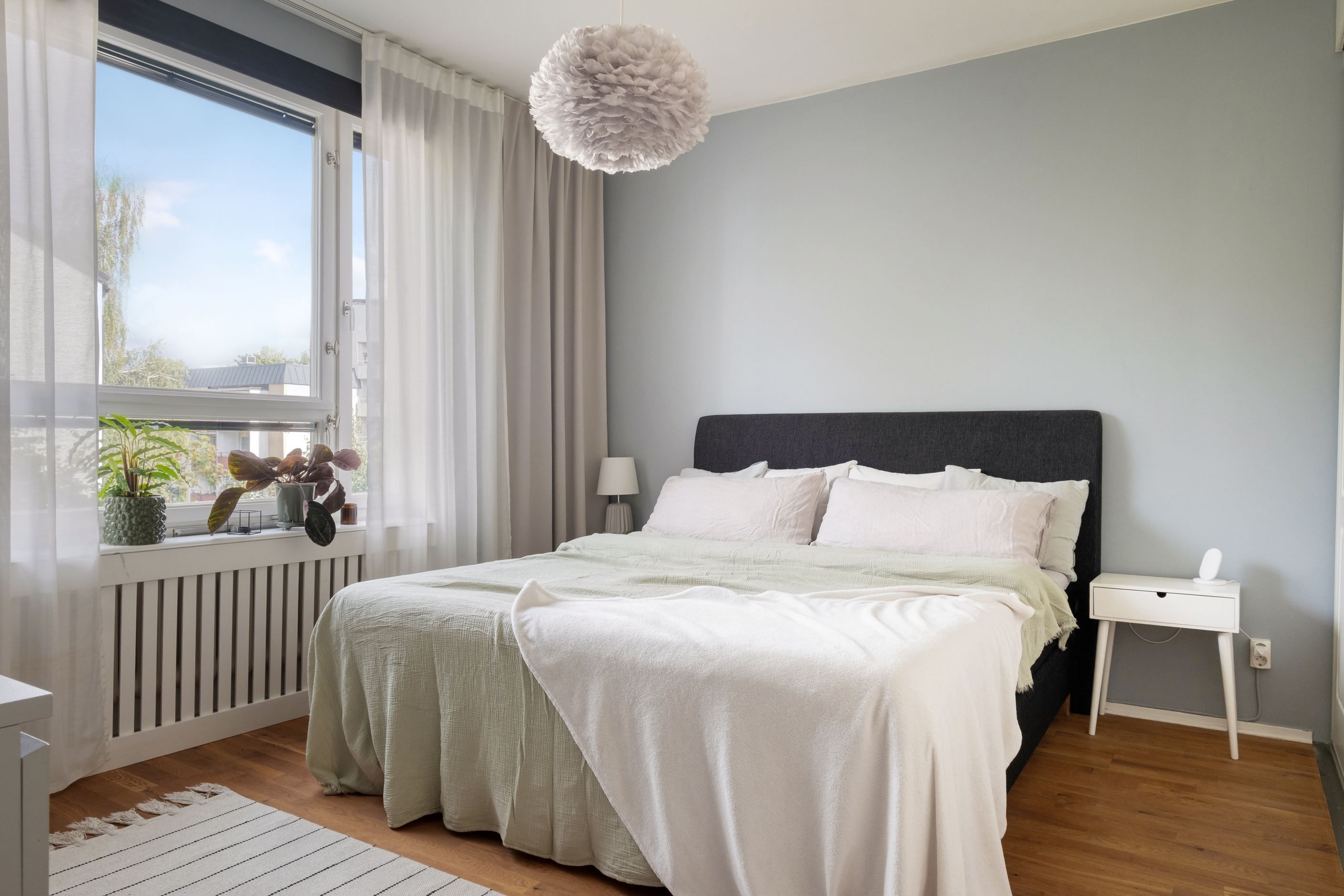 Sovrummet är generöst i storlek och erbjuder plats för både dubbelsäng, nattduksbord och byråer. Här finns också en rejäl garderobsvägg som rymmer allt som kan tänkas behövas. Det rymliga badrummet är helkaklat och utrustat med badkar. Sammantaget en perfekt utformad bostad där allt du behöver göra är att flytta in!