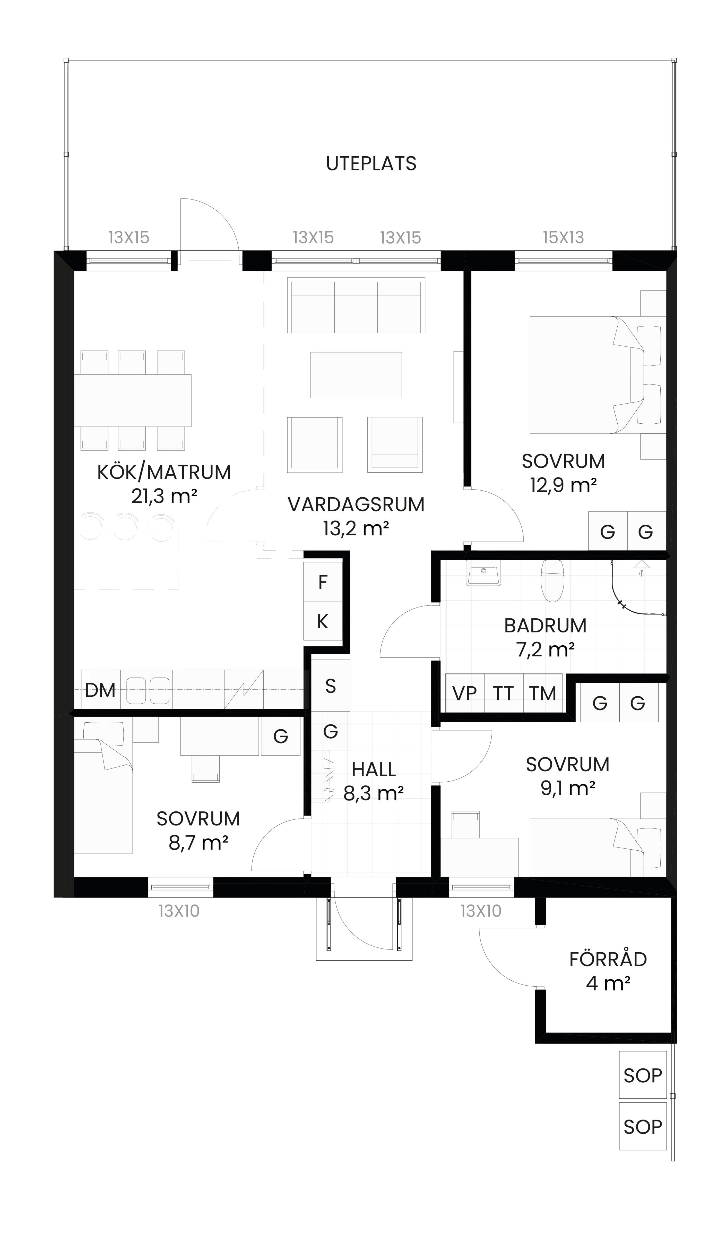 Belägen i markplan, vilket ger en lättillgänglig och praktisk boendemiljö. Varje lägenhet har egen p-plats och förråd för extra förvaring och bekvämlighet.