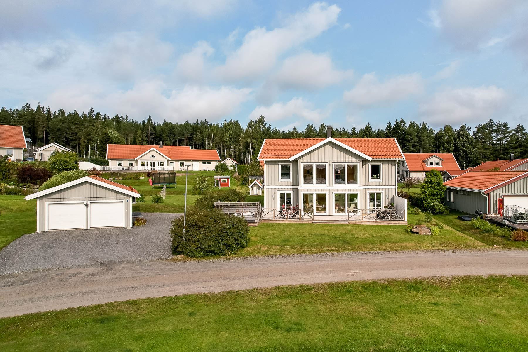 Välkomna till detta fantastiska boende invid Skravelsjötjärnen. En trevlig och välskött tvåplansvilla med bästa läge och med magnifik takhöjd om ca 7 m och stora vackra fönsterpartier som inbringar ljus till bostadens två plan. Fastigheten har en perfekt solfylld trädgårdstomt med trädgårdsland, bärbuskar och spring och lek för barnfamiljen. Här finns också ett dubbelgarage med bakomliggande förråd och en vedbod. Huset är byggt 2007 och är ett Myresjöhus Mästergården med en perfekt planlösning för den stora- eller växande familjen. Bostaden har en social och öppen planlösning på entréplan och totalt 5 sovrum. Mot sjön finns en stor trädäckad altan med sol stora delar av dagen med ett lyxigt spabad och plats för hela sällskapet. Inne i huset disponeras entréplan genom en öppen hall, vardagsrum och kök i social planlösning, tvättstuga/groventré, duschrum, sovrum och förvaringsmöjligheter. På övre plan finner ni fyra sovrum och ett badrum med möjlighet till bastu för den som önskar (används idag som förråd). Hela entréplanet har golvvärme och i huset finns två luftvärmepumpar som funkar utmärkt att få ett svalkande inomhusklimat de varmaste dagarna. I huset är ytskikten ljusa och fräscha och här kan ni bara flytta in och trivas!