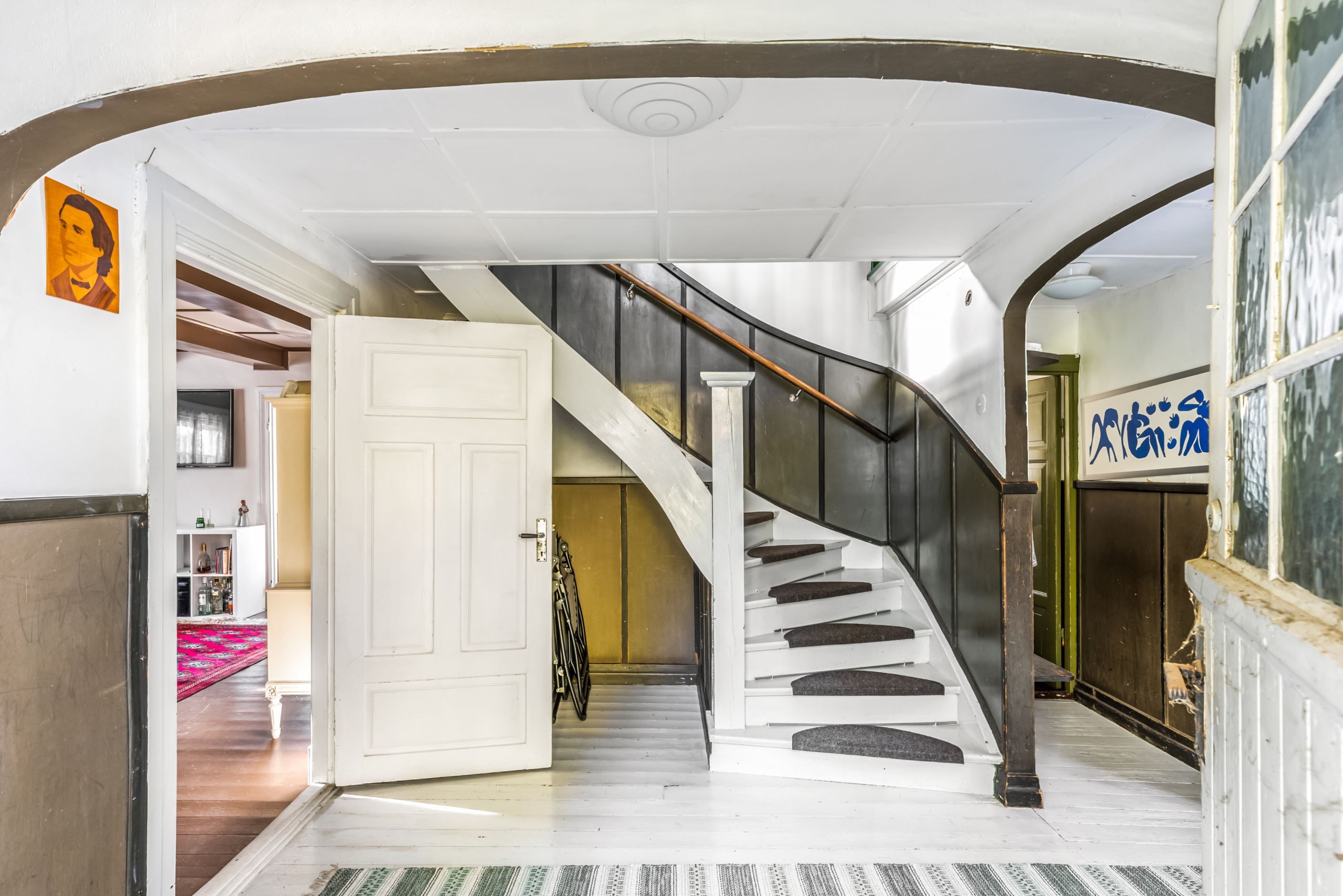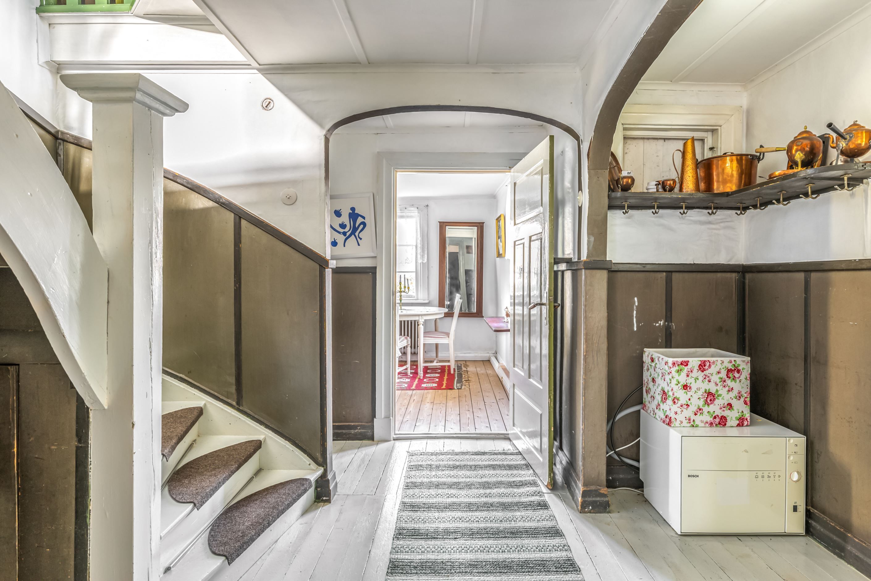 Huset är fördelat på två våningar med ingång från fram och baksida. Entreplan erbjuder hall, kök med matplats, vardagsrum, sovrum och hall mot baksidan, genomgående i huset är ett äldre robust trägolv.