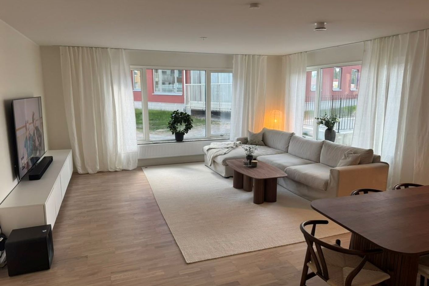 Vardagsrummet erbjuder generösa sällskapsytor med plats för både soffgrupp och matplats, utan att kompromissa med rymden. Den harmoniska färgsättningen skapar en lugn och modern bas som är enkel att trivas i.
