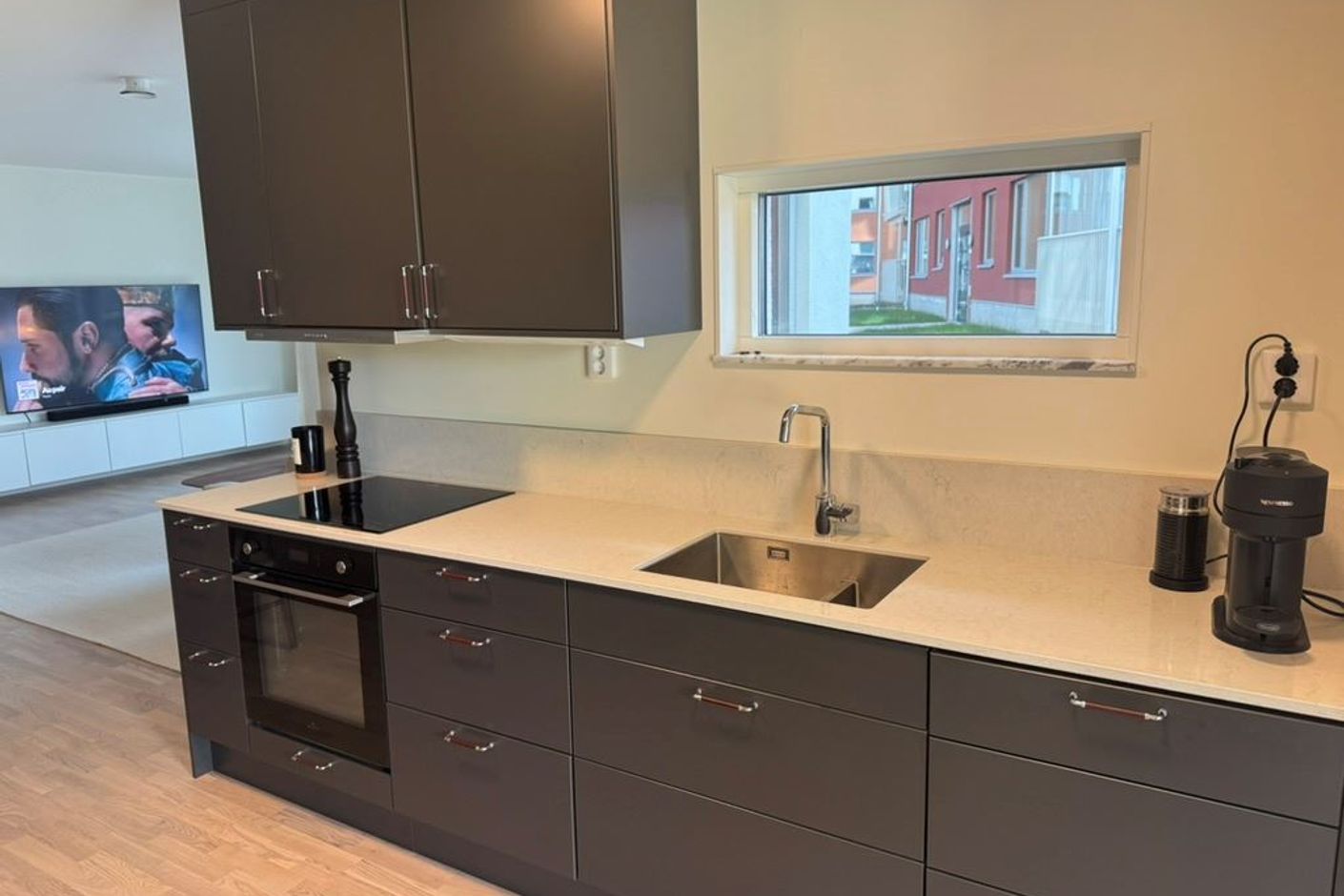 Det mörka köket ger ett elegant och exklusivt intryck, med stilrena materialval och full utrustning som gör matlagningen både enkel och inspirerande. Ljuset strömmar in från fönsterpartierna och leder dig vidare ut till den inglasade balkongen i härligt västerläge som blir en självklar favoritplats för sena middagar, kvällssol och avkoppling.