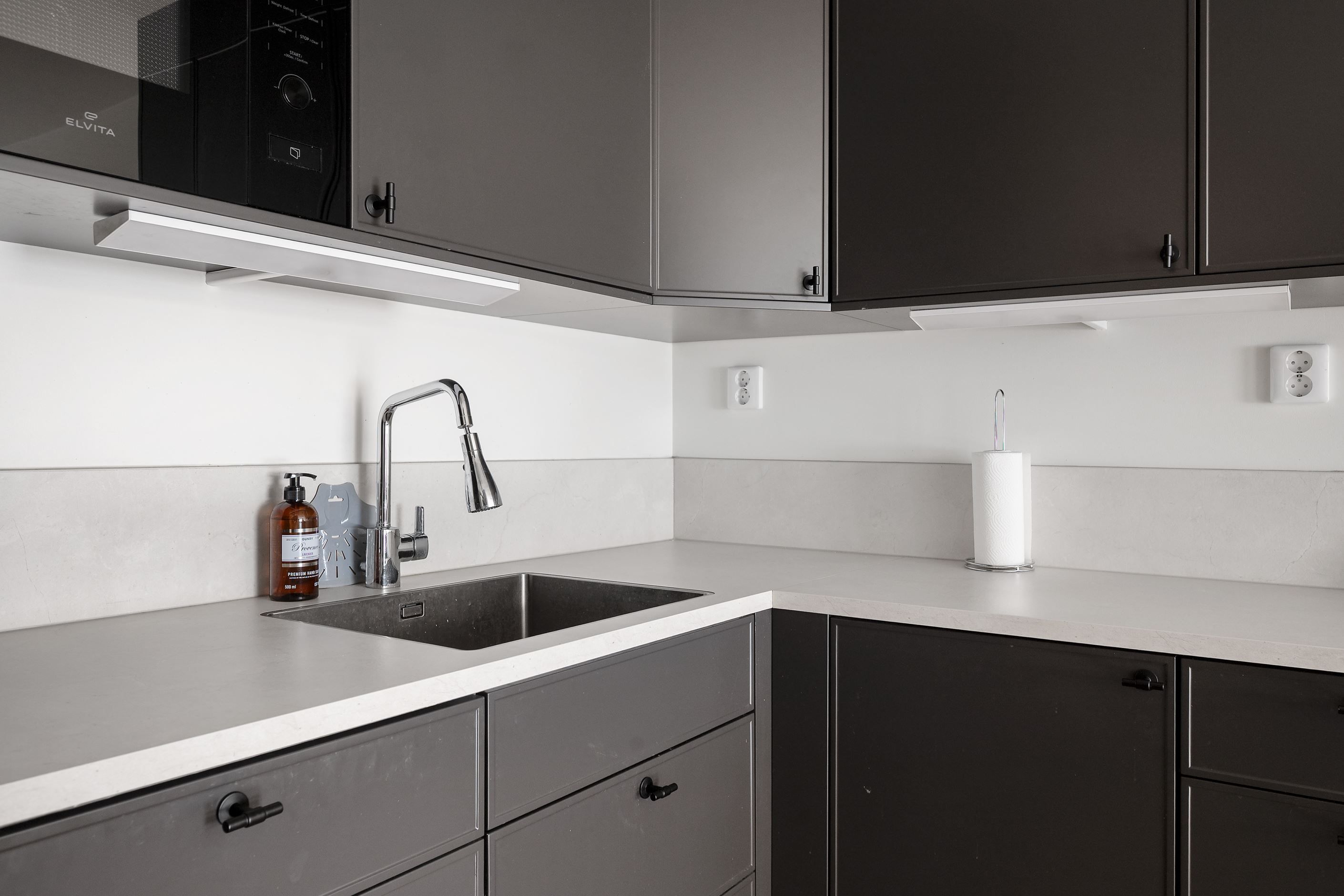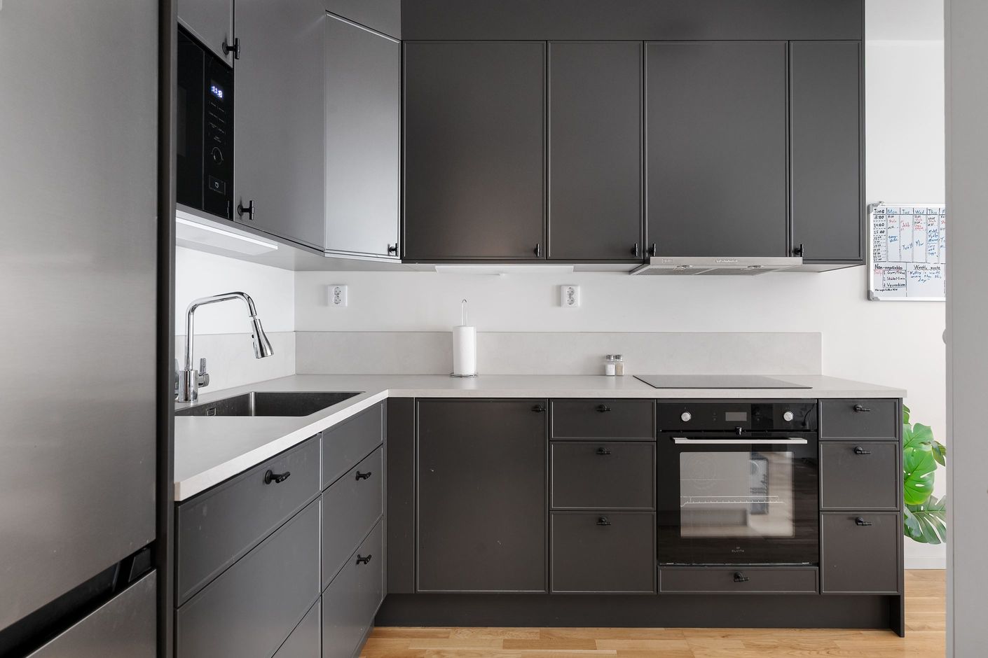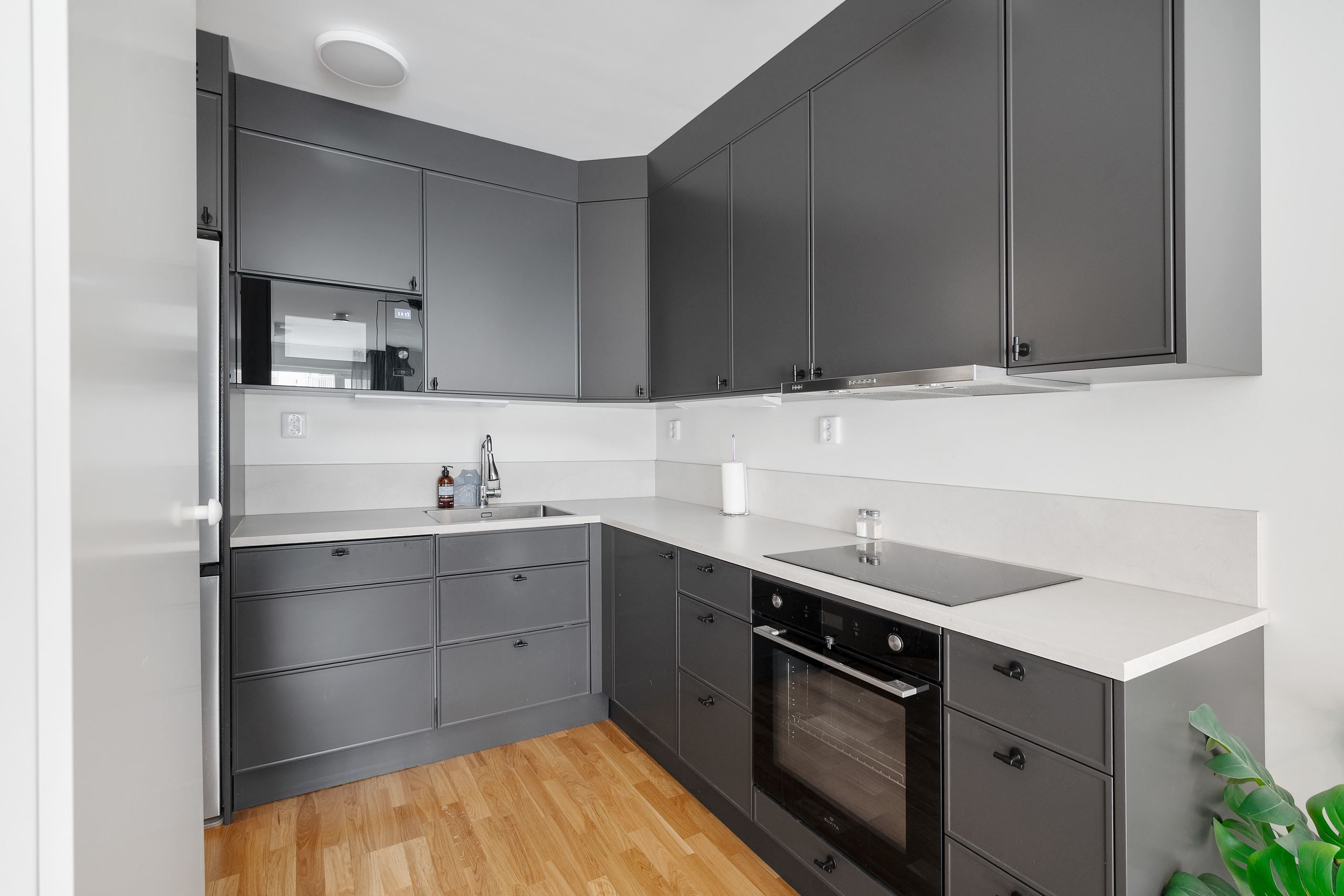Lägenheten har en smart och effektiv planlösning där de sociala ytorna får ta plats, tillsammans med ett fint ljusflöde som skapar en trivsam atmosfär. Köket är utformat i en praktisk L-form, med generösa arbetsytor och gott om förvaring – perfekt för både vardagens måltider och trevliga middagar i gott sällskap.