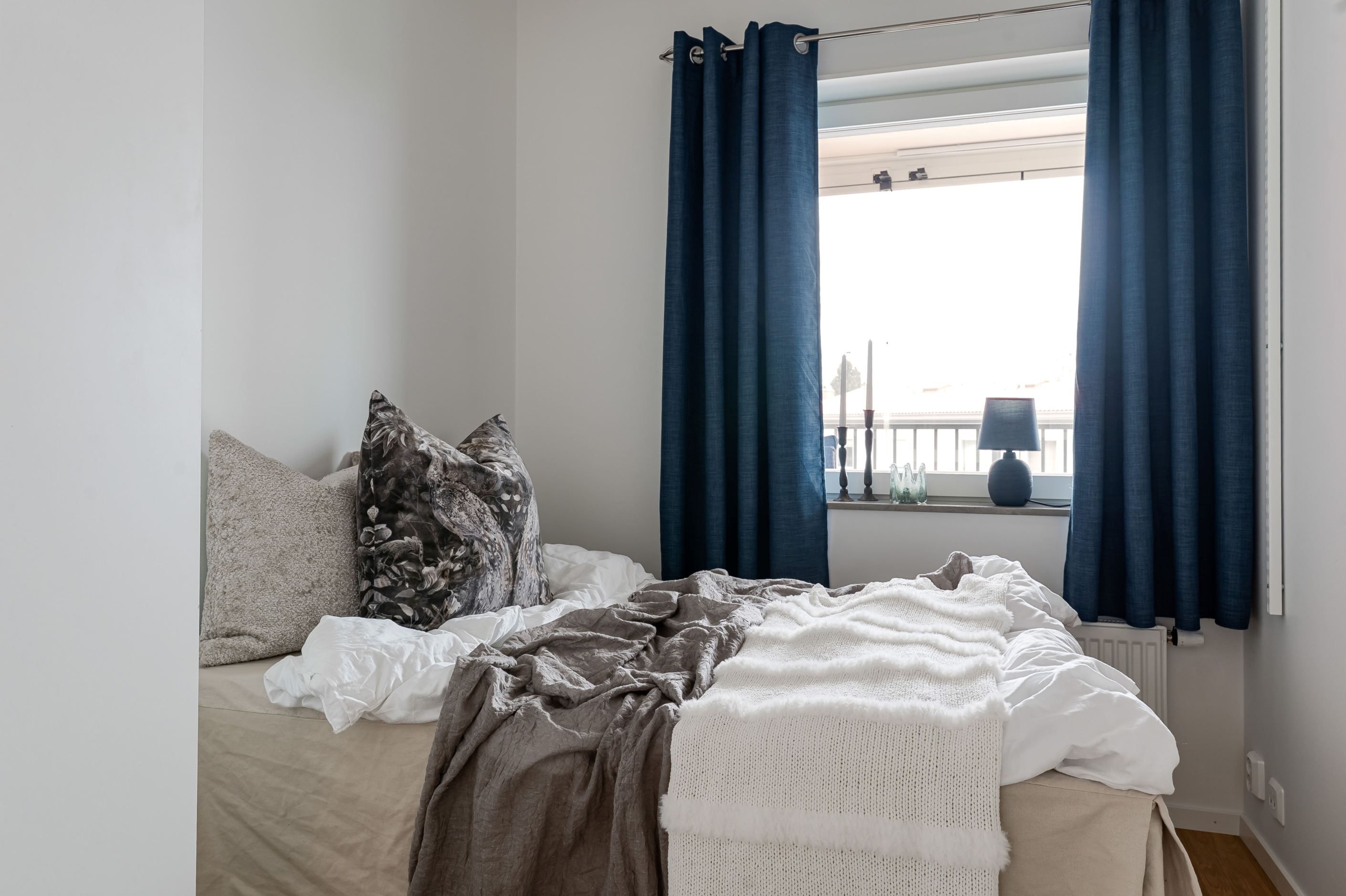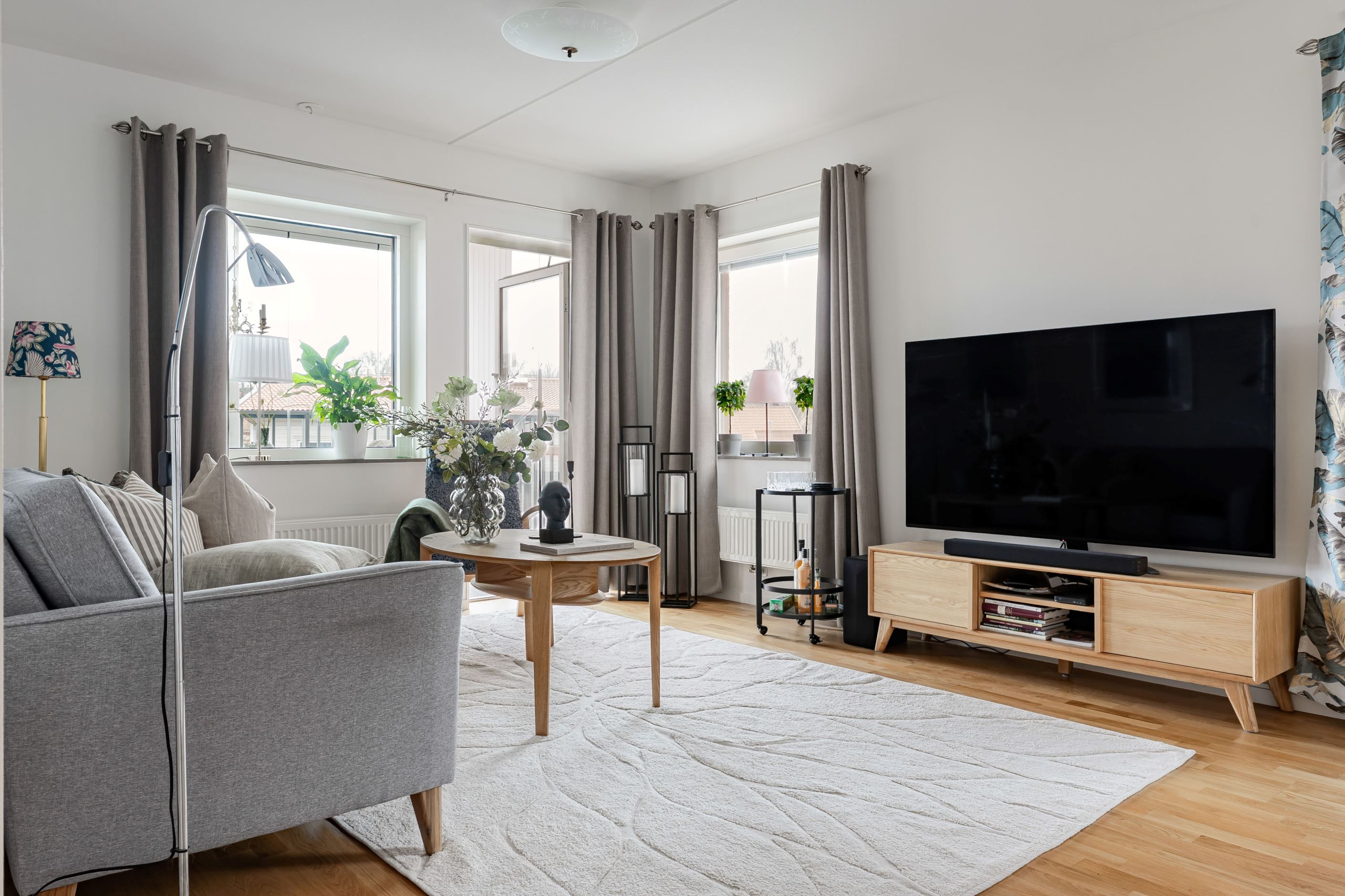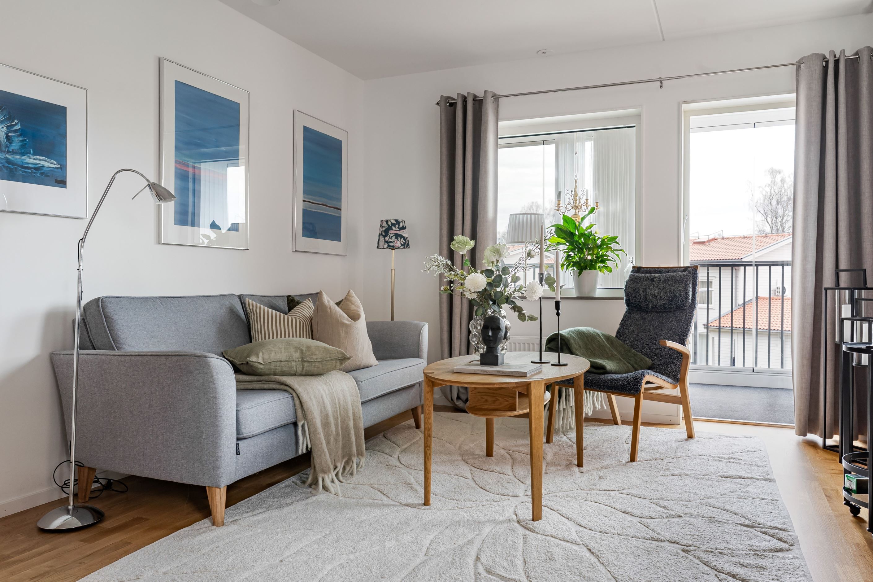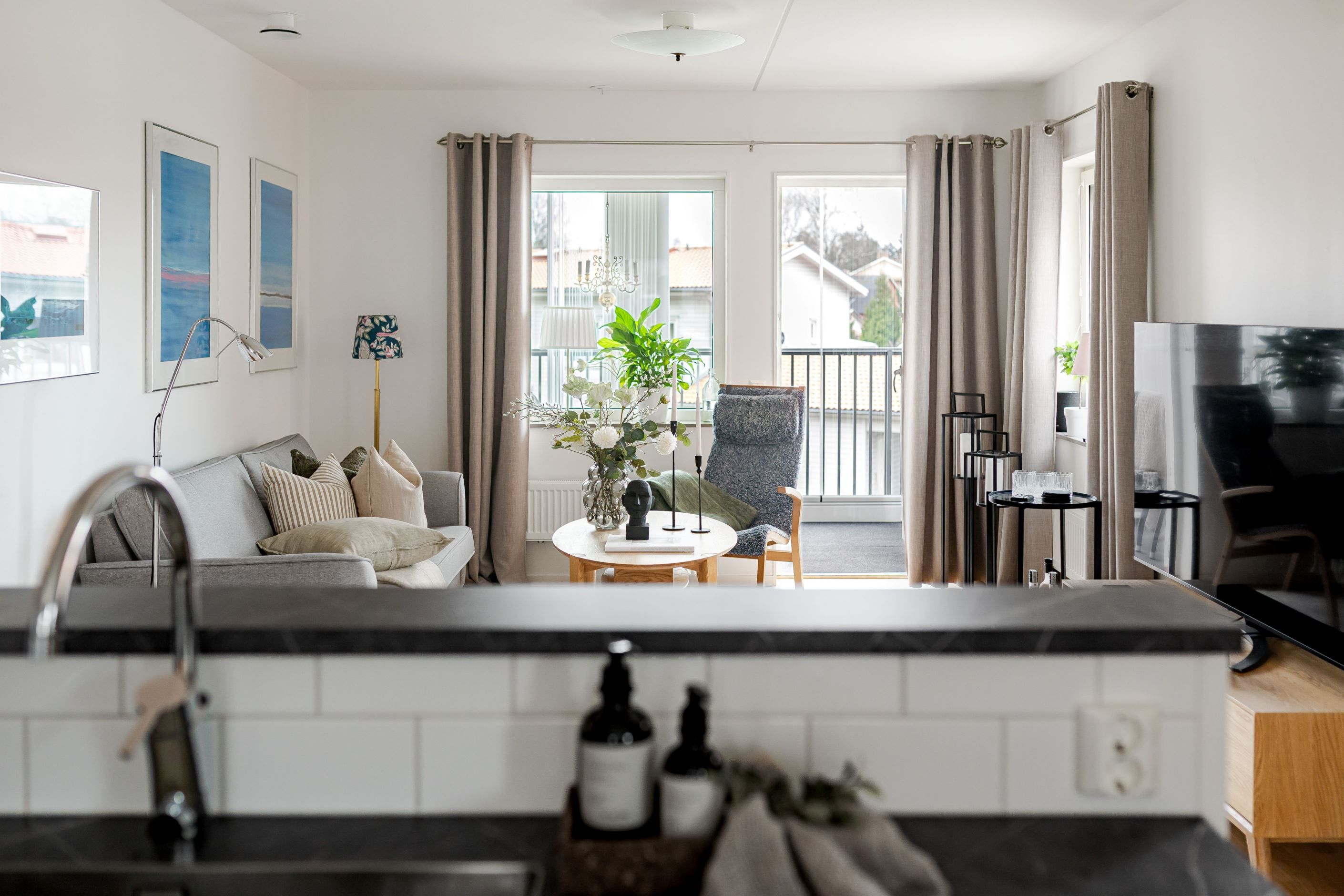 Ljus gavellägenhet med solig balkong och öppen planlösning