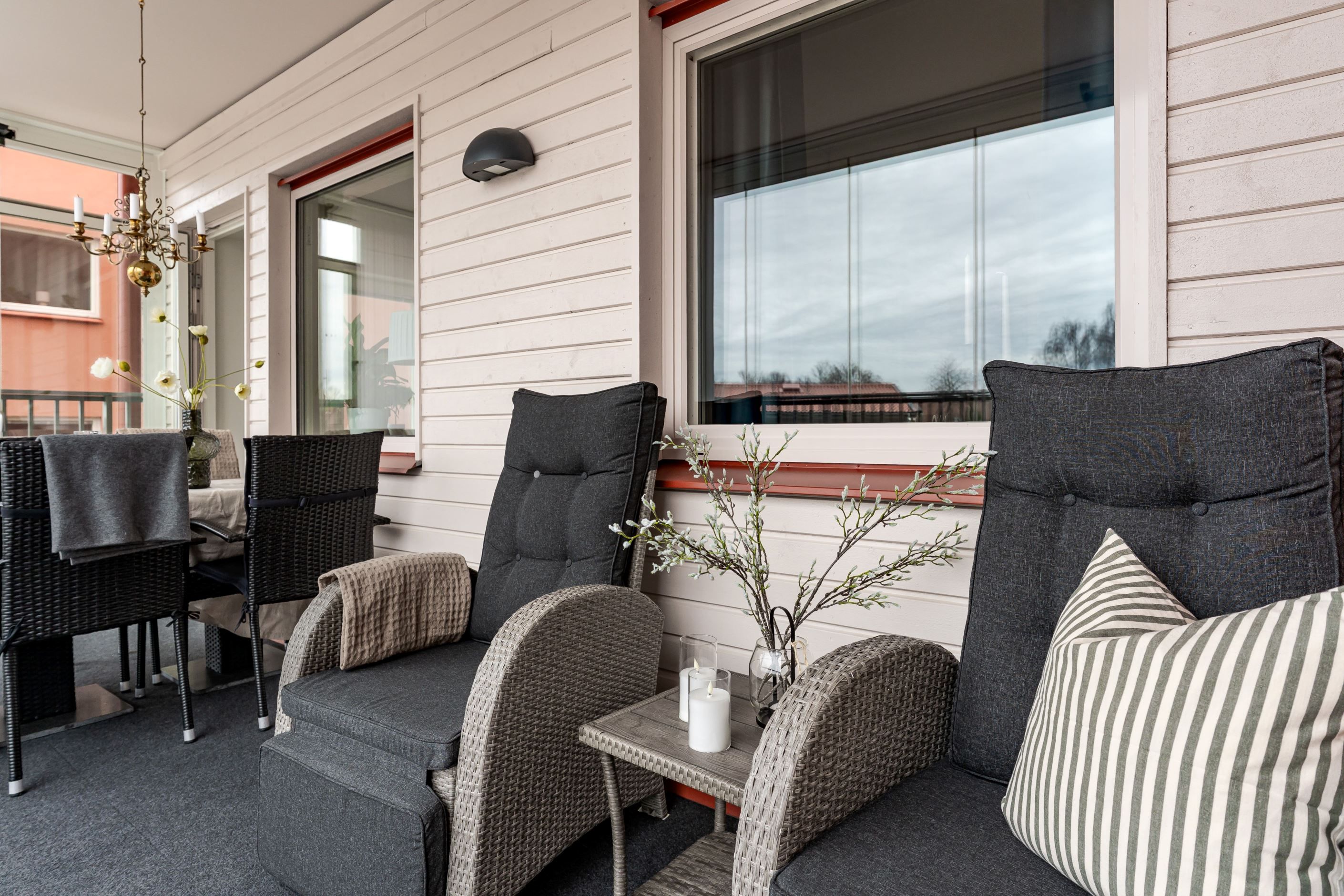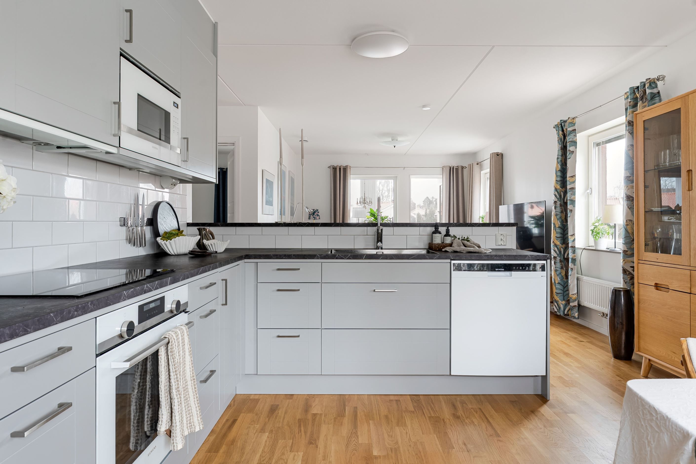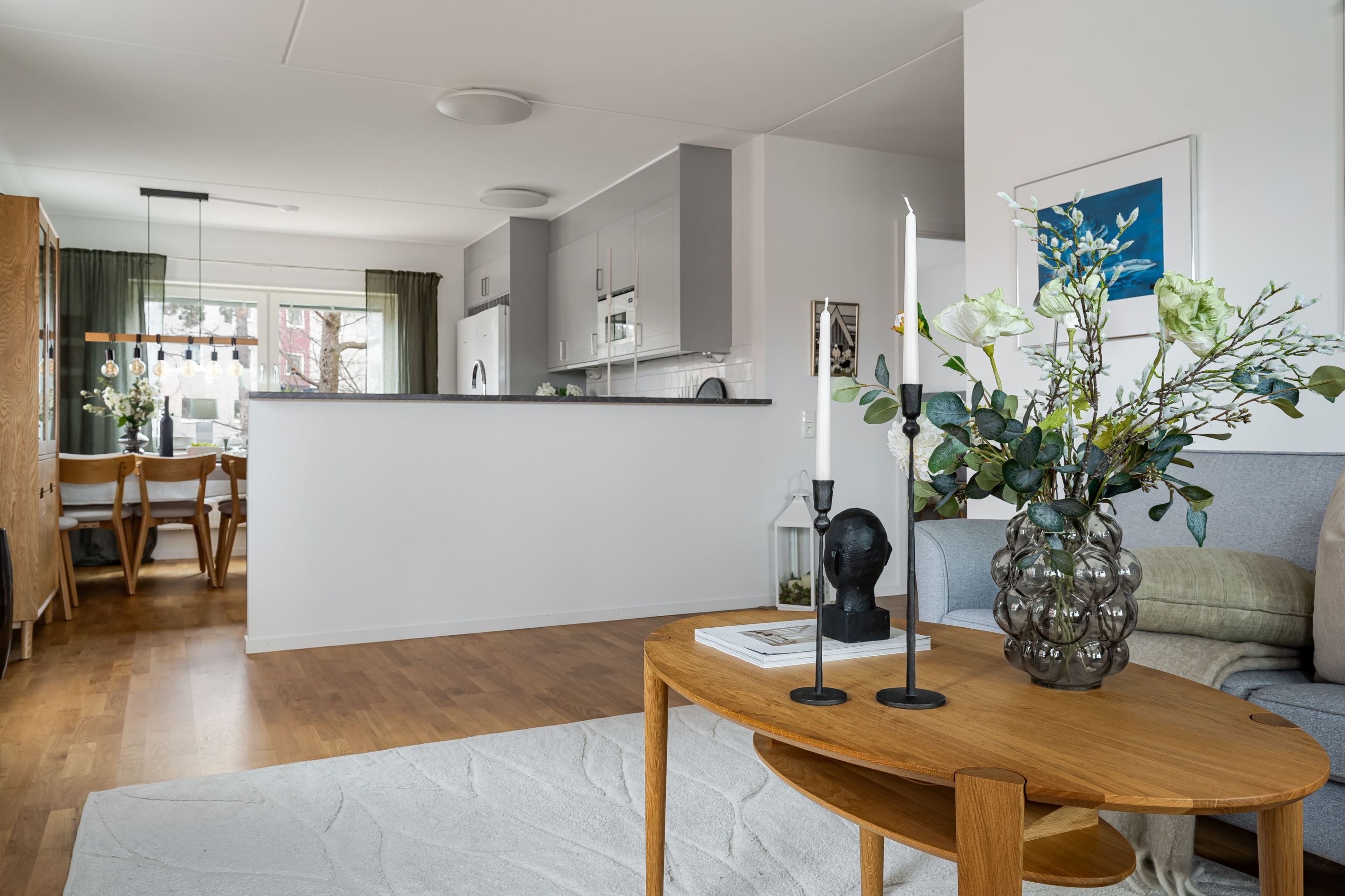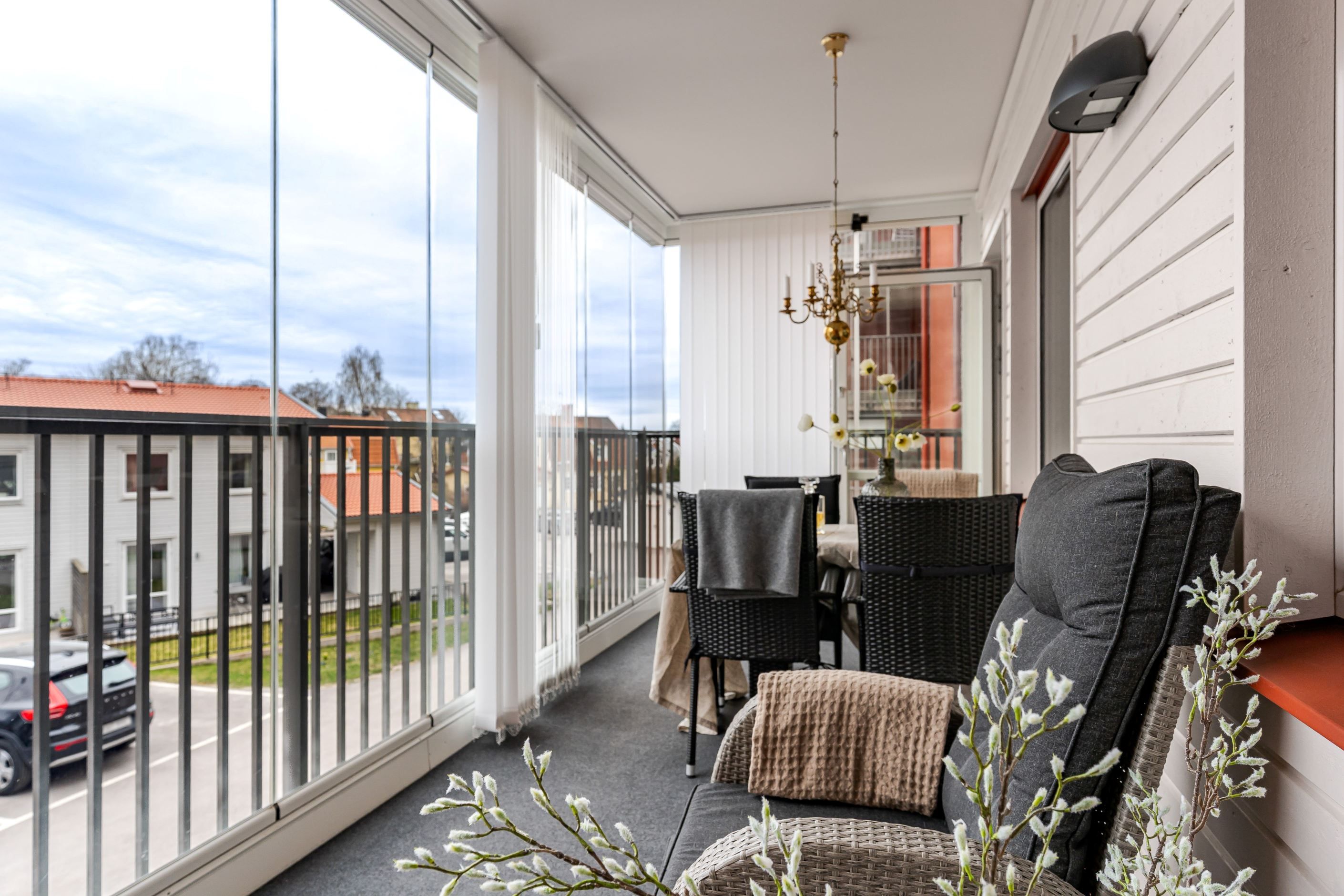 Redan i hallen möts du av en välkomnande känsla med gott om plats för både avhängning och förvaring. Bostaden präglas av en genomgående ljus och enhetlig interiör där parkettgolv och ljusa ytskikt skapar en trivsam helhet. Köket smälter fint samman med vardagsrummet i en öppen och social planlösning, där stora fönsterpartier ger ett fantastiskt ljusinsläpp och en naturlig plats för både matlagning och umgänge. Vardagsrummet bjuder in till avkoppling och sociala stunder, med direkt access till den inglasade balkongen som fungerar som en förlängning av bostaden under stora delar av året. Här kan du njuta av allt från morgonkaffet till långa, ljumma kvällar. Bostaden rymmer två rofyllda sovrum med bra förvaring och flexibla användningsmöjligheter, samt ett fräscht badrum med egna tvättmöjligheter som förenklar vardagen.