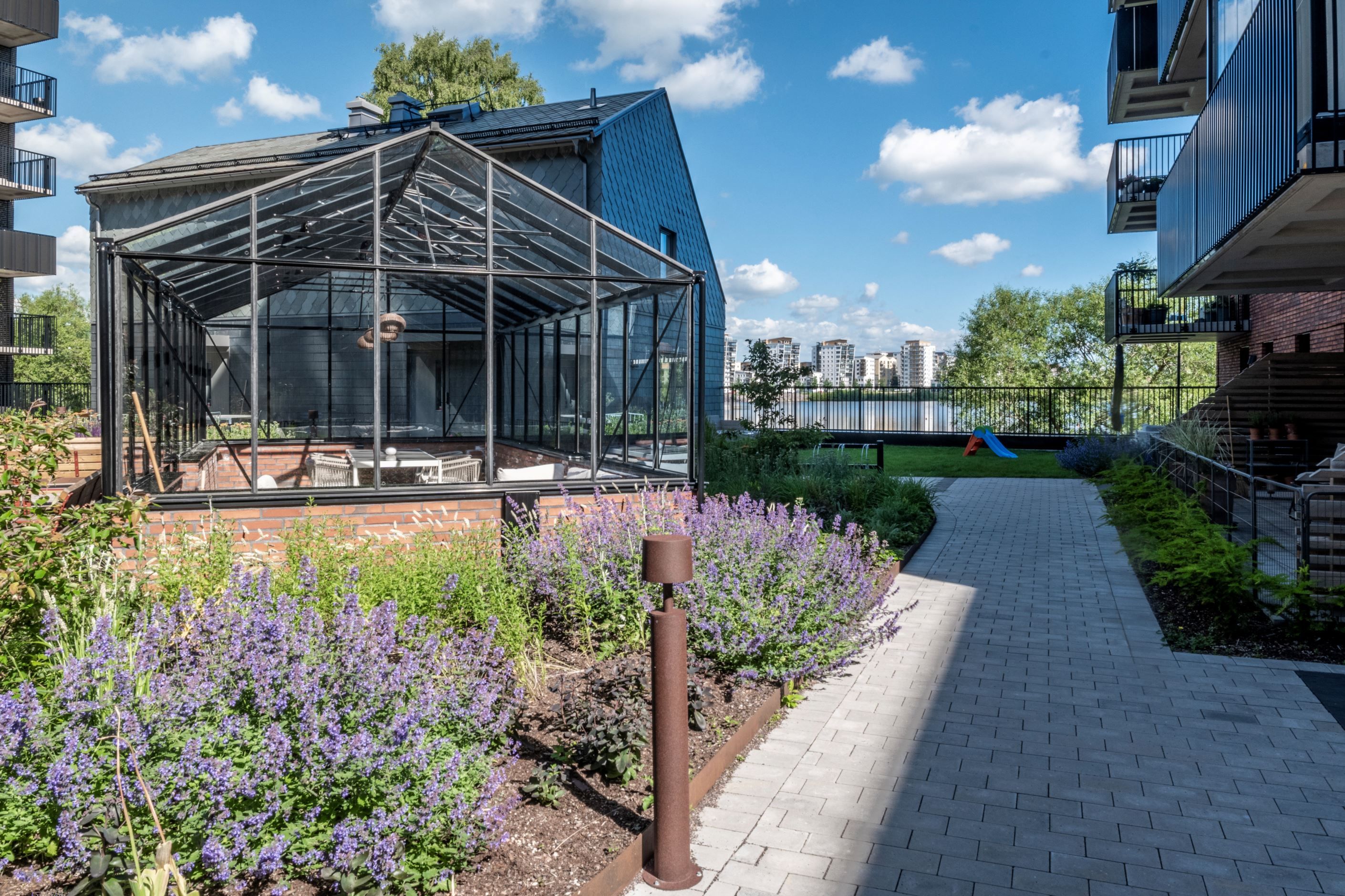 Denna lägenhet erbjuder det bästa av två världar! Markplansfördelar med enkel tillgång till den privata innergården som gör vardagen smidig och bjuder radhuskänsla i bostadsrättsform. En fantastisk sjöutsikt från våning 1 utan insyn från förbipasserande. Gäster som kommer på besök uttrycker alltid beundran av utsikten som de slås av direkt när de kliver in i lägenheten. Att kliva upp här på morgonen med soluppgångens rosaskimrande ljus över sjön är något alldeles extra. Nu står den nybyggda parken äntligen klar och området utvecklas snabbt. Dessutom bjuder denna lägenhet dubbla badrum vilket är sällsynt unikt för en trerummare.