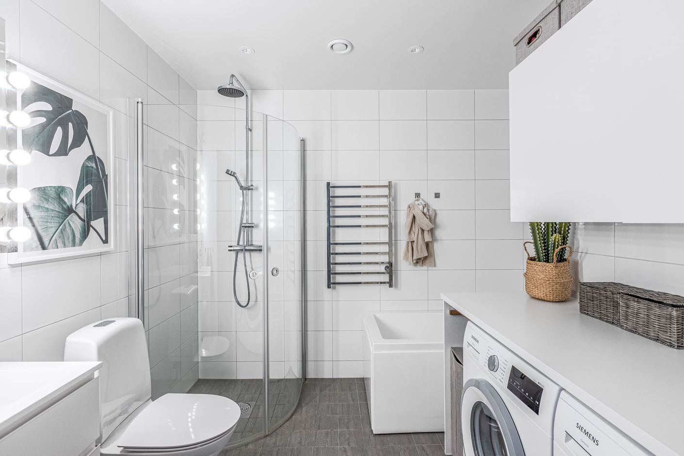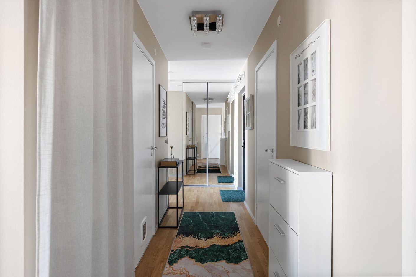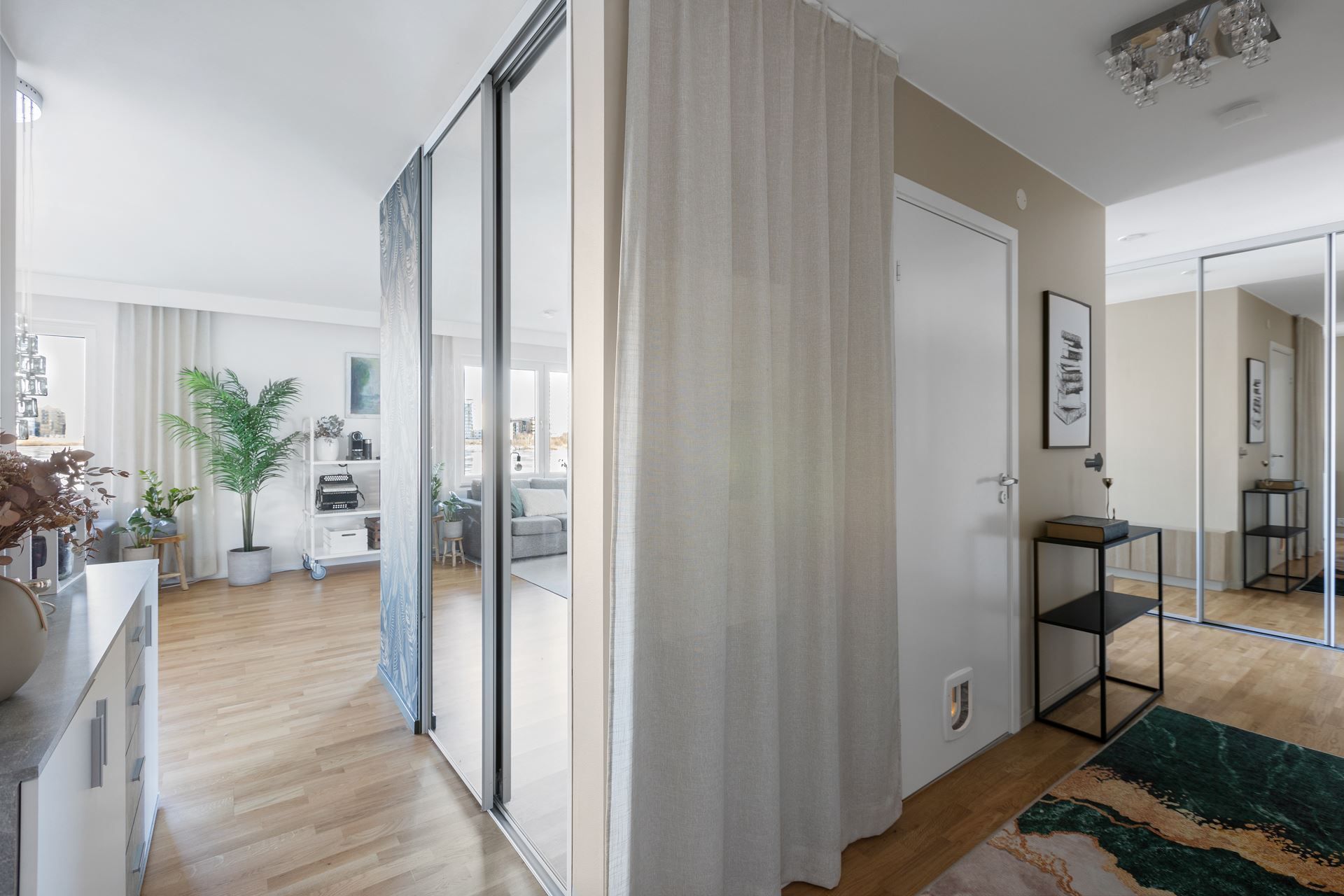 Interiört bjuds en välkomnande hall med gott om förvaringsmöjligheter i både entréhall och passagen som möjliggör ett trevligt cirkulärt rörelsemönster i lägenheten. Redan då du kliver innanför dörren möts du av vackert ljusinsläpp och vyn över Munksjön där färgerna alltid skiftar. Som en tavla att mötas av oavsett väder.