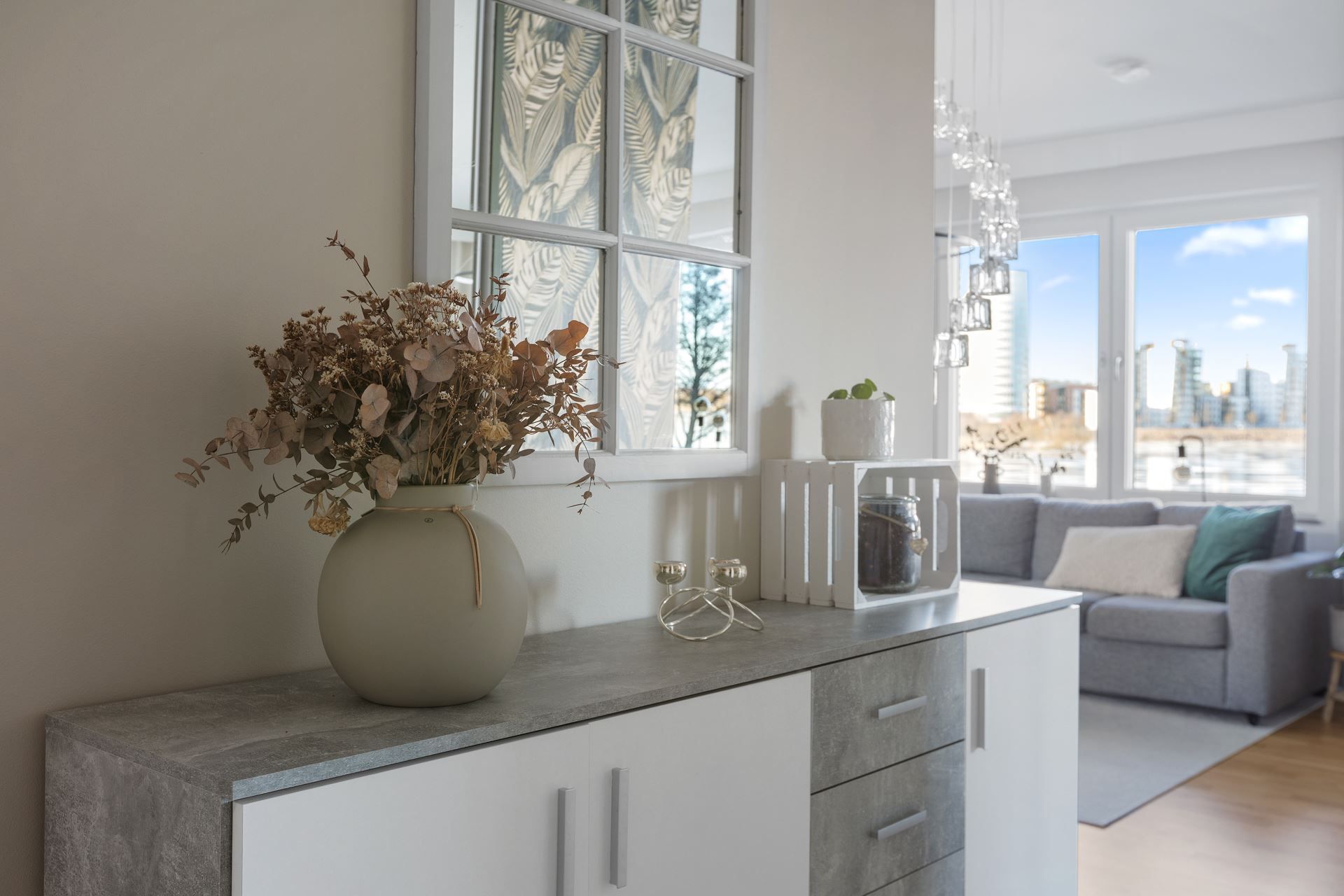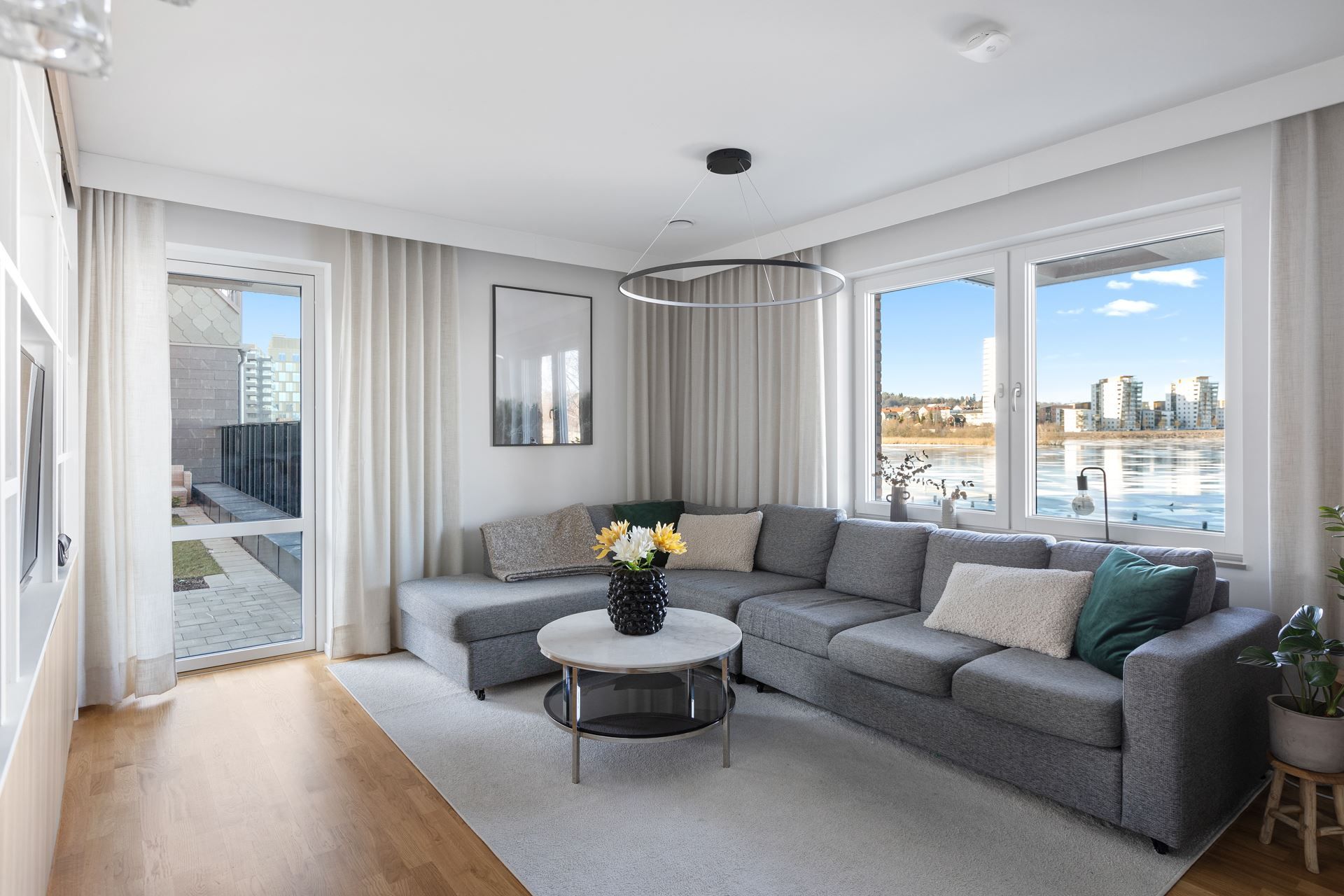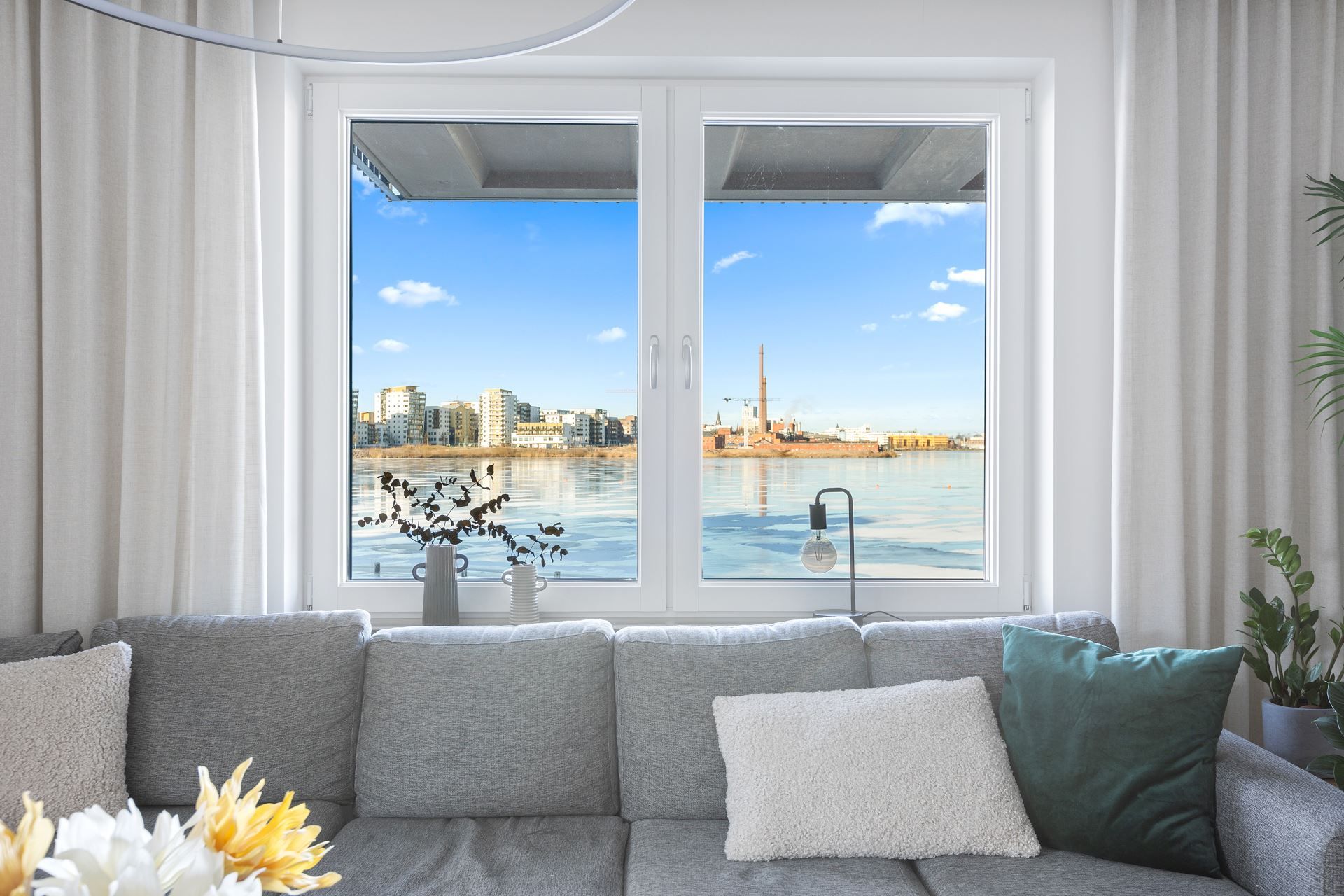 Hela bostaden är sammantaget mycket ljust och fräsch. De stora fönstren släpper in rikligt med naturligt ljus och skapar en härlig och välkomnande atmosfär. Här kan du njuta av både morgonsol och vackra solnedgångar. - En oslagbar livskvalitet!