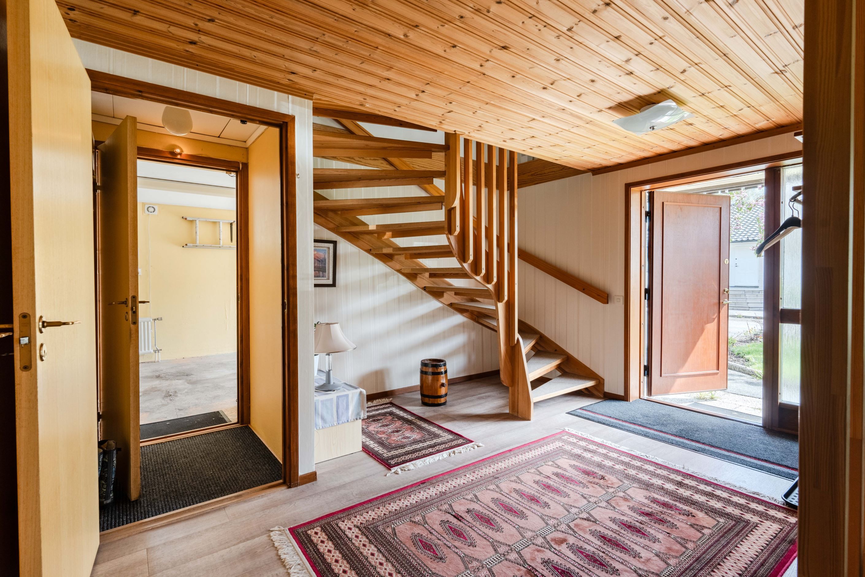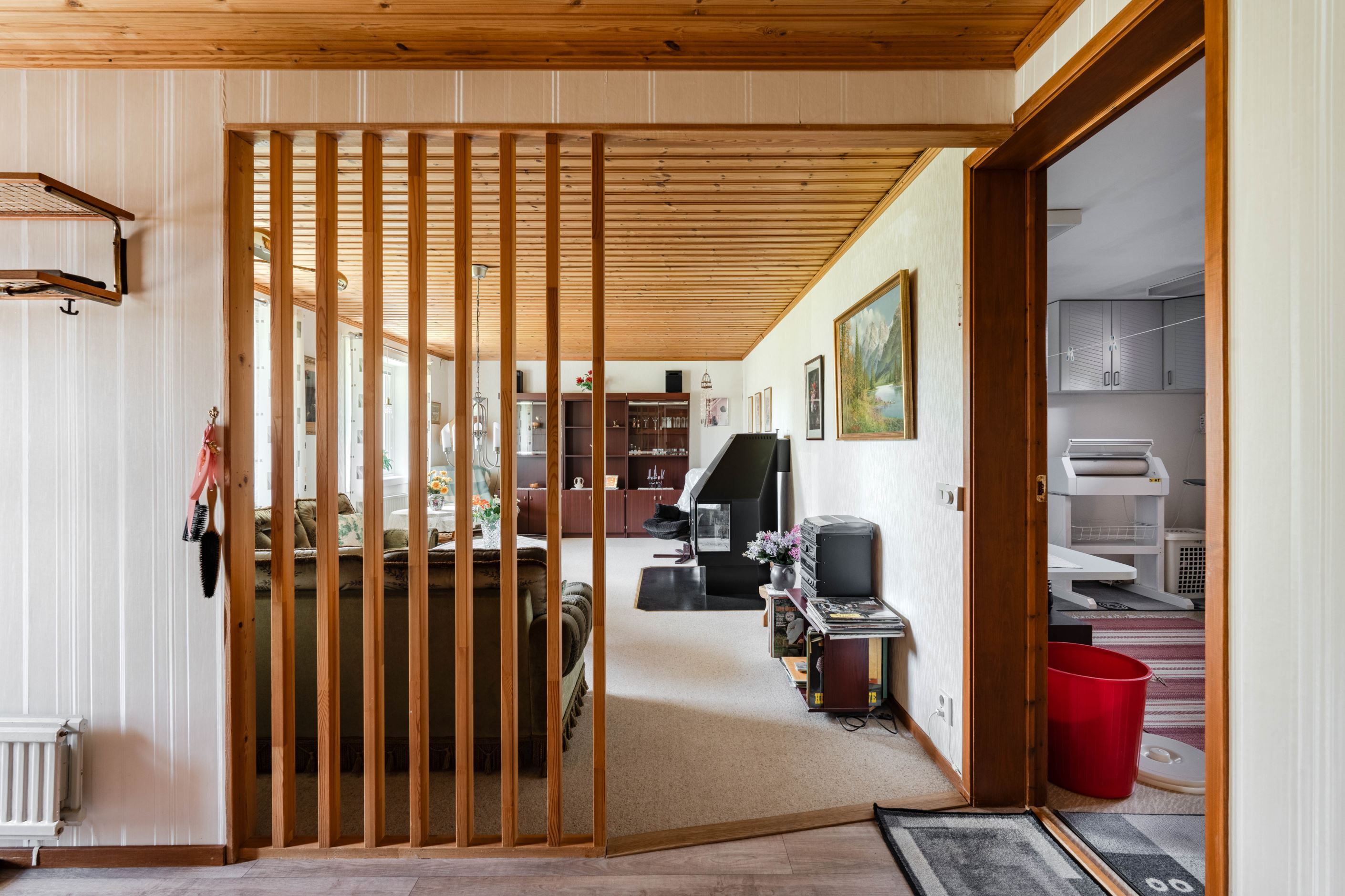 Via ytterdörren på nedre plan kliver vi in i den rymliga entrén som har gott om plats för avhänging av ytterkläder och övrig förvaring. Vardagsrummet är luftigt och har ett rikligt ljusinsläpp från två stora fönster. I rummet finns plats för önskade bekvämligheter som exempelvis en ordentlig soffgrupp, soffbord och förvaringsmöbler. Här finns även en mysig braskamin som kan sprida ljus och värme på mörka, kalla dagar och kvällar. Intill vardagsrummet ligger tvättstugan och på vardera sida av tvättstugan nås bastu och kontor. Vidare disponerar nedre plan även WC, garage med ingång till huset och förråd.