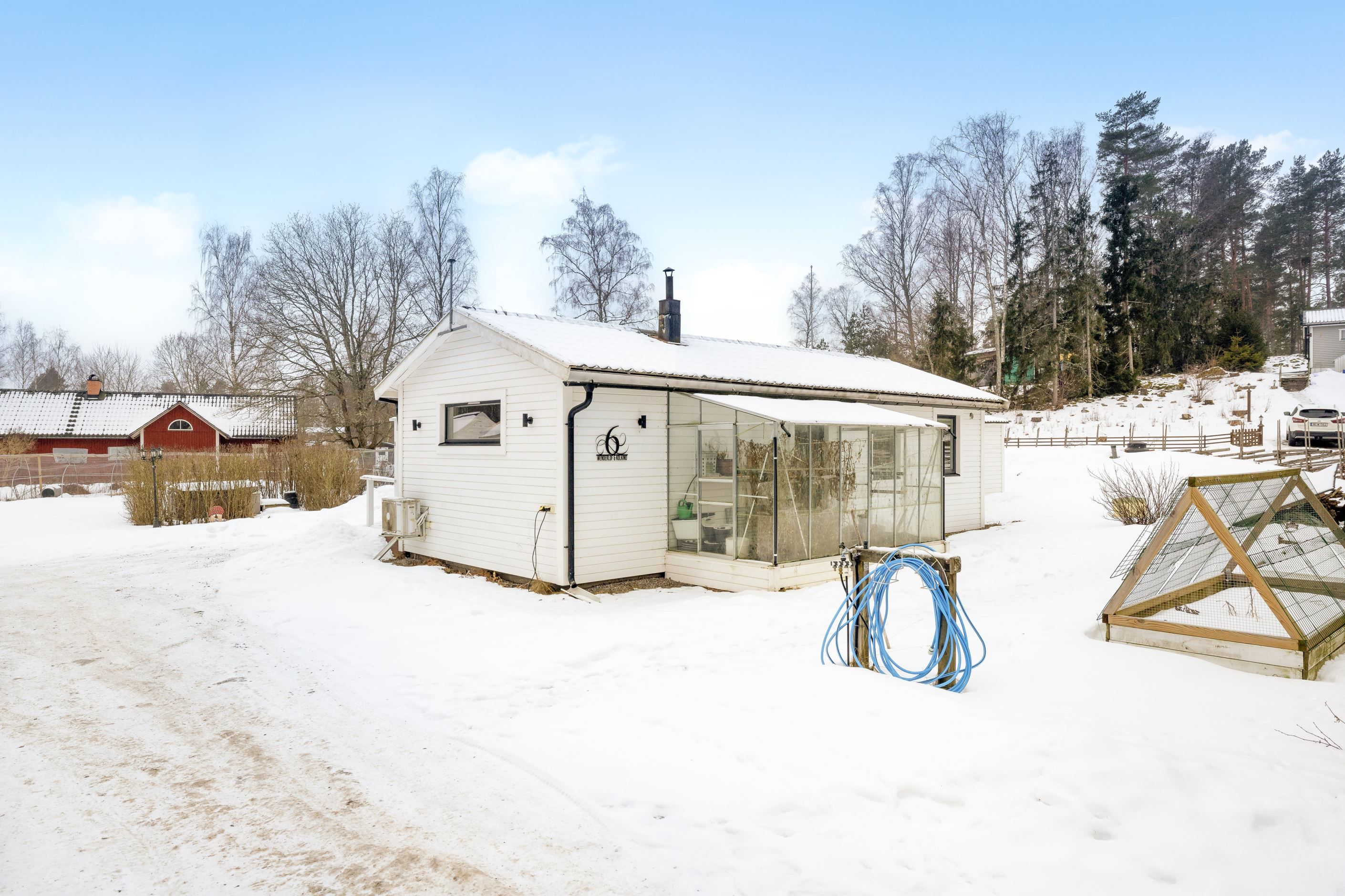 Intill huvudbyggnaden finns ytterligare ett hus med egen ingång från altanen. Här finns idag ett hemmakontor, en rymlig klädkammare samt en praktisk tvättstuga – perfekt för dig som vill kombinera arbete och privatliv på ett smidigt sätt.