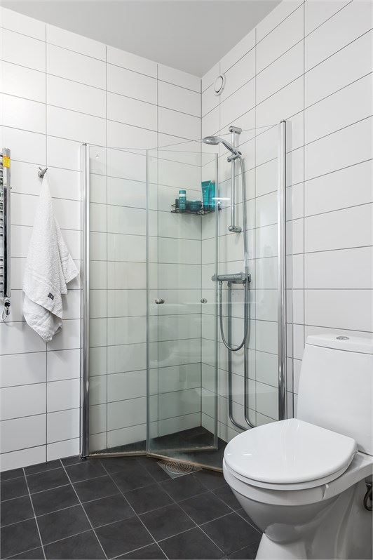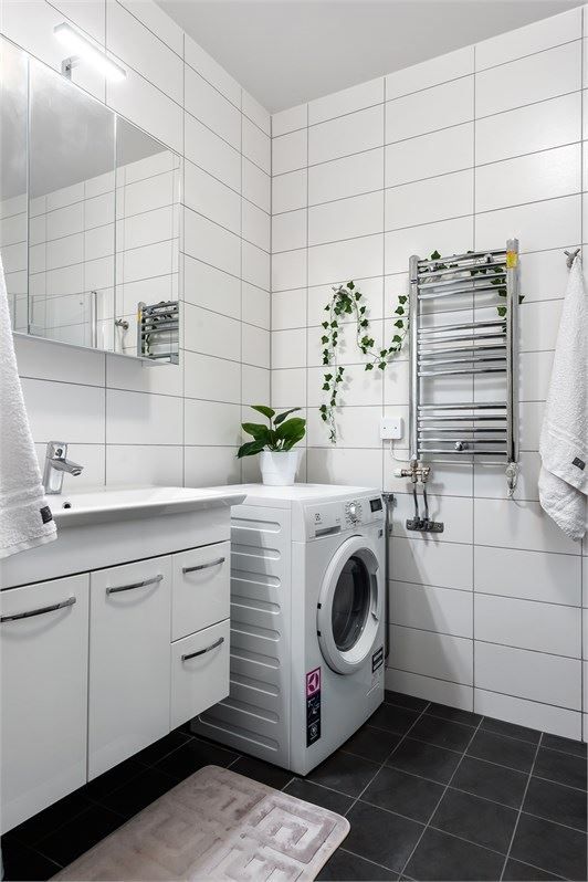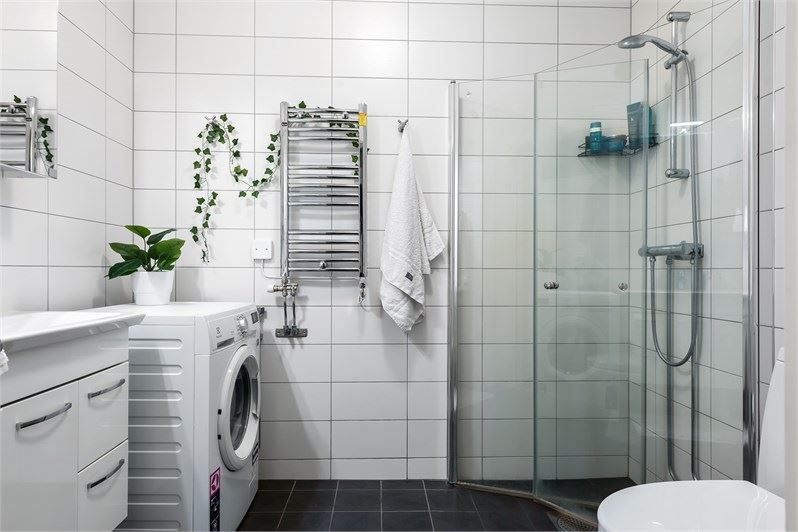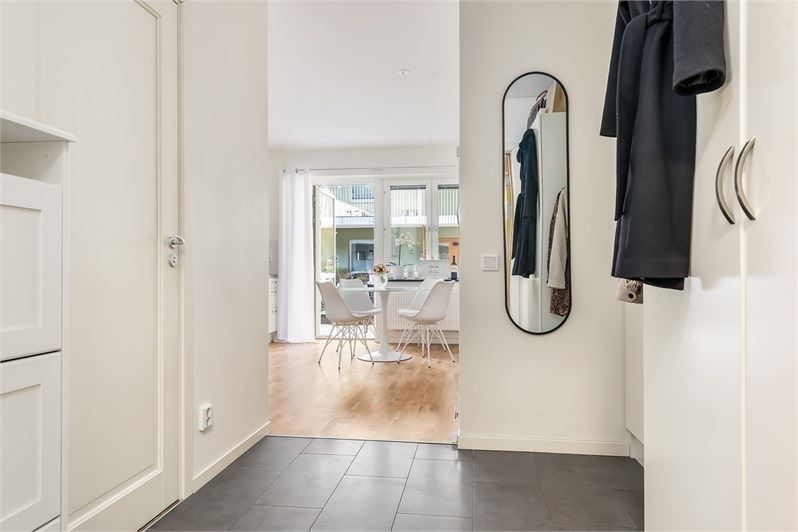 Badrummet är rymligt och smakfullt inrett med gott om förvaring, dusch samt egen tvättmaskin – allt för en bekväm vardag. I hallen finns slitstarkt klinkergolv och praktiska garderober som ger bra förvaringsmöjligheter.