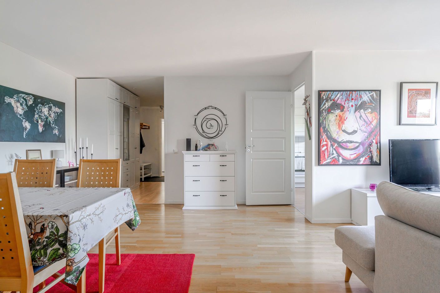 Högt upp i huset, med vidsträckta vyer över glittrande Åkers kanal, väntar ett hem utöver det vanliga. Två balkonger i olika väderstreck låter dig följa solen från morgon till kväll – perfekt för såväl frukost i gryningen som middag i solnedgången.