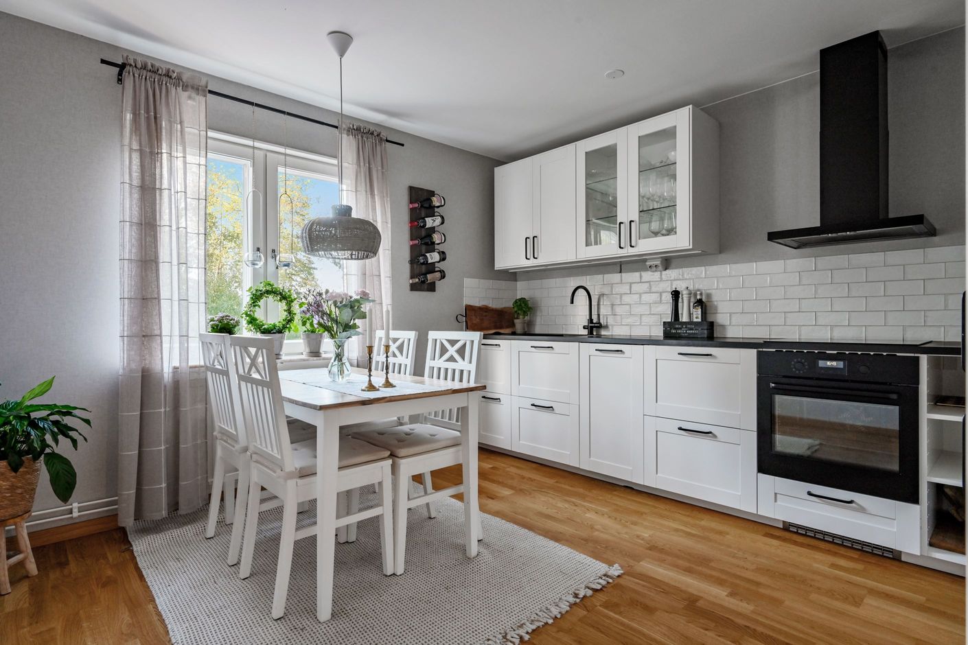 Det generösa vardagsrummet rymmer enkelt både en stor soffgrupp och övrig möblering. Tack vare gavelfönstret flödar ljuset in och skapar en härlig rymd. I anslutning till vardagsrummet ligger köket, med gott om skåp, skafferi, spishäll, fläkt, varmluftsugn samt kyl och frys. Här finns dessutom plats för ett stort matbord.