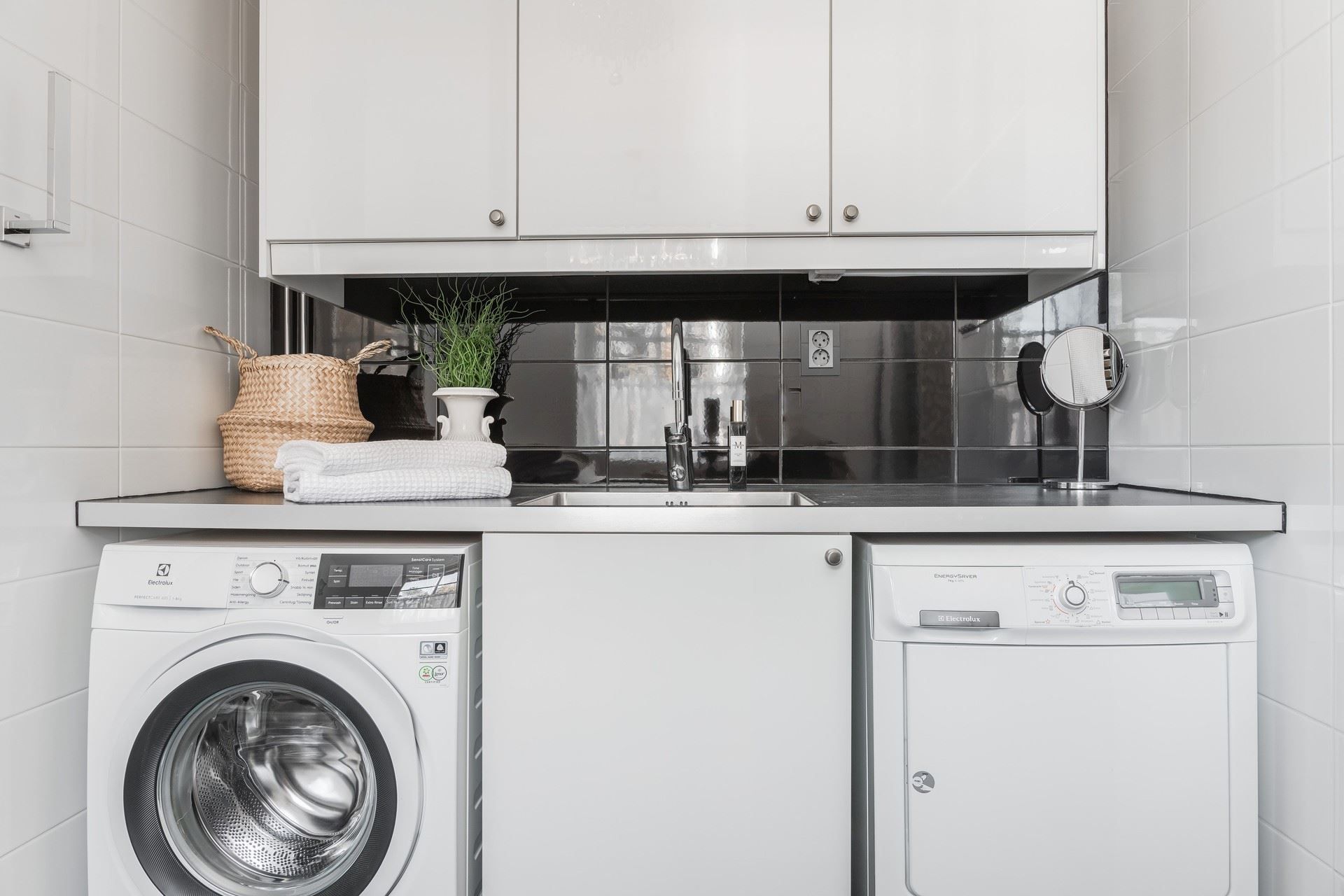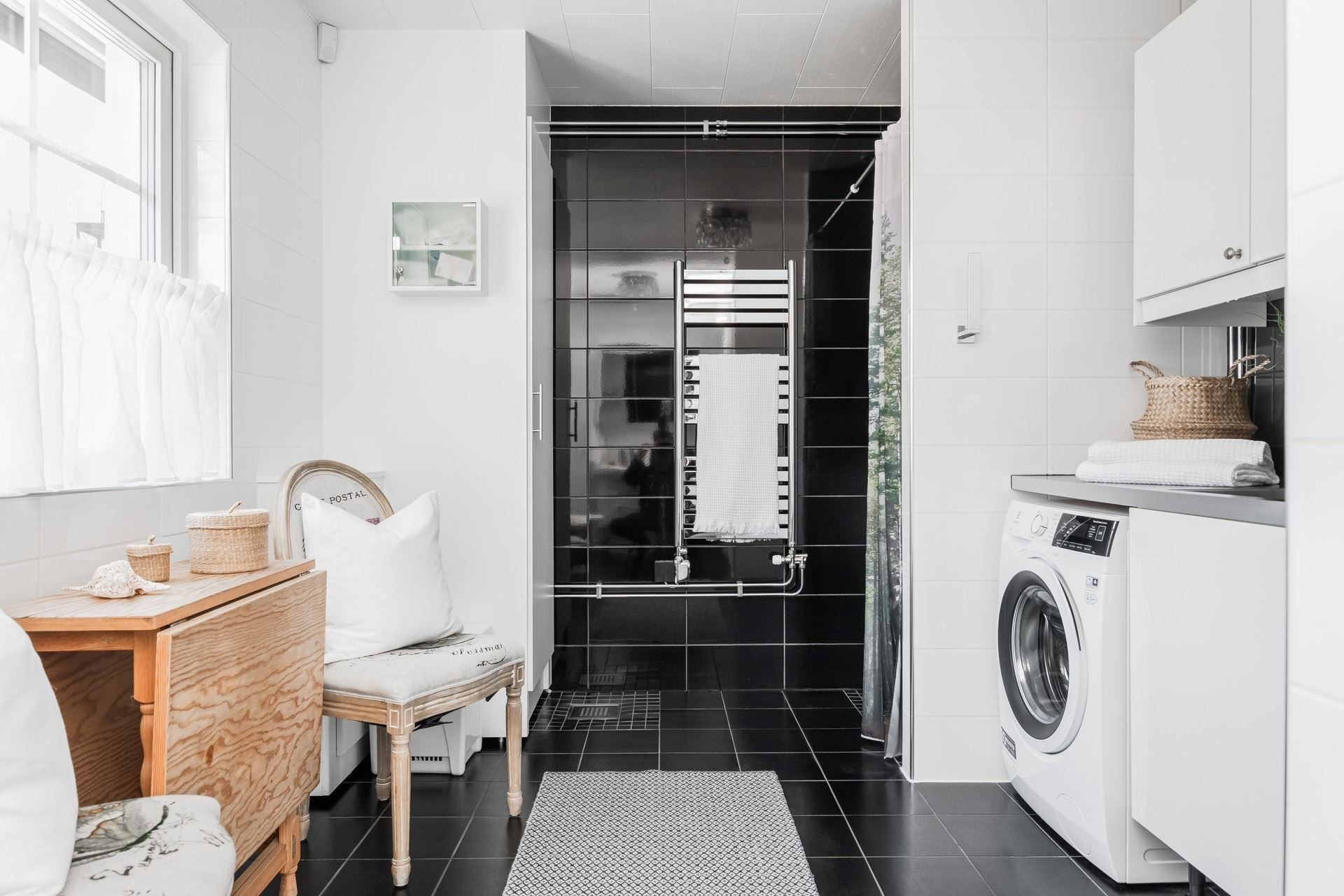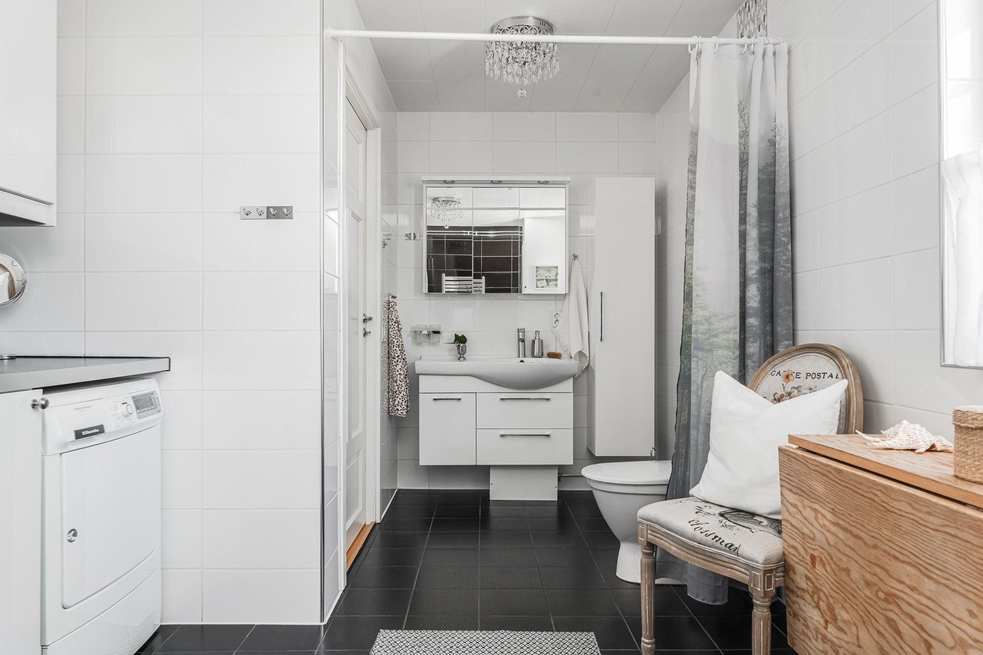 Badrummet med kombinerad tvättstuga är stilfullt inrett med kakel och klinker samt generösa ytor. I det fristående gästhuset intill entrén finns extra sovrum, gott om plats för hemmakontor, bastu med havsutsikt samt toalett med dusch.